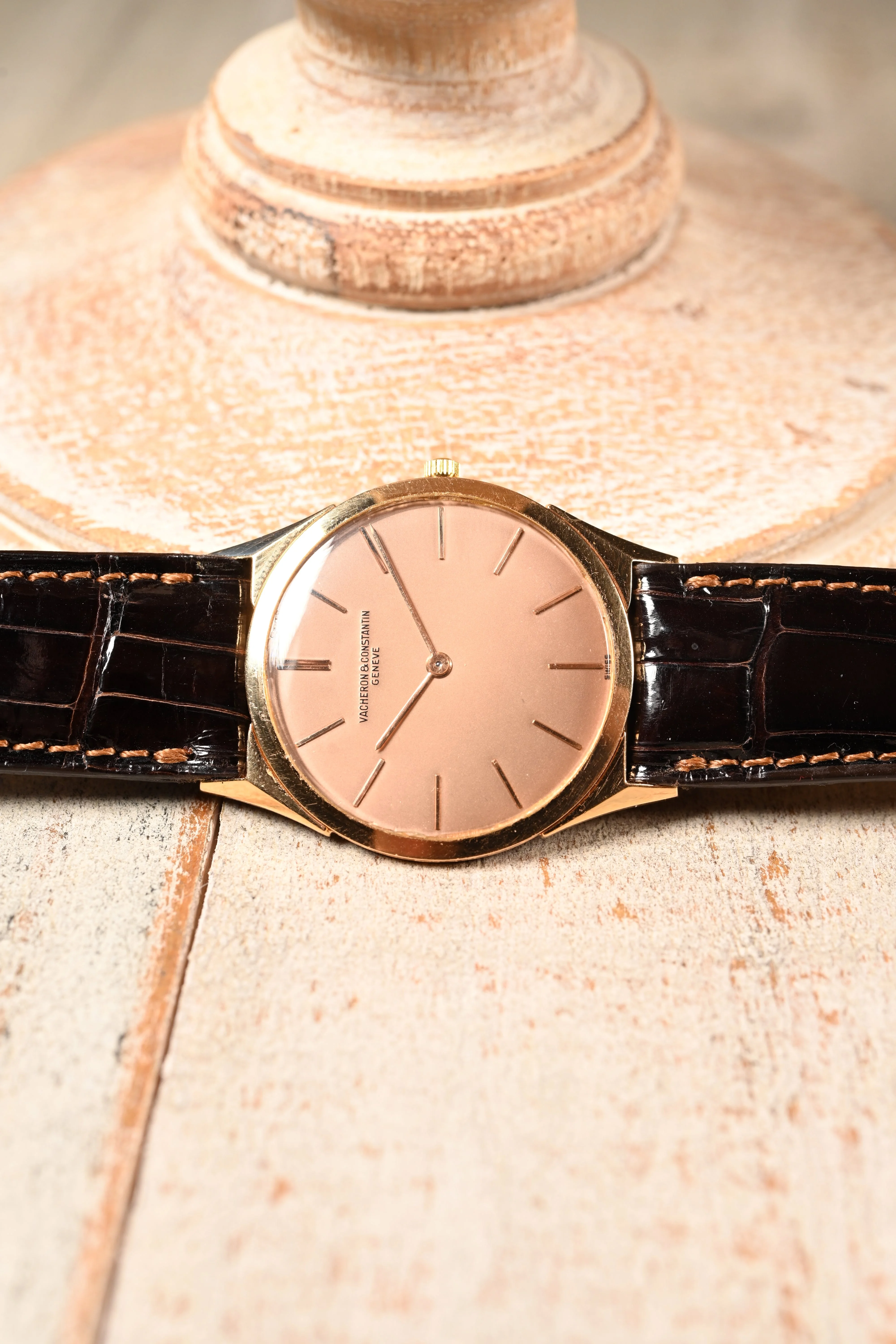 DIAL: An original pink enamel dial complete with raised enamel "Vacheron & Constantin Geneve" Signature. The raised signature is completely intact and pronounced. The dial exhibits no signs of cleaning. There is one very faint, small dot near the 6 o'clock hour marker than can be seen during certain lighting and viewing angles.