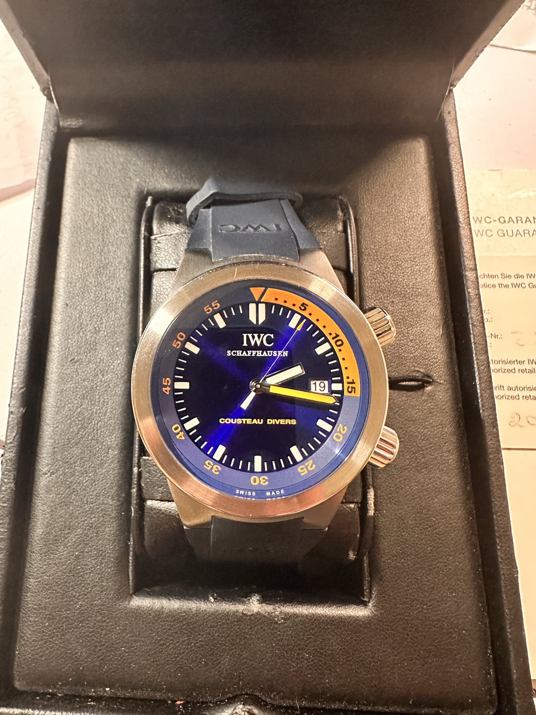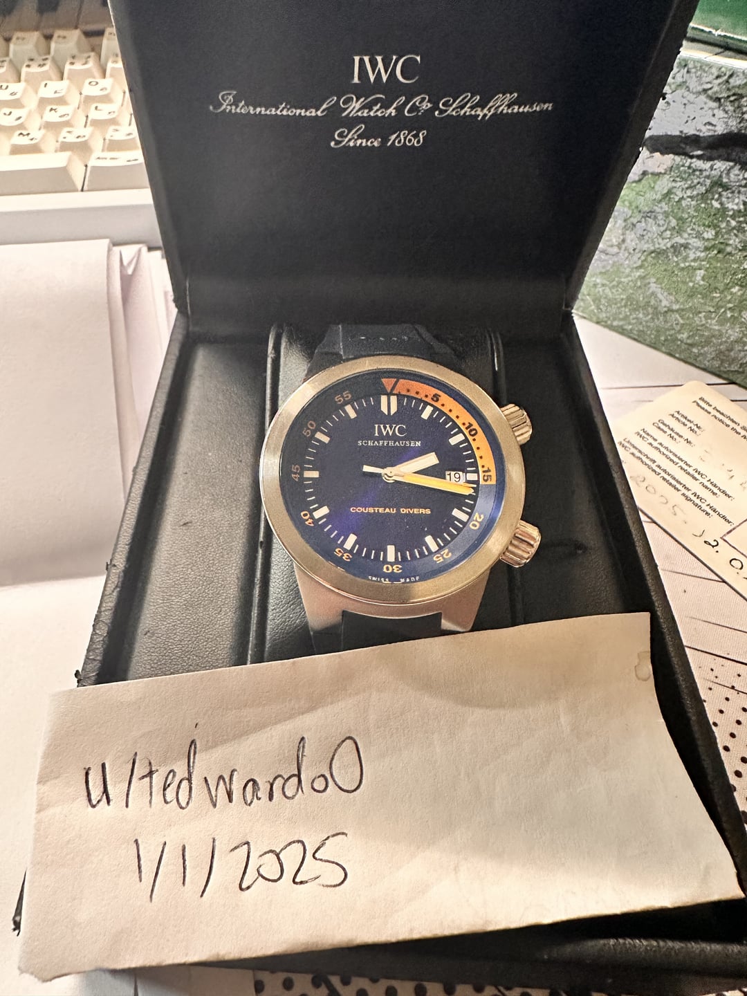 Hey r/Watchexchange, Up for sale is my **IWC Aquatimer Cousteau Divers IW354806**, a limited edition of **1,953 pieces**. This piece initially caught my eye after seeing John Mayer highlight it in his first video with Ben Clymer, and it's been a gem in my collection ever since. Currently selling my collection to fund a larger piece. # Details: * **Purchased**: Rolexforums (Early 2022) * **Service**: Full movement service + polish on **June 25, 2022** * **Replacements**: Second hand, hour & minute hands, and sapphire crystal replaced during service * **Condition**: * **Case**: Excellent, minor scratch between the 11 and 12 markers * **Strap**: Rubber strap in great condition * **Clasp**: Excellent condition # Package Includes: * Original **box and papers** * **Guarantee card** (Dated February 2005) * **Proof of service** This is a rare and well-preserved piece, ready for a new home. I'm happy to provide additional photos or details upon request. **Price**: 4600 + shipping. Add 3% if using paypal F&F **Shipping**: Will ship fedex insured 2-3 day shipping **Location**: Central New Jersey Let me know if you have any questions or want to see more pics! Cheers!
