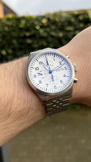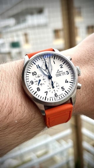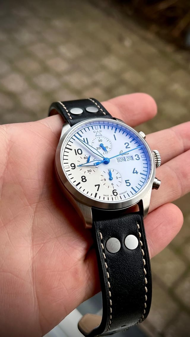 Brand and model: Laco Kiel.2 Chronograph Diameter: 43mm Age: 12-12-2023 Invoice and/or certificate: Invoice from Laco and certificate Original box and/or any accessories: Full set, everything present Shipping costs or collected: Both possible Condition (scratches, operation, etc.): like new Type of movement and caliber: Modified and doctored Sellita SW500 (Topgrade movement + decorated) Hereby my beautiful Laco Kiel.2 Chrono is up for sale. It’s a full set, everything is included. Both the original Laco steel bracelet and the extra purchased leather pilot leather strap from Laco. Laco will be known to many as a real German flieger watchmaker. Laco makes beautiful models, where you get a lot of value for your money! These hardly ever come on the second-hand market, so for this price a STEAL! This one is also VERY little worn… The leather is not even worn in and the steel strap is like NEW! When putting it together, all extra upgrades were checked, namely: • Upgrade to topgrade movement + Decorated + € 270 • Upgrade to Anti-reflective coating on inside and outside + € 100 • Extra leather strap + € 60 Brings the total to € 2,720, - Price to sell, €1850 shipped within EU. Local pickup possible in Poland / Szczecin.