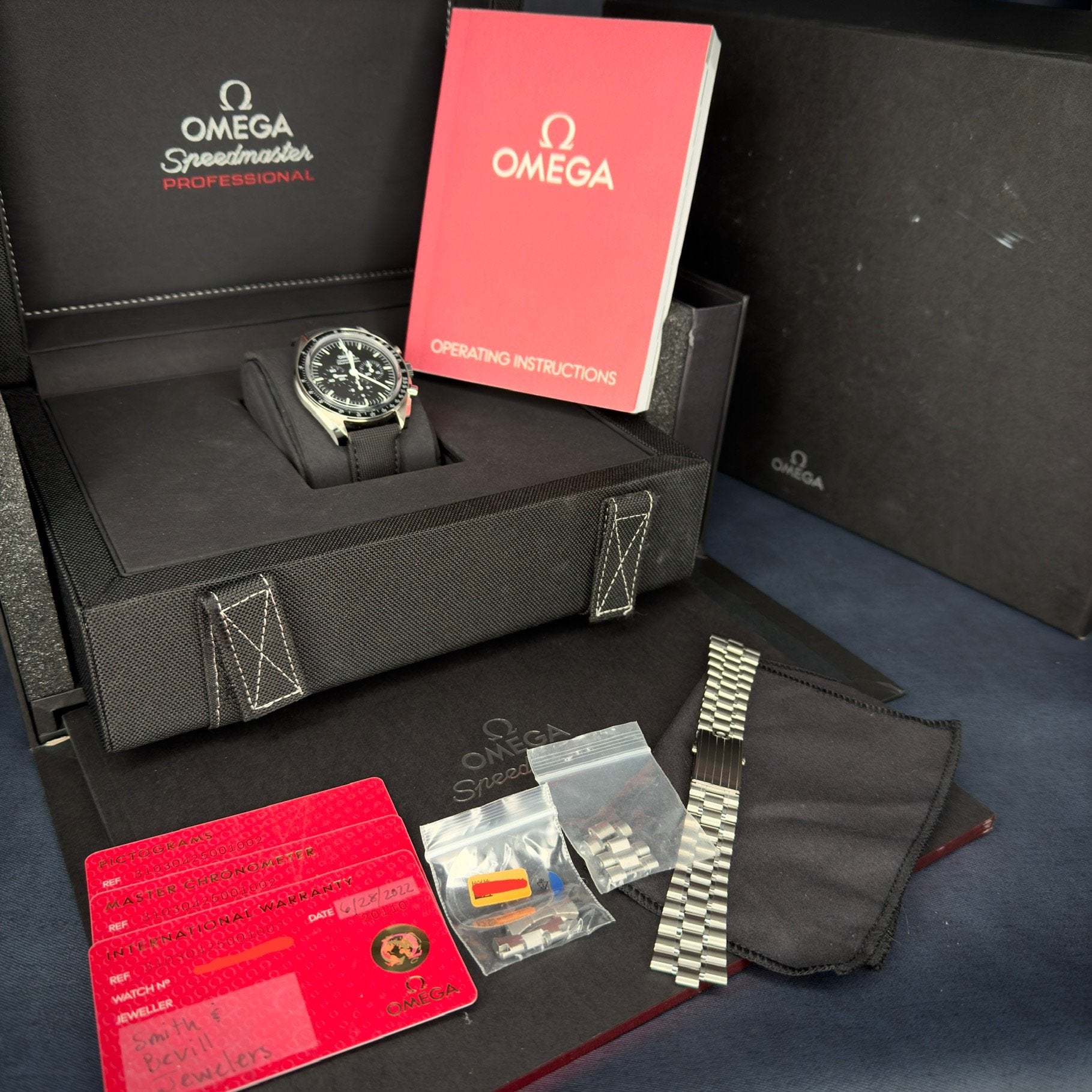 This example comes as watch, warranty card valid through June of 2027, pictogram card, Master Chronometer card, Operation Instructions booklet, extra links and endlinks, the Moonwatch booklet, and an extra Omega nylon strap!