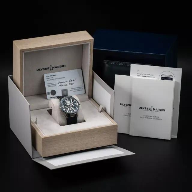 This timepiece comes with its outer box, inner box, leather folio, booklets and warranty card dated March 2021. The Ulysse Nardin International warranty will be valid until March 2026.