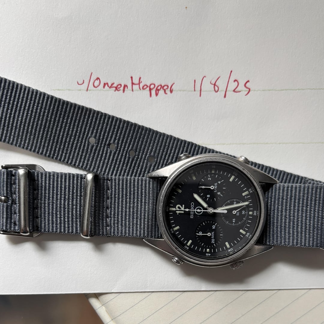 Hi everyone, today I’m selling my Seiko 7A28-7120 RAF pilot chronograph. This is just a straight up cool watch. Made by Seiko for the British Royal Air Force starting in the 80s, this watch from 1988 features the equally cool and collectible Seiko 7A28 quartz chronograph movement which was the world’s first analog quartz chronograph movement, and also utilizes a unique split-seconds function. The top right pusher activates chronograph and the bottom right pusher stops/restarts the chronograph function – just as you would any other chronograph. However, with this movement, pressing this third pusher during chronograph timing acts as a split function. The watch is 37mm wide and 10mm thick, with fixed lugs. The design is a classic minimalist pilot chrono. I do love the “12” at the top of the dial as a bit of a design differentiator. The watch uses promethium lume on the dial and hands, as indicated by the “circle P” right on the dial. Prior to my purchasing the watch, the watch was cleaned, and the battery and crystal both replaced, so this one is running perfectly and looks amazing. On the caseback you can see all of the engravings clearly, with some light polish from years on a NATO strap. Asking for $1100, including US shipping, PayPal or Zelle are best. Please let me know if you have any questions!