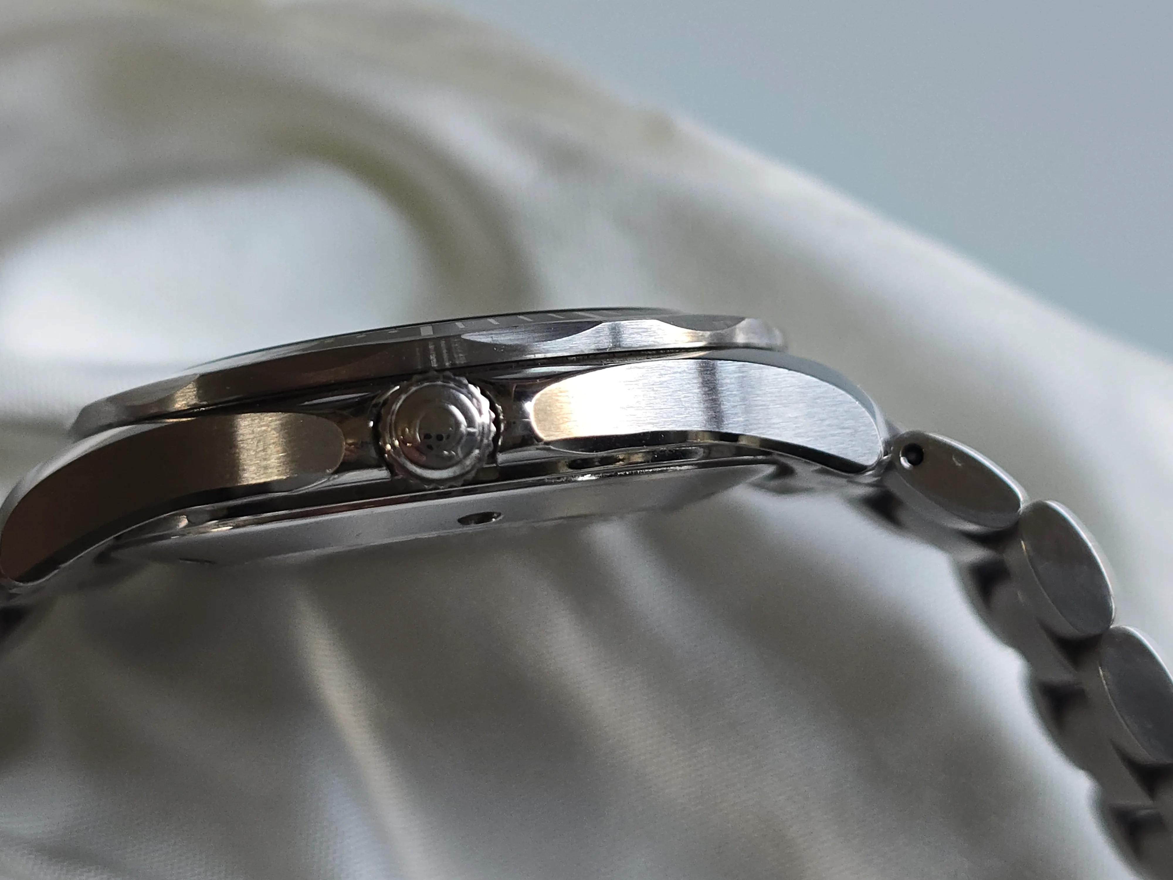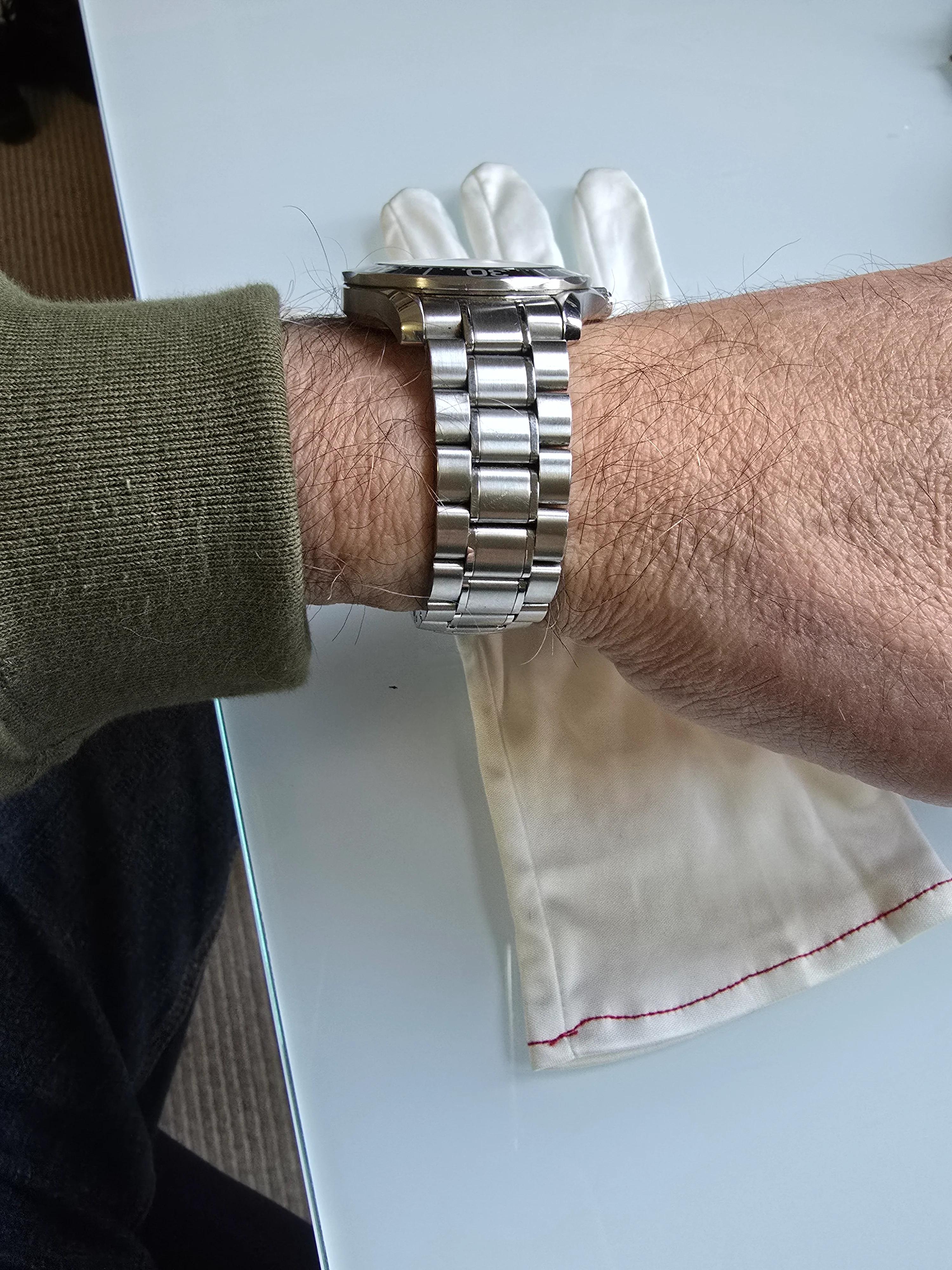 This is a very nice condition watch IMO. There are only a few spots on the case that keep it from appearing unworn. The most visible is a scratch on the caseback, surface scratches on the buckle, tiny nicks on a small section of the bezel edge and an almost imperceptible mark on the brushed edge side. It's not NOS, but it's very nice.