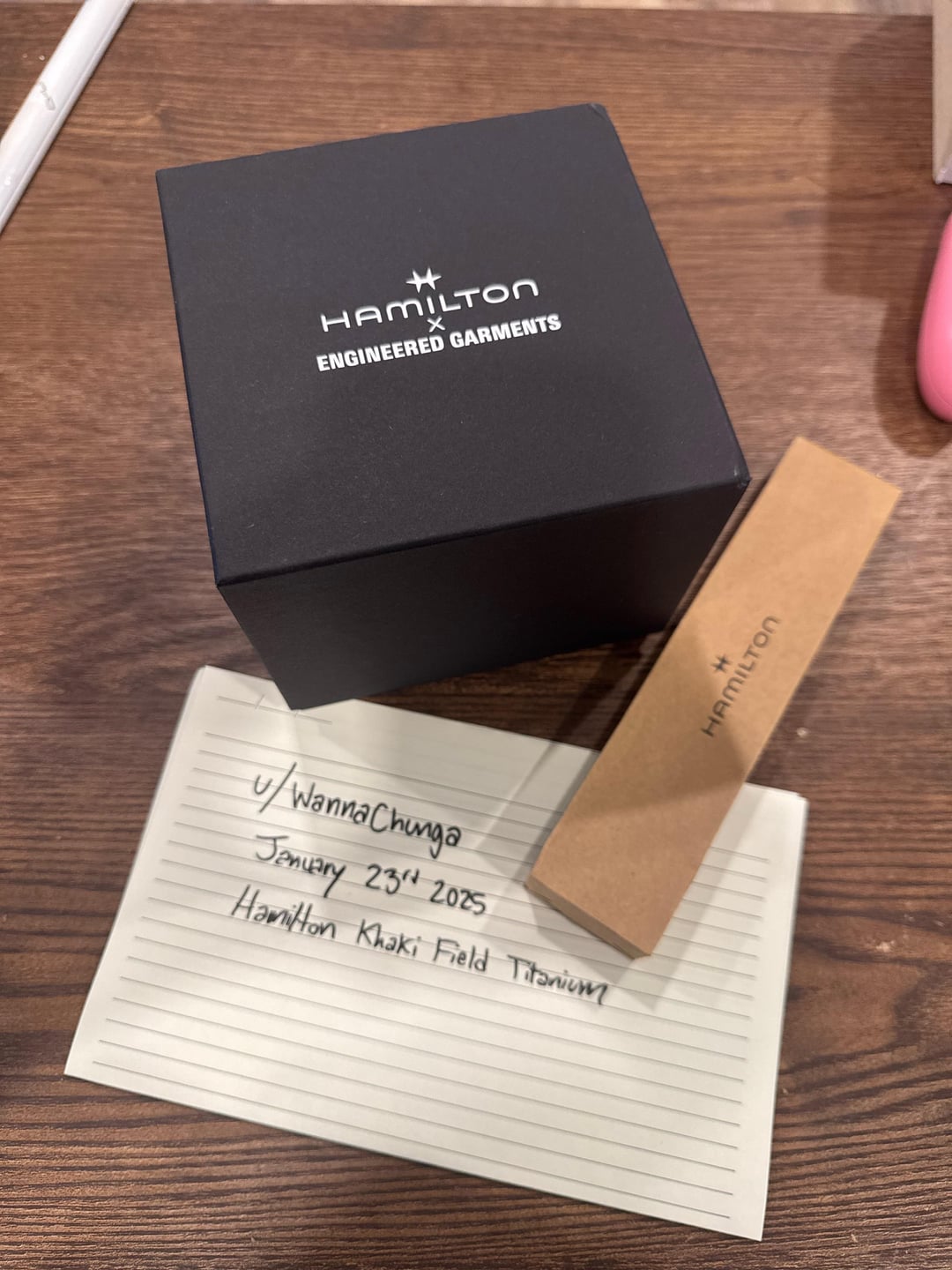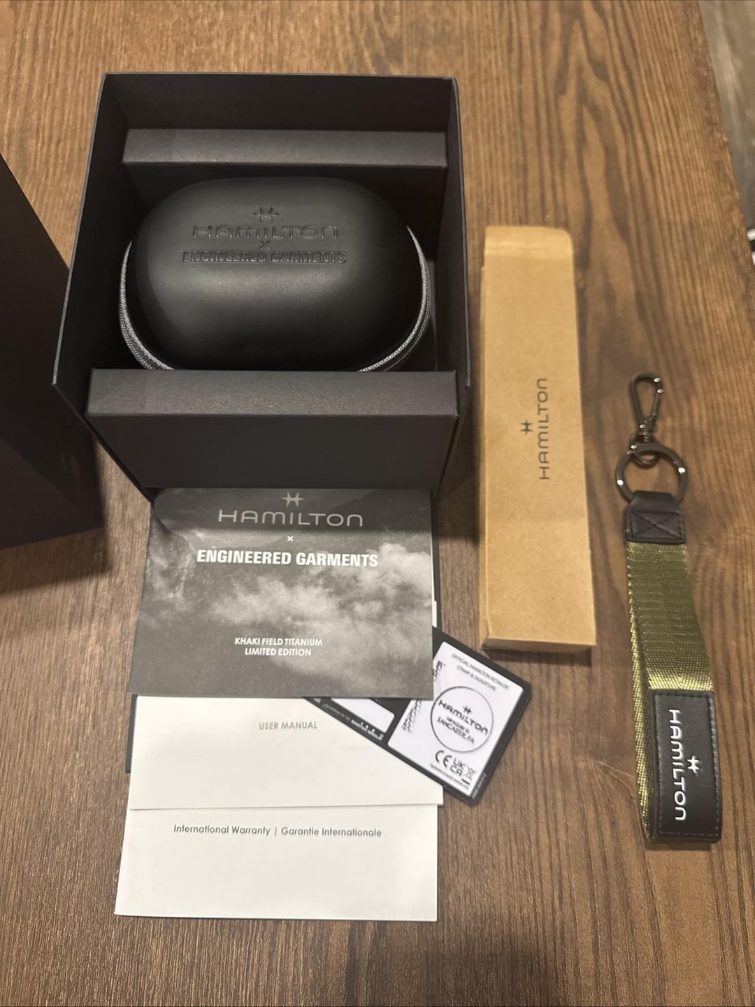 Hello! Up for sale is a used Hamilton H70235130 Khaki Field Engineered Garments 36 mm Titanium Auto Watch. Comes with box, papers and a lanyard from the Lancaster storefront where I purchased it. Excellent take on a minimalist version of a true classic. The watch was purchased in November and worn frequently (as seen by the marking on the clasp). I ended up buying a different watch recently that somehow managed to check even more boxes than this watch does for me. - Please comment before sending inbox. - Please ask any questions you might have. Watch is priced at $1,200 shipped. Watch will be shipped via UPS/Fedex. All sales are final. Payment through Zelle (preferred) and PayPal (F&F only). Interested buyers can ask for custom photos/videos and timestamp. This is my first sale on this platform, but I encourage you all to look at my eBay listing of the exact same watch and my seller history: https://www.ebay.com/itm/256788445936?mkcid=16&mkevt=1&mkrid=711-127632-2357-0&ssspo=ihcvPXSxTVe&sssrc=4429486&ssuid=ihcvPXSxTVe&var=&widget_ver=artemis&media=COPY