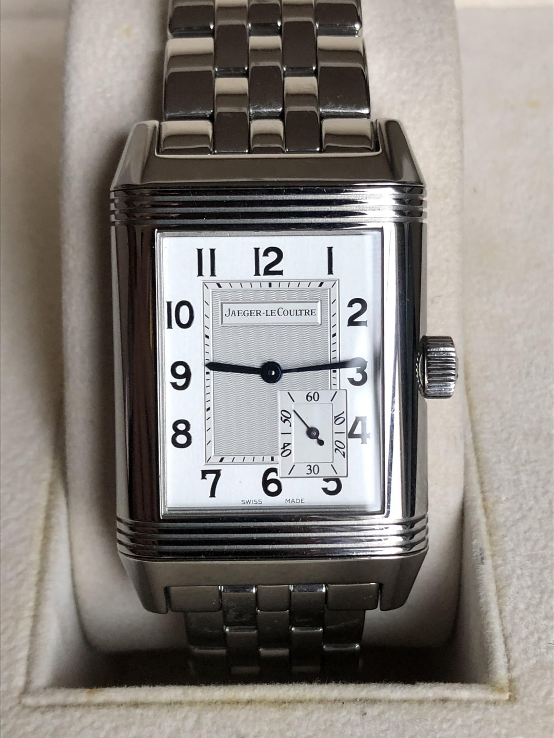 Brand: Jaeger-LeCoultre Model Number: 301.81.20/240.8.14 Box/Papers: Box and Papers Case Size: 29x46.5mm Condition: [Preowned] Very Good Wrist Size: 7.25” Images: https://imgur.com/a/4xmVQrz Timestamp: https://imgur.com/a/3wT8mlR Description: This Jaeger-LeCoultre Grande Reverso is in very good condition. This watch has been thoroughly inspected and comes with our Timepiece Condition Report. This Jaeger-LeCoultre Grande Reverso features a 29x46.5mm stainless steel case with an 8-day power reserve indicator on the back and is paired with a rare stainless steel bracelet. This is an incredibly rare configuration of a top-of-the-line collector’s reverso, having an MSRP of $14,800 back in 2008. Manual movement powered by Jaeger-LeCoultre Caliber 874. PRICE: $8250 SHIPPED CONUS CONTACT Welcome to Consultants of Time, we understand that buying a luxury timepiece online can be a scary experience but when you’re dealing with us you can rest assured that your concerns are unwarranted. Established in 2018, Consultants of Time is a licensed watch dealer in the state of New York and prides itself in accurately representing products, providing clear communication, fast shipping, and utmost security for both your timepiece and your payment throughout the entire transaction. Please reach out to us with any questions you may have on any watch you see listed here! SHIPPING: Complimentary and fully insured FedEx 2-day shipping within the continental United States. Shipping to Alaska, Hawaii, and US territories at additional cost. Overnight shipping is also available upon request. To ensure maximum security, all orders will be shipped to a local FedEx office for pickup with ID and signature confirmation. Before signing acceptance of the package please inspect the package for signs of tampering and reject acceptance if evidence of tampering is found. AUTHENTICITY All watches that pass through Consultants of Time are inspected by a watchmaker to guarantee authenticity. Additionally, each watch is provided with an in-depth timepiece condition report which details the watch’s condition and movement health. We stand behind every single timepiece we sell, any watch purchased from us is guaranteed to be authentic and exactly as described. INTERNATIONAL BUYERS: No international sales and shipping at this time. *Consultants of Time is an independent luxury watch dealer. We are not associated with and are not authorized dealers of any of the brands we list or sell.