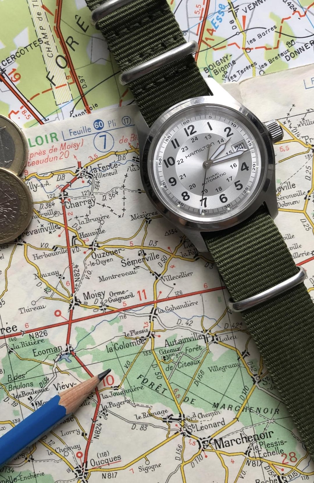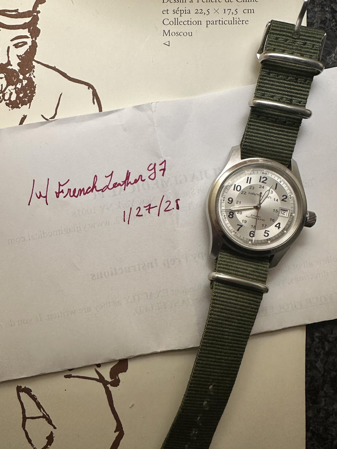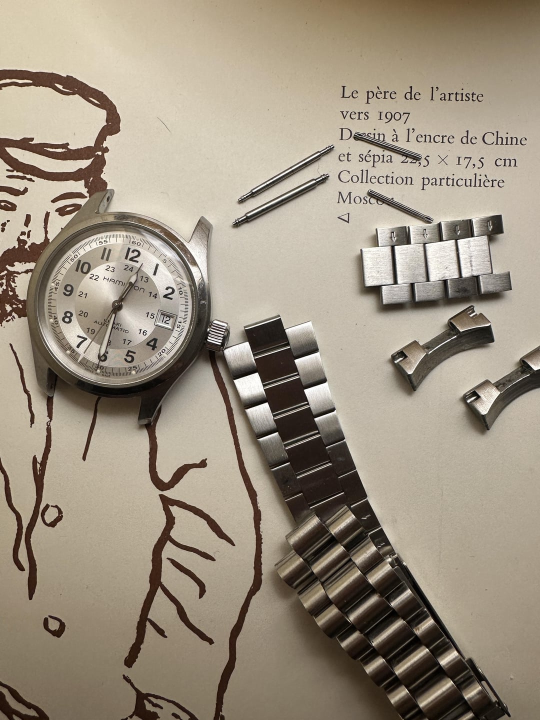 **Model:** Hamilton Khaki Silver Dial 38mm. **Timestamp:** [https://imgur.com/a/hamilton-kahki-3jOQJlM?third\_party=1](https://imgur.com/a/hamilton-kahki-3jOQJlM?third_party=1) Purchased June 2021 at an AD. I no longer have the box and papers after an international move. Comes with the original strap and buckle, plus an Uncle Seiko bracelet (\~$70 MSRP). Can throw in some extra NATO straps as well if you please. # Details: **The Condition**: The condition of the watch is overall very good and it's keeping good time as far as I can tell. There are definitely some scuffs and small scratches across the polished portion of the bezel, which I've tried to capture in photos. The back, particulary around the lugs, also has some scratches. This watch has seen wear, with lots of travel, hikes in the Alps, and camping. It's a really great companion but a bit too big for my wrist. **Movement**: H-10 **Dimensions:** Case Width: 38mm Case Thickness: 11.4 Lug to Lug: 47mm **Price:** Priced at $430 shipped via paypal. Also would be very interested to trade for a 33-35mm Hamilton Khaki from 60s-90s. GG-W-113, MIL-W-46374B, etc. and will add cash