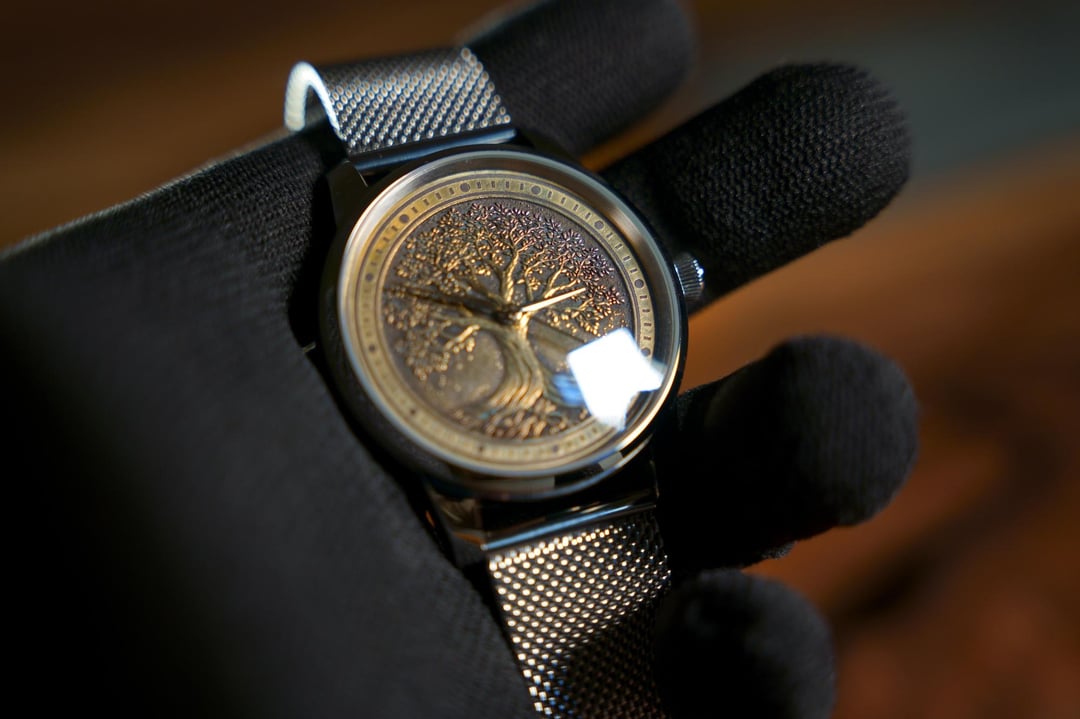 **\*NEW\* 1-of-1 3D bronze dial lasered with 256 layers, hand finished with brass black and polish.** **Photos**: [**https://imgur.com/a/7GlS1nO**](https://imgur.com/a/7GlS1nO) Dial has amazing light play. Unfortunately, very difficult to capture in photos. The bronze dial is more of a warm gold than it is brown in some of the photos. I’ve included a video, but Imgur’s compression washed it out completely. I created this Tree of Life image. It is 1-of-1 and takes about \~100 minutes under a laser to achieve. The watch was created by a fellow forum member; it was received yesterday. This is a catch-and-release \*AT COST\*, as I am currently working on a new project with him. **Condition**: Brand new with stickers. **Size**: 35mm dial. 39mm stainless steel case. 12.5mm thickness. **Movement**: Seiko NH38 automatic with 41+ hour power reserve, hacking, 24 jewels. **Glass**: Domed mineral, beautiful vintage look. **Caseback**: Open with gold-color adorned rotor. **Bracelet**: Super-fine mesh Milanese bracelet from StrapCo. Quality, very comfortable. **Includes**: Travel watch pouch for safekeeping. **Price**: FIRM, AT COST. $355 USD shipped to CONUS and Canada. Ships from Canada within 24 hours. NO CUSTOMS DUTIES/BROKERAGE. **Payment**: PayPal, Wise, E-transfer, or Cash (for local pickup).
