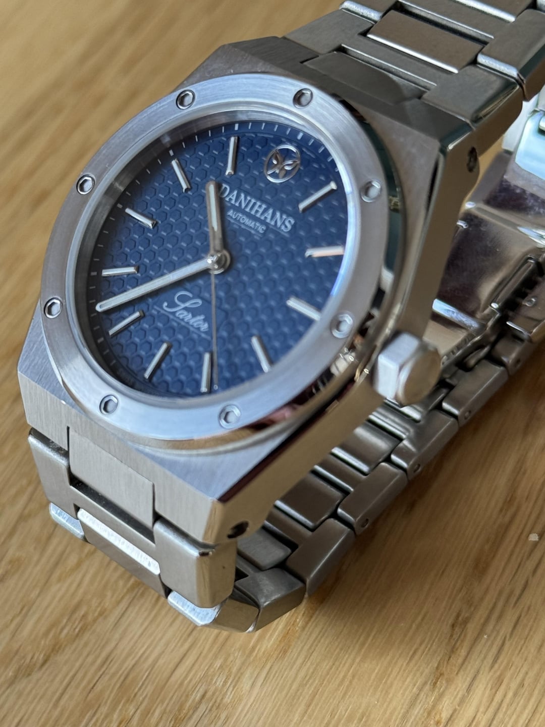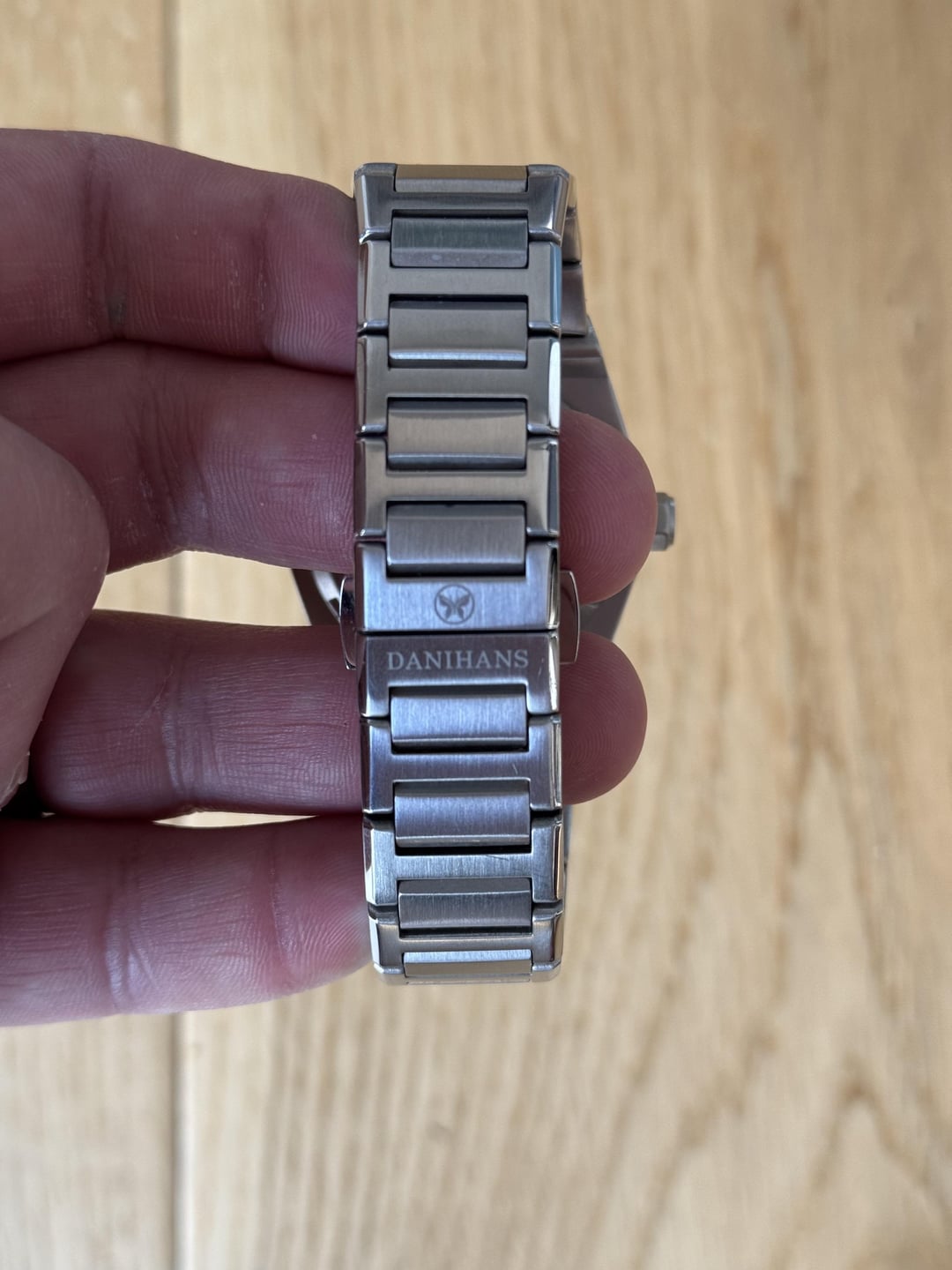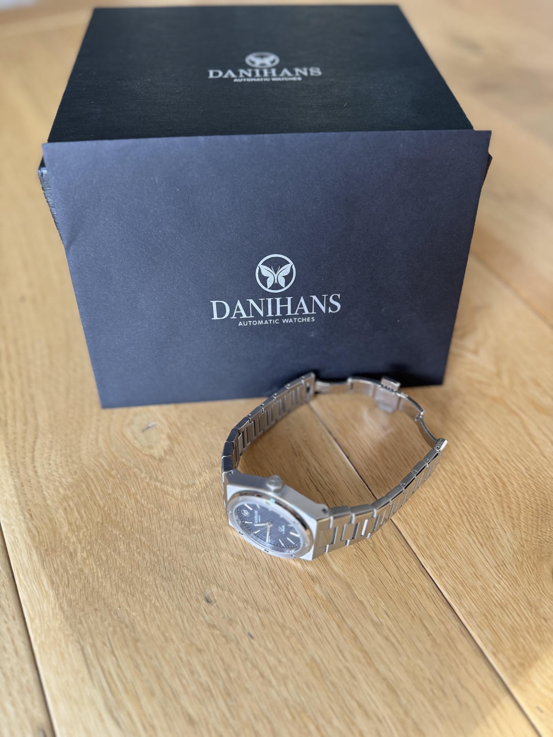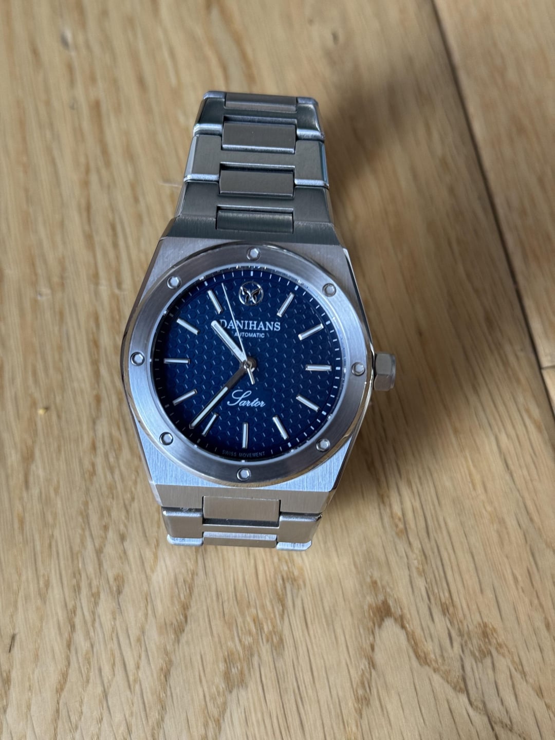 Hi watchex, This is the Danihans Sartor. It is a micro brand from Italy. It reminds me of a blend between vintage IWC ingeniuer’s and of course the royal oak! It has a polished chamfer that goes all the way down the whole bracelet like the royal oak. This is a 39mm case Blue Dial Sellita SW-200 movement Water resistant to 200m No date-but does have the ghost position when pulling out the screw down crown to set the time The bracelet tapers dramatically which is nice and has a butterfly clasp. This is a full set and comes with all links and a half link. It is in really good condition but has a few hairlines here and there. Here’s the there website: https://danihanswatches.com/ YouTube video (use English captions): https://youtu.be/fpmS8cve1vg I’m asking $400 shipped Zelle, CONUS