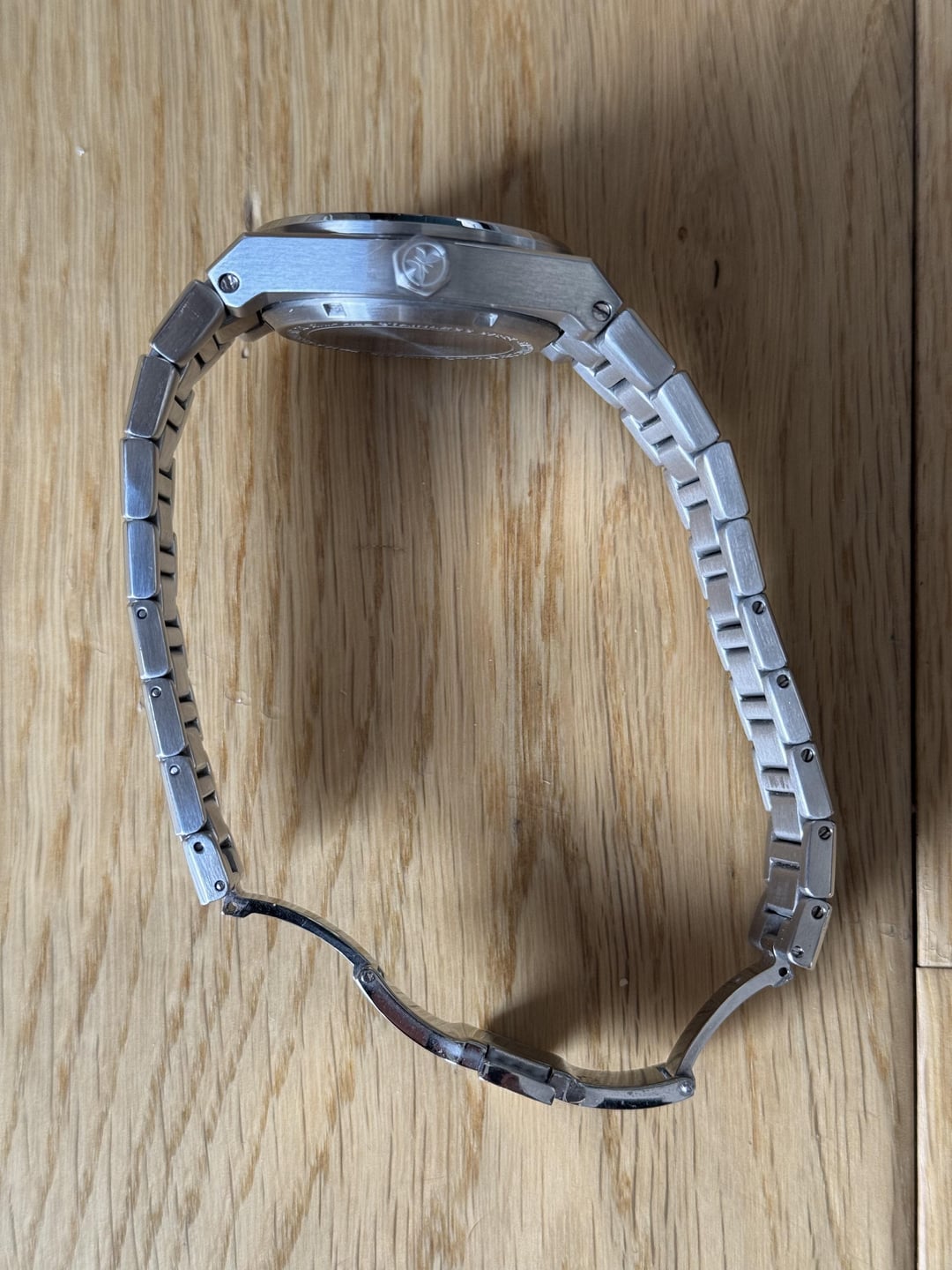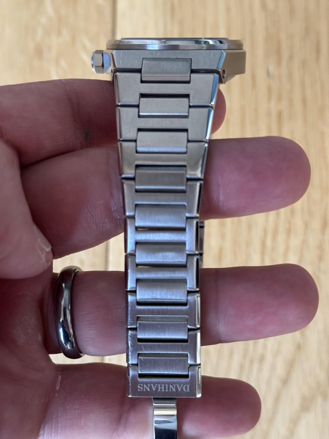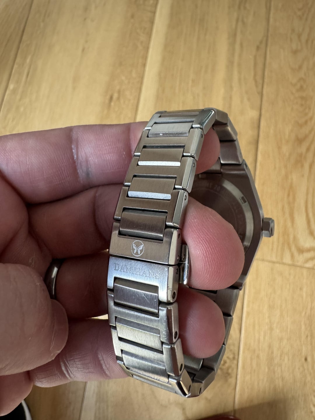 Hi watchex, This is the Danihans Sartor. It is a micro brand from Italy. It reminds me of a blend between vintage IWC ingeniuer’s and of course the royal oak! It has a polished chamfer that goes all the way down the whole bracelet like the royal oak. This is a 39mm case Blue Dial Sellita SW-200 movement Water resistant to 200m No date-but does have the ghost position when pulling out the screw down crown to set the time The bracelet tapers dramatically which is nice and has a butterfly clasp. This is a full set and comes with all links and a half link. It is in really good condition but has a few hairlines here and there. Here’s the there website: https://danihanswatches.com/ YouTube video (use English captions): https://youtu.be/fpmS8cve1vg I’m asking $400 shipped Zelle, CONUS