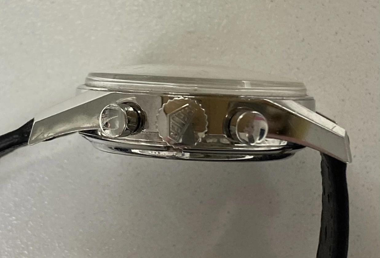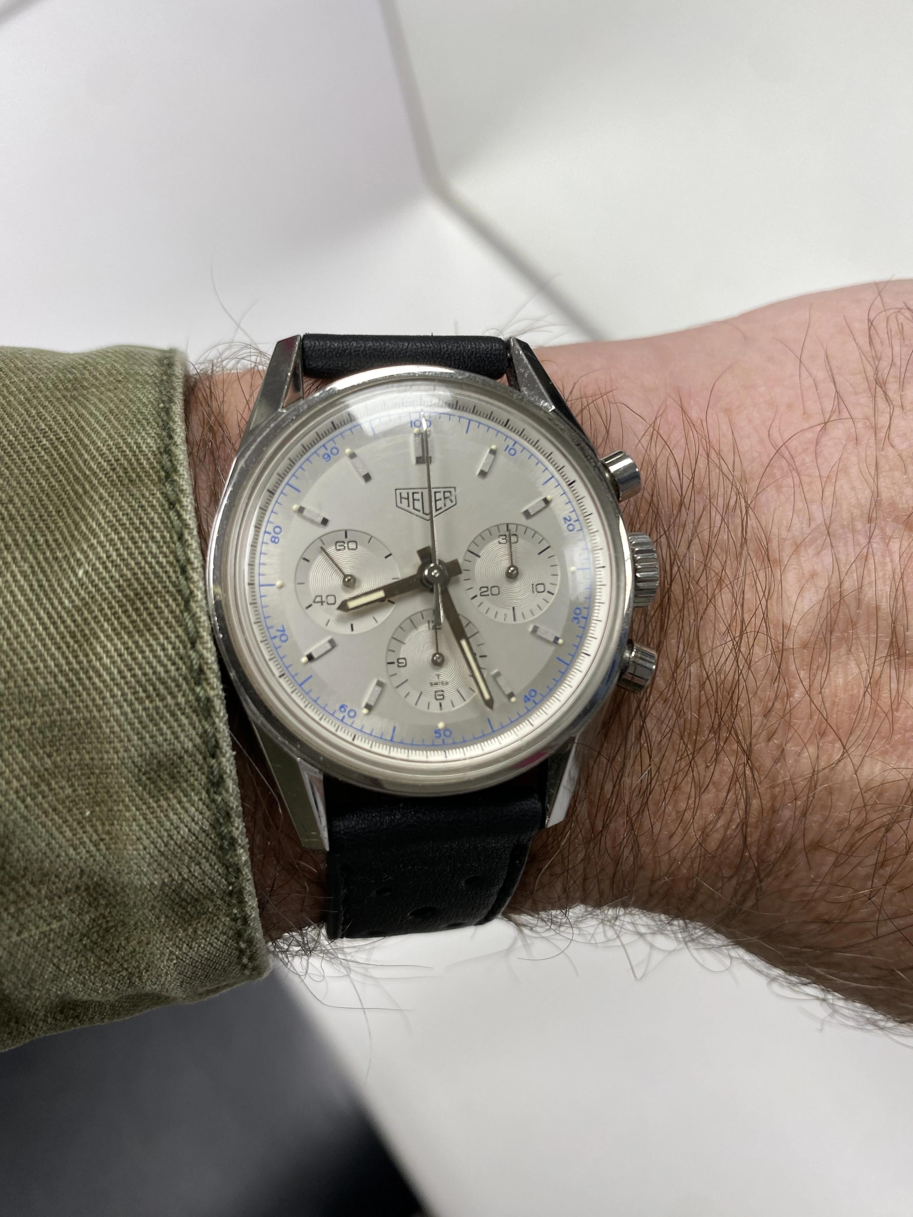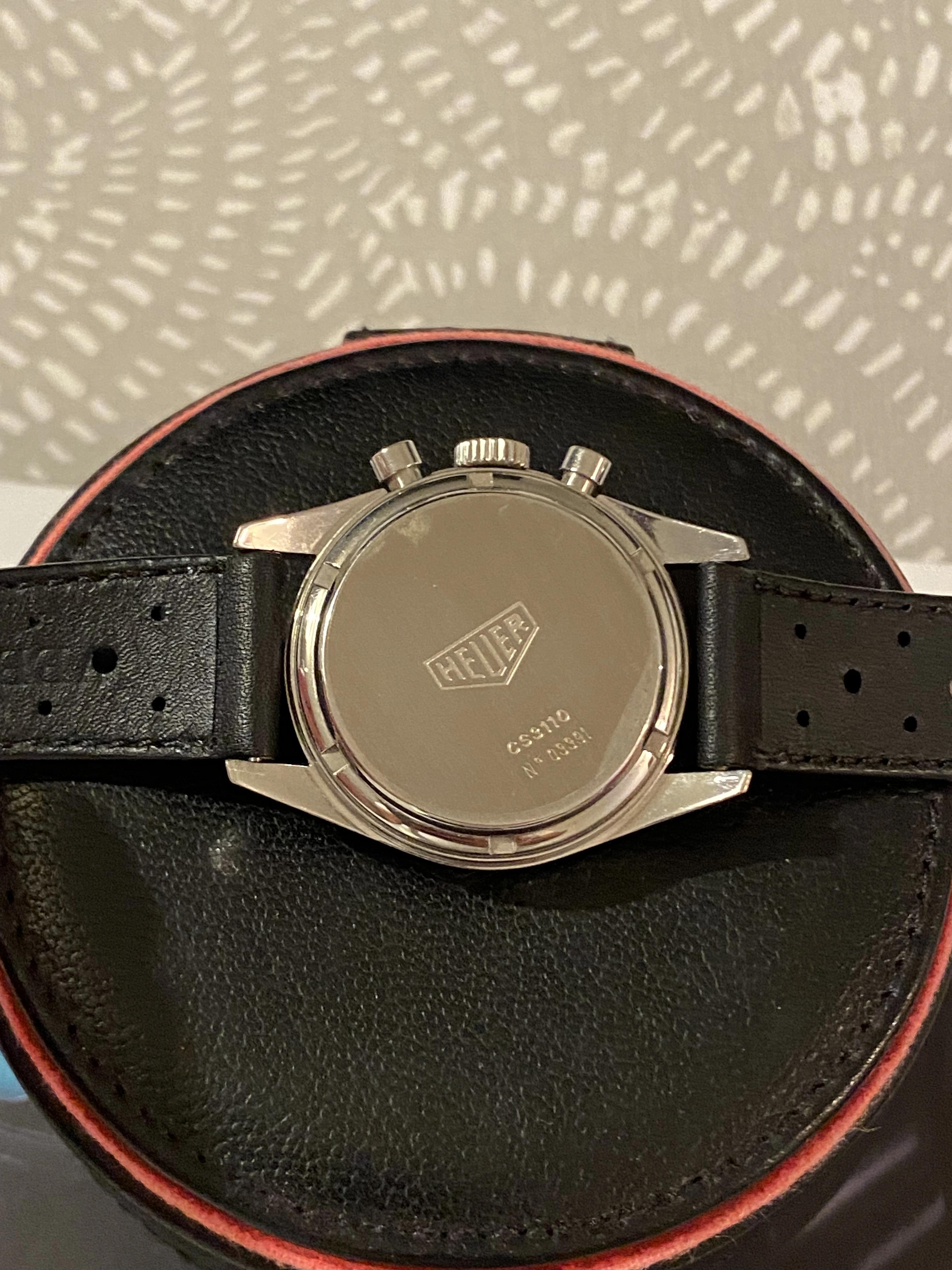This is the stunning late 90s re-edition of the famous 1960’s chrono. Using the same 36mm case dimensions as the original with 18mm lugs, plexi crystal but with the legendary Lemania 1873 movement (of Omega Speedmaster fame). If you have a sharp eye, the only visual difference from the 60s original is the lack of the Word Carrera on the dial. The watch comes with inner and outer boxes and card, eBay authentication and appears unpolished with some fine hairlines commensurate with its age and its original Heuer buckle on a lovely newer leather strap. Timekeeping and chronograph working as expected. A truly lovely watch and incredible value. £2850 gbp via bank transfer. No returns.