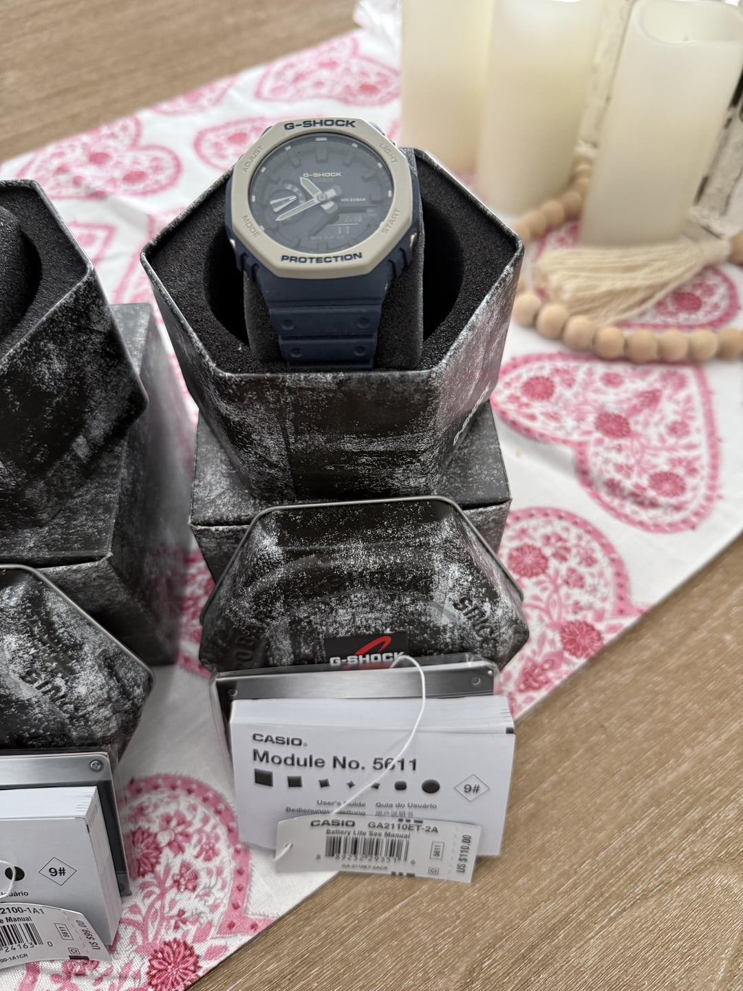 Up for sale today, my 6 different GA2100 series g-shocks. 2 are unworn and never removed from plastic packaging. The other 4 have been worn occasionally by me. All of these were purchased by me from the Casio website. The ones that have been worn are shown unwrapped in the photos and show light signs of wear on the rubber straps. There are no scratches on the glass or bezels on any of them. They all come with everything they were packaged with from Casio including hang tags, inner and outer boxes, books, foam and original plastic bagging. All working and keeping good time/date. GA-2110ET-8A Grey/Grey (never worn) Price $70 GA-2100-1A1 Black/Black Price $60 GA-2110ET-2A Navy/Grey Price $60 GA-2100SU-1A Black/Camo Bezel Price $60 GA-2100CA-8A Black Camo/Black Bezel Price $60 GA-2100-7A Stormtrooper (never worn) Price $70 Prices are firm with shipping included CONUS. PayPal F&F or Venmo. Thanks for looking! Let me know if you have any questions.
