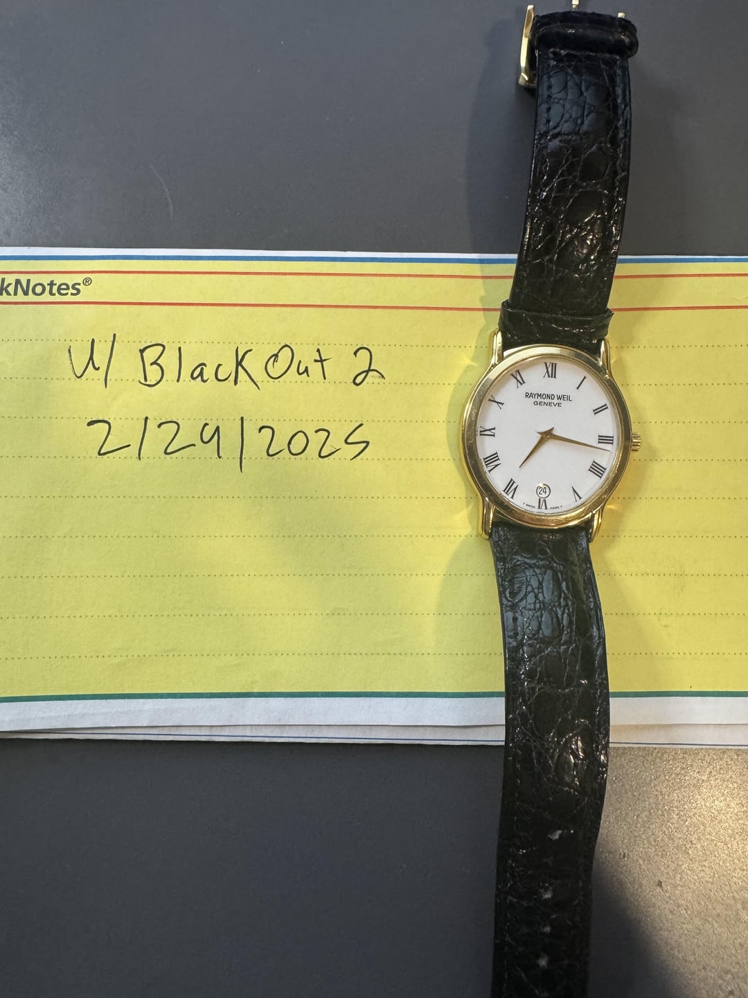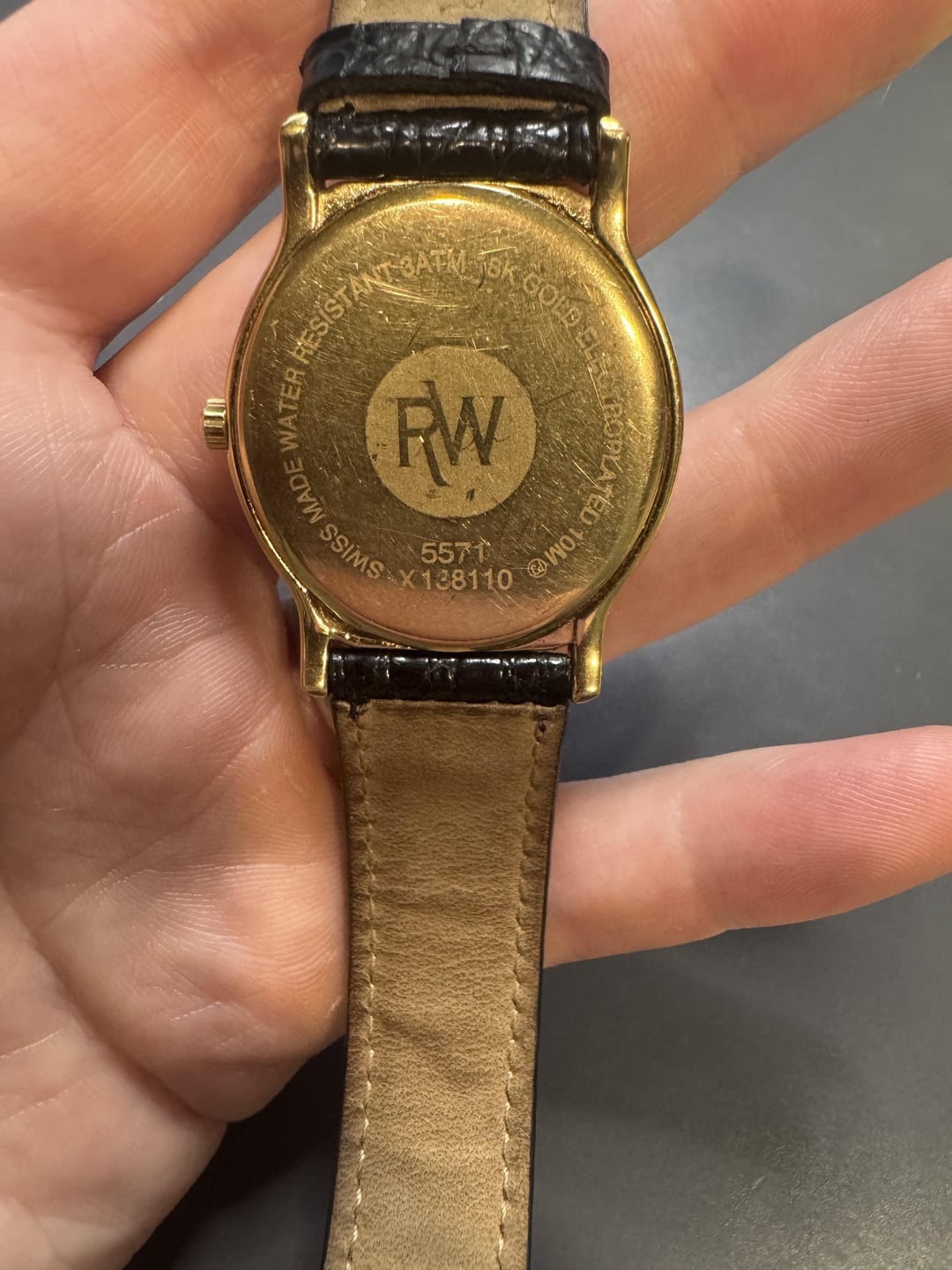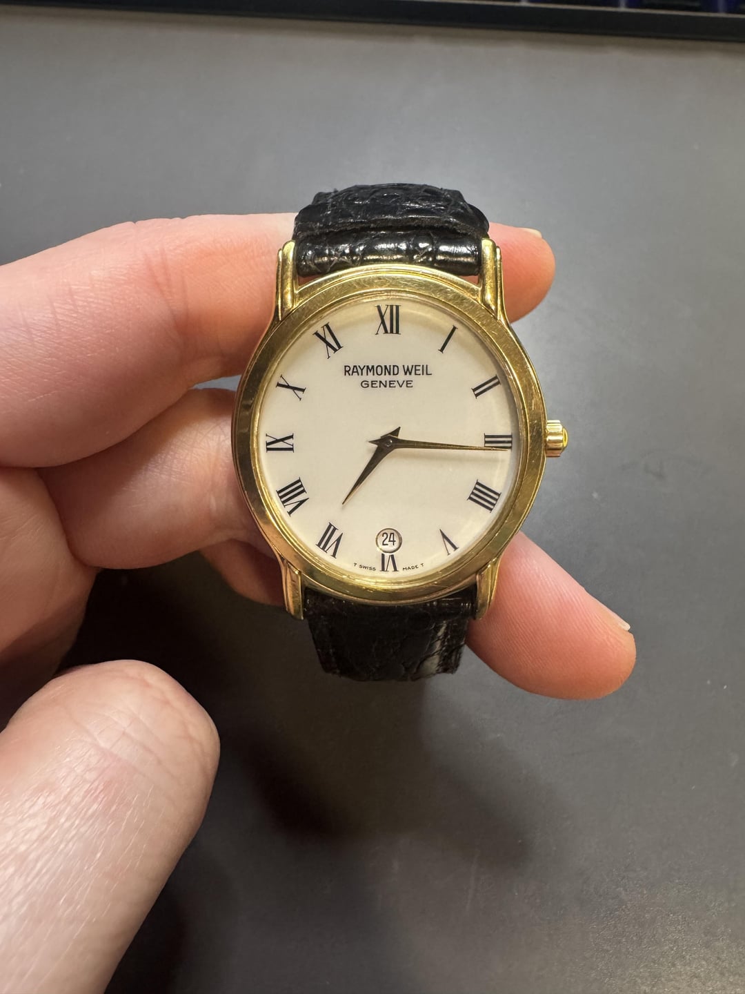 Hello r/watchexchange Selling my old Raymond Weil dress watch. This is an 18k gold plated, quartz powered oval, measuring 35 mm tall and 32 mm wide, with a lug to lug of 40 mm. I believe the band is still the original (was a hand-me-down from my dad). Watch is in used condition, but nothing more than minor wear to the case - the face is in perfect condition. You can see the wear on the reverse photo. Brand new battery has been installed. While I am new to r/watchexchange, I have several successful transactions on r/golfclassifieds (my other expensive hobby) you can find in my post history. Happy to answer any questions. Asking $125 shipped. Accept PayPal (g&s, as recommended by the mods), Zelle, or Venmo.