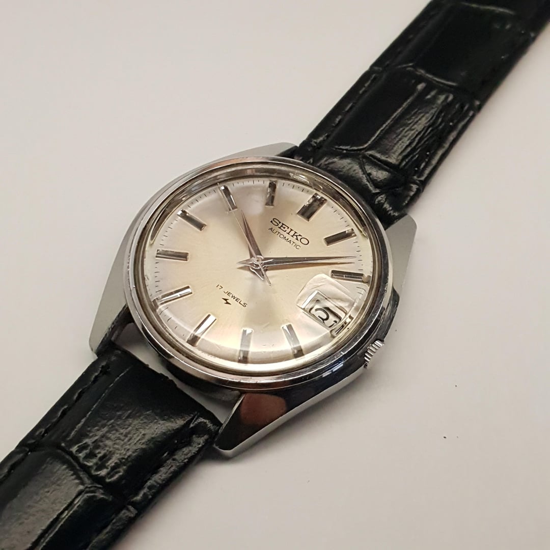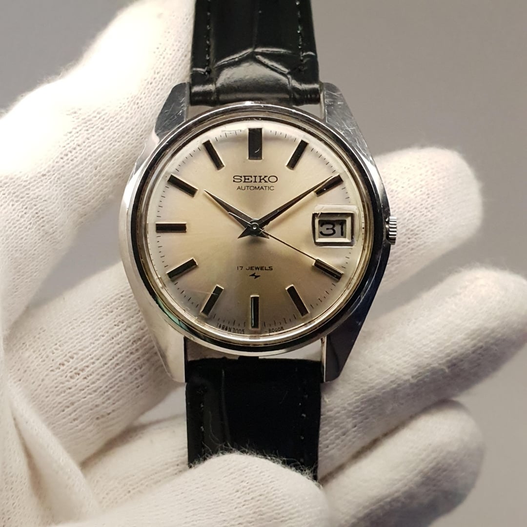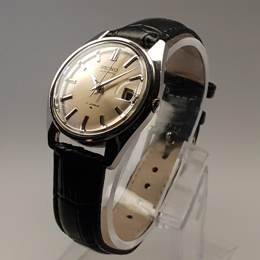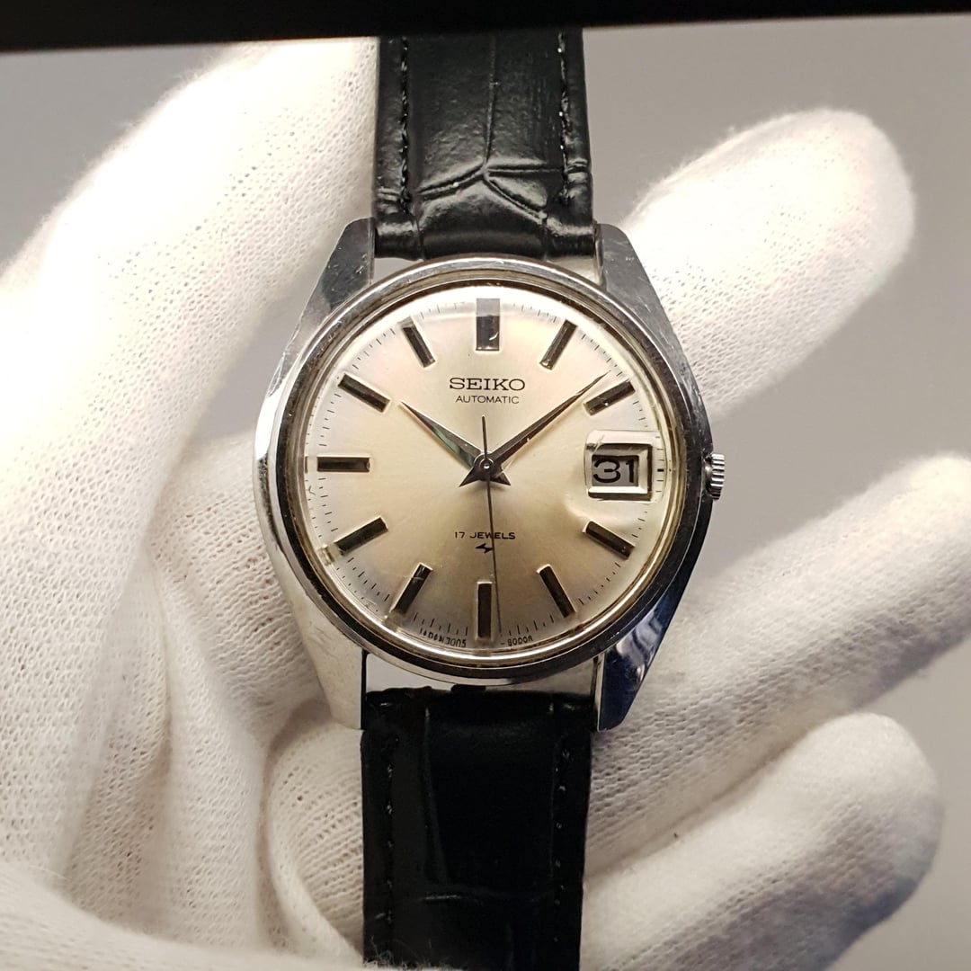 For sale is this vintage Seiko 7005-8000 Automatic made in Japan in December of 1970. The star of the show is this beautifully patinaed/tropical dial which was once a silver sunburst but over time has become a lovely light rosé from the middle. It has classic Seiko design even akin to Grand Seiko case design as well as sharp dauphine hands. It houses the calibre 7005 which is considered very robust and a workhorse movement. Typical of the 70s, it has a cyclops over the nicely framed date window. Japan-made in the Daini factory at the time of the fierce rivalry with the Suwa factory - proudly sports the Daini factory logo on the dial as well as large on the case back. On the topic of the case back, "Waterproof" is written on the back before it became illegal to write that (all watches are not waterproof past a certain depth hence why they now have to put "water resistant" to the rated depth). Under a centimetre thick, decent for an auto. Original crystal, original finish. Good condition for its age, general wear, a few scratches on the crystal. Strap also barely worn but not brand new. Dimensions are: 36mm x 41mm x 9.8mm Lug width 18mm Looking for $200 OBO (Buyer pays Paypal fees 4.5%+$0.30) International Tracked Shipping included in price More pics: [https://flic.kr/s/aHBqjC3Pbe](https://flic.kr/s/aHBqjC3Pbe) Bought in Japan. \*Returns accepted but return postage costs are the buyer's responsibility.