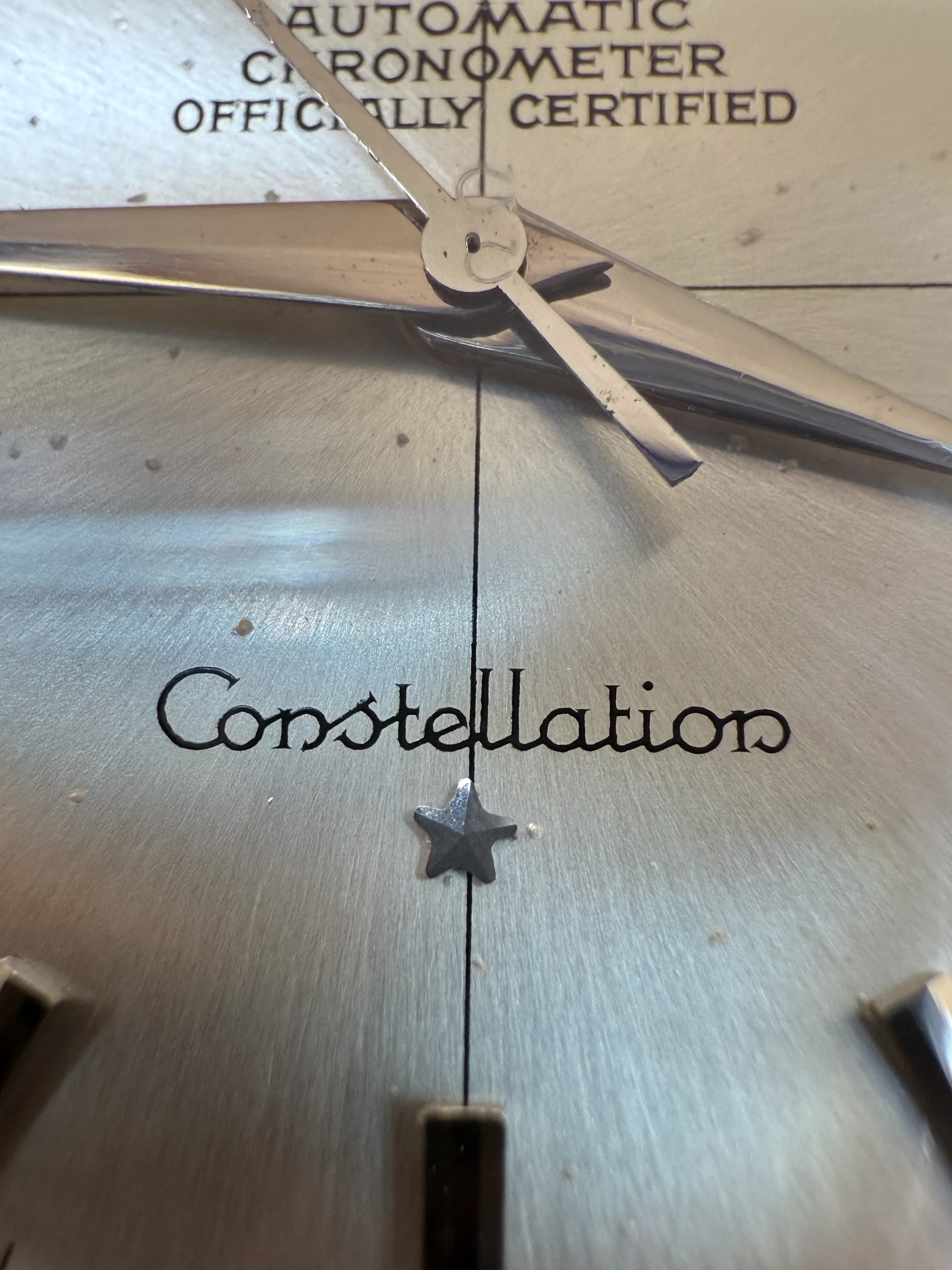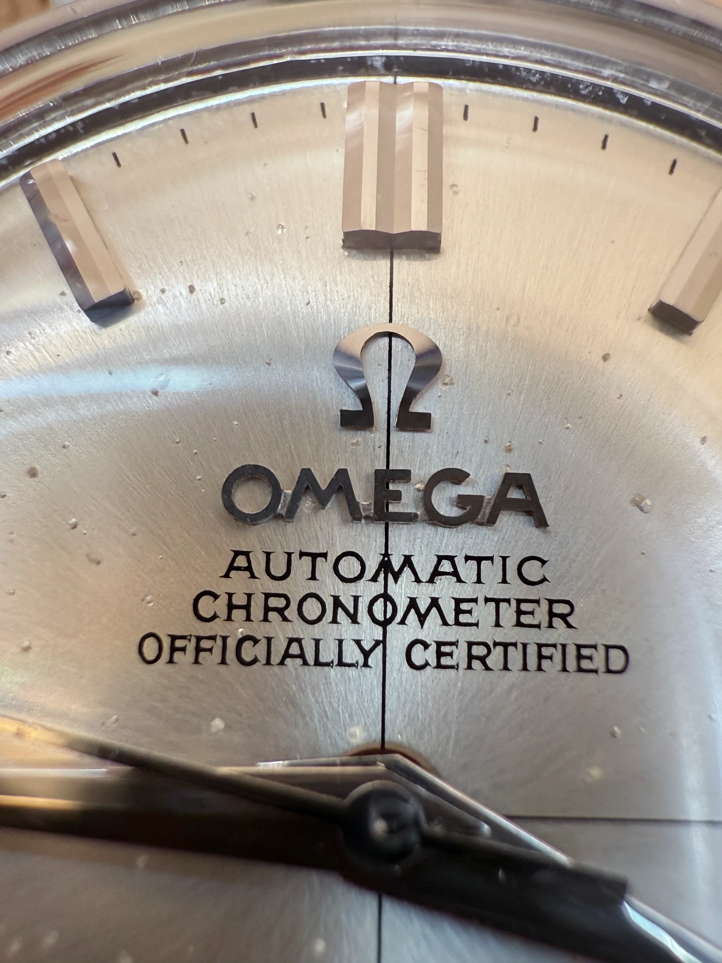- Dial: Original white cross-hair sunburst dial, slightly domed, there are spots on the dial that can be seen in the photos below. Applied Omega logo as well as an faceted date-aperture frame; solid facet hour markers; dauphine hands (hands may be polished before IMO); no lume, no onyx or black paint on hands and hour markers; prints, hands, hour markers are all good.
