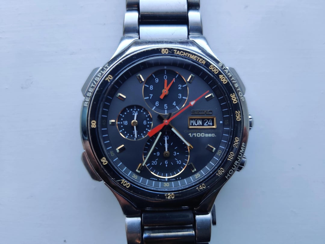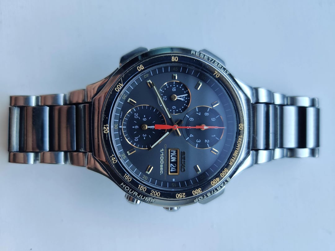 [Video of the mechanism working](https://imgur.com/a/frUPfpY). must see if you're not familiar with these watches. Rare Vintage Japanese market only Seiko Seedtimer 7T59-7A00 Chronograph New Battery put in recently. Fully functional with smooth buttons. Dual-tone bezel and bracelet (Black and silver). Crystal is mint and the bezel has a few micro scratches. Original strap with an upgraded buckle for more adjustments. Stop watch records 1/100s, 1/10s, seconds, minutes and hours (up to 12 hours).10 Bar water resistant. To my knowledge, these were only sold in Japan and were introduced in 1992. Worldwide shipping available, free postage for UK&Europe. Also listed it on eBay, DM me and I will offer the same price there. Now with 20% off, asking for 190£ ( approximately 239$ or 230€) or closest offer. Any questions feel free to ask :)