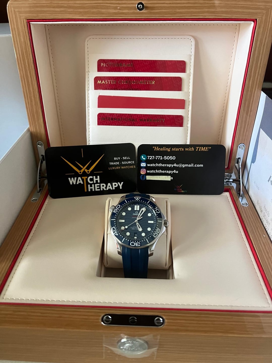 **F/S: Omega Seamaster 300M Diver Blue Wave on Rubber 2024 Ref. 210.32.42.20.03.001** **\*\*Admins: this is a different watch than the one sold 3/2/25, TY.\*\*** **Specs:** \* Beautiful blue dial and blue ceramic bezel \* Self-winding \* Size 42mm \* Rubber strap w/tang buckle \* 300M Water Resistance \* 55-hour power reserve \* Caliber 8800 movement **Includes**: All three cards, boxes, card holder, booklet, bag and copy of the original receipt (2/24 that matches the serial number) from Reeds, which you will need as Reeds doesn’t date their cards. **Condition:** Great pre-owned condition a few hairlines on case, lugs and clasp, no chips on crystal and bezel insert is clean. **Price: $3,799.00+ Shipping (Insured FedEx) in Con US to your local FedEx location**. I am also open to a face-to-face public transaction in or around the Tampa Florida Region, within reason. I have many strong and viable references within Reddit and from Buy/Sell/Trade Watch Facebook groups. Always willing to jump on a call or meeting link to show you the watch. Thank you and please reach out if you have any questions or concerns. Florida residents may be subject to sales tax w/o a valid resale cert. ***No Trades, TY*** **Location**: Tampa Florida **Payment:** Zelle or Wire Timestamp: [https://imgur.com/a/iHV3pQf](https://imgur.com/a/iHV3pQf) IG: [u/watchtherapy4u](https://www.reddit.com/u/watchtherapy4u/) FB: Watch Therapy Timepieces