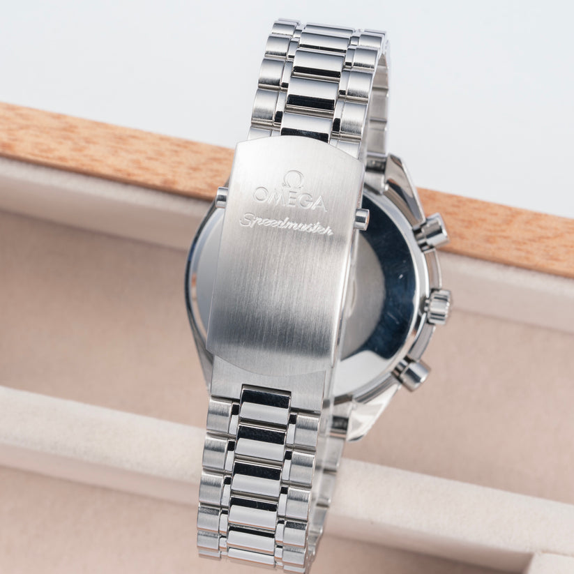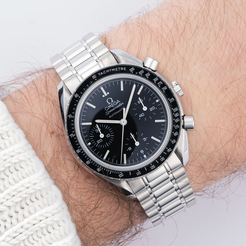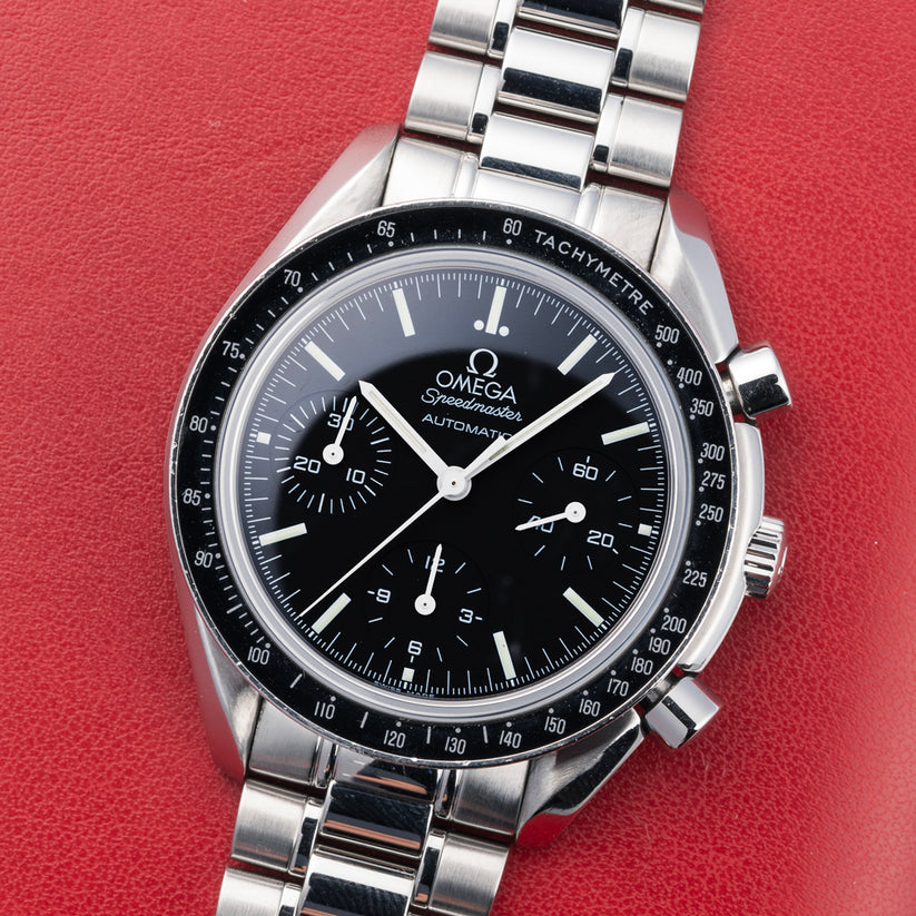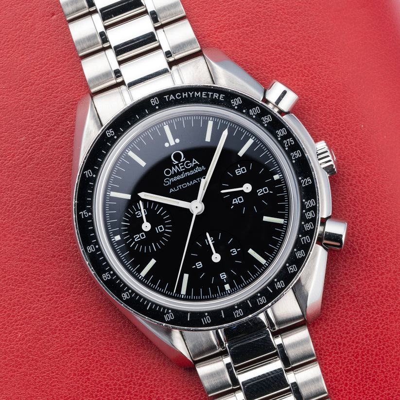 The Speedy Reduced Automatic - Measuring at 39mm and taking a lot of the same DNA as it's elder counterpart, this piece is a great entry into Omega. This model is an upgraded model from it's younger version, and now features a scratch resistant sapphire crystal and fold over clasp.