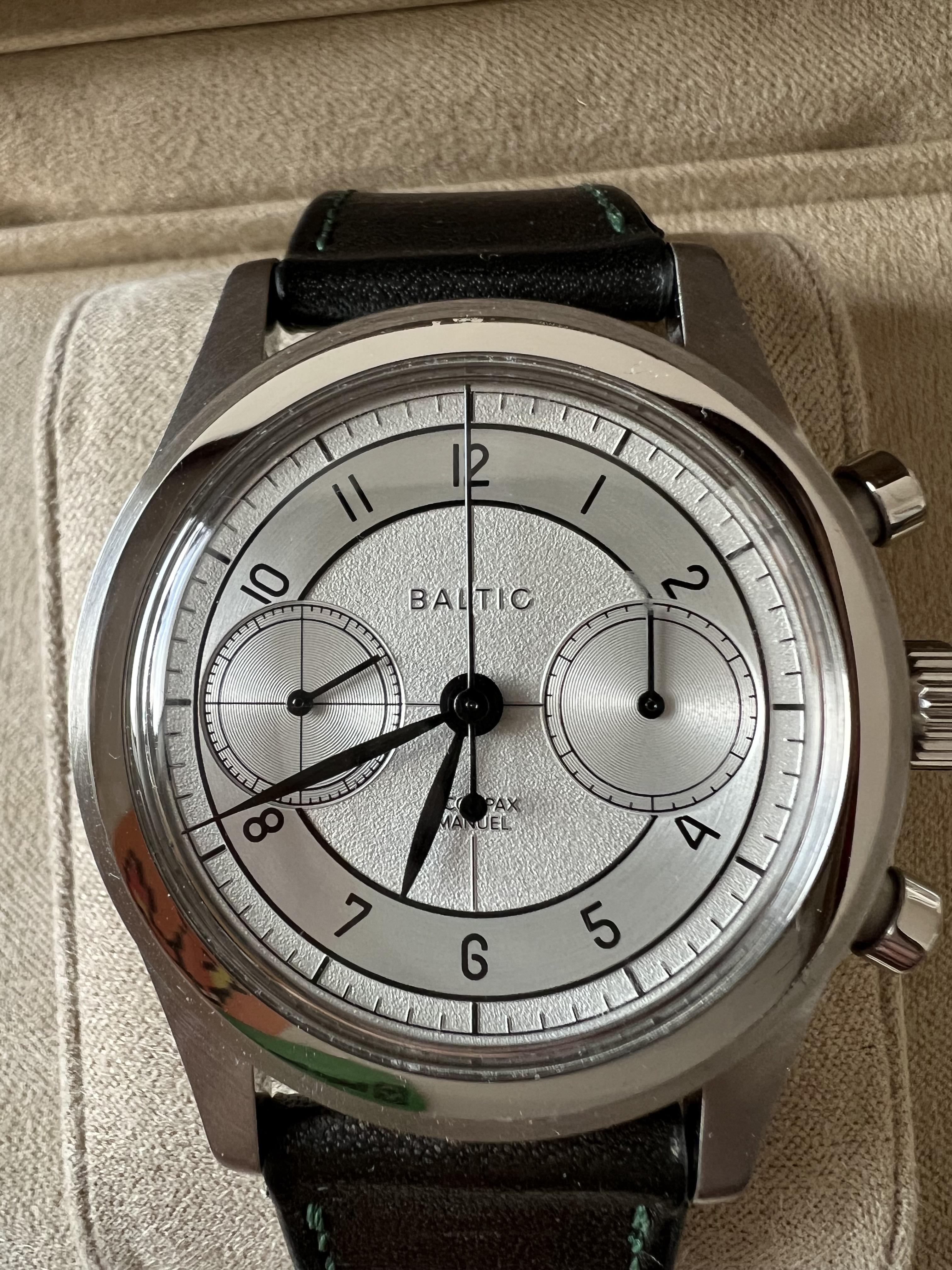 I am selling my Baltic BiCompax 002 with a silver dial and dark green leather strap. This watch provides incredible value at the price point with an incredible dial and open case back. It has been serviced one week ago at Grand Central Watch co. and hasn’t been worn since. I love this watch but I’m looking to upgrade. Condition is 9/10 – as pictured. This comes with the full set including box and warranty card. Here is a[ link to the time stamp](https://imgur.com/a/CcKpn24). Here is a [link to additional photos.](https://imgur.com/a/dOIJ5YW) Price is $415 and I accept payment via Paypal, Zelle or Venmo. Thanks! More Details *Case material: Stainless steel 316L // Case diameter: 38mm* *Lug to lug: 47mm // Thickness: 13mm (10mm without glass)* *Lug width: 20mm // Glass: High-domed hesalite* *Dial finish: Brushed, sandy and azurage // Movement: Manual Seagull ST1901* *Power reserve: 42 hours //Water resistance: 50m (5ATM)*