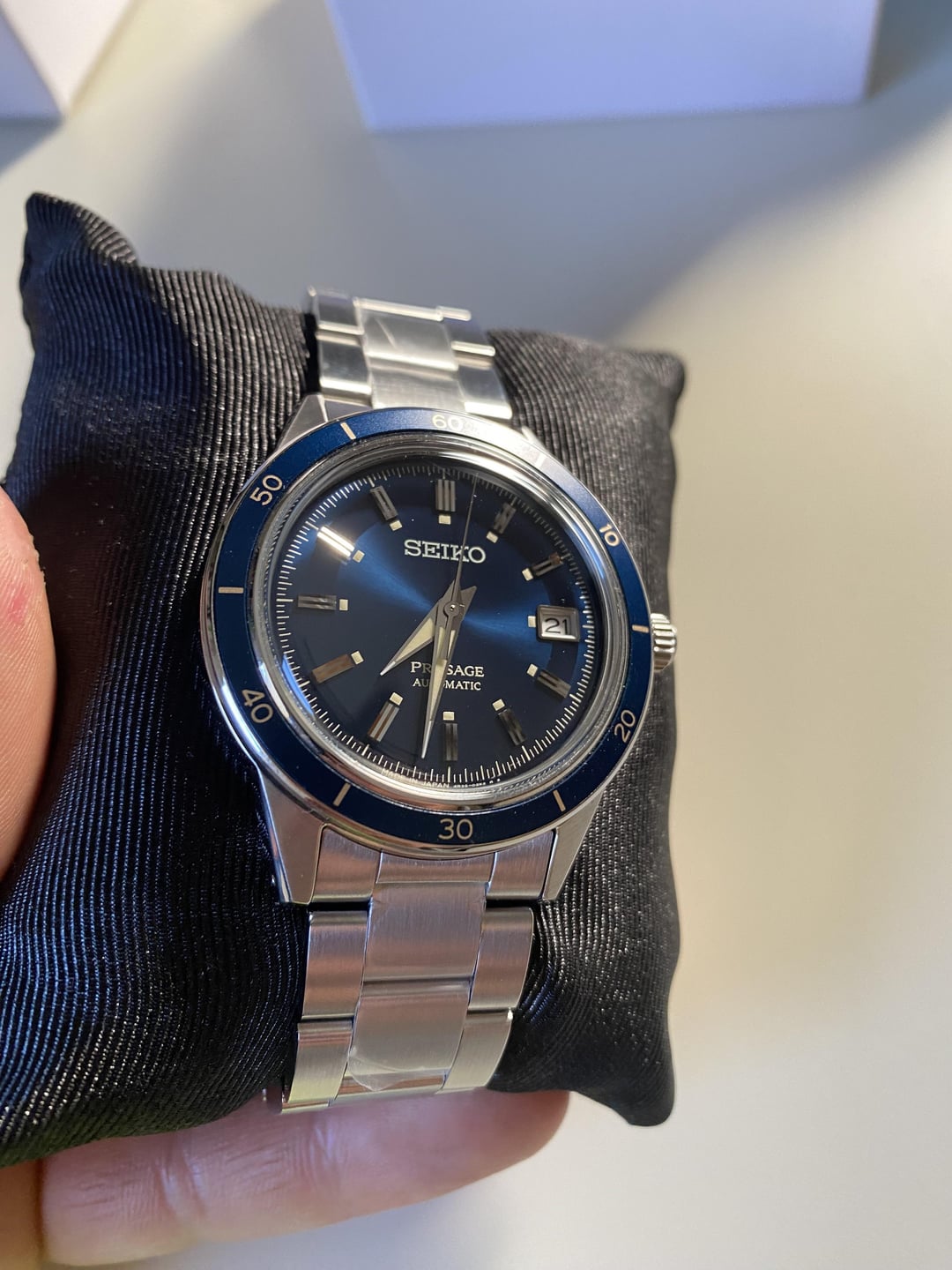 Hello watchexchange! I’m looking to sell my Seiko Presage SRPG05J1 in like new condition. Originally purchased brand new from Jomashop. Watch has been worn only a few times and was on an aftermarket bracelet each time. The factory bracelet still has the protective plastic on the center links. Comes with original inner and outer box, as well as the manual. Price: $295 shipped Diameter: 40.8mm Lug to Lug: 48mm Thickness: 12.5mm Water Resistance: 50mm Movement: Seiko 4R35 Automatic I will accept Zelle, Paypal F&F, or Paypal G&S (buyer pays fee) This is my first time selling on this sub, so I am comfortable with a video call or custom time stamp at your request. Please write me with any questions or for more detailed pictures. Thank you!