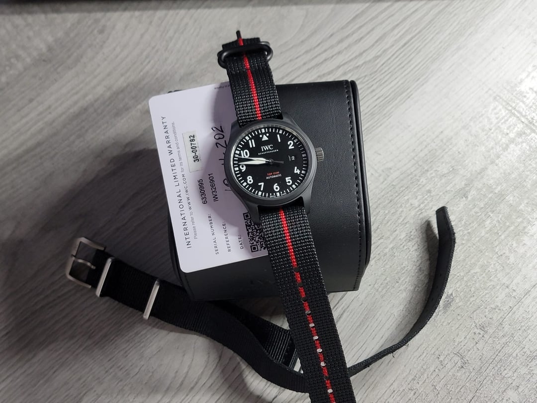 IWC Top Gun Ref: IW 326901 This watch is in great shape with limited to no signs of wear. Will come with IWC travel case, warranty card, and extra nato strap of your choice along with the OEM one (has cologne scent) thus why adding the aftermarket ones for you. Factory warranty is valid till 10/9/2030 Price - $4,199 shipped Pics & Timestamp = [https://imgur.com/a/H1VTYYg](https://imgur.com/a/H1VTYYg) IG = watchfornia Cheers, Adam,