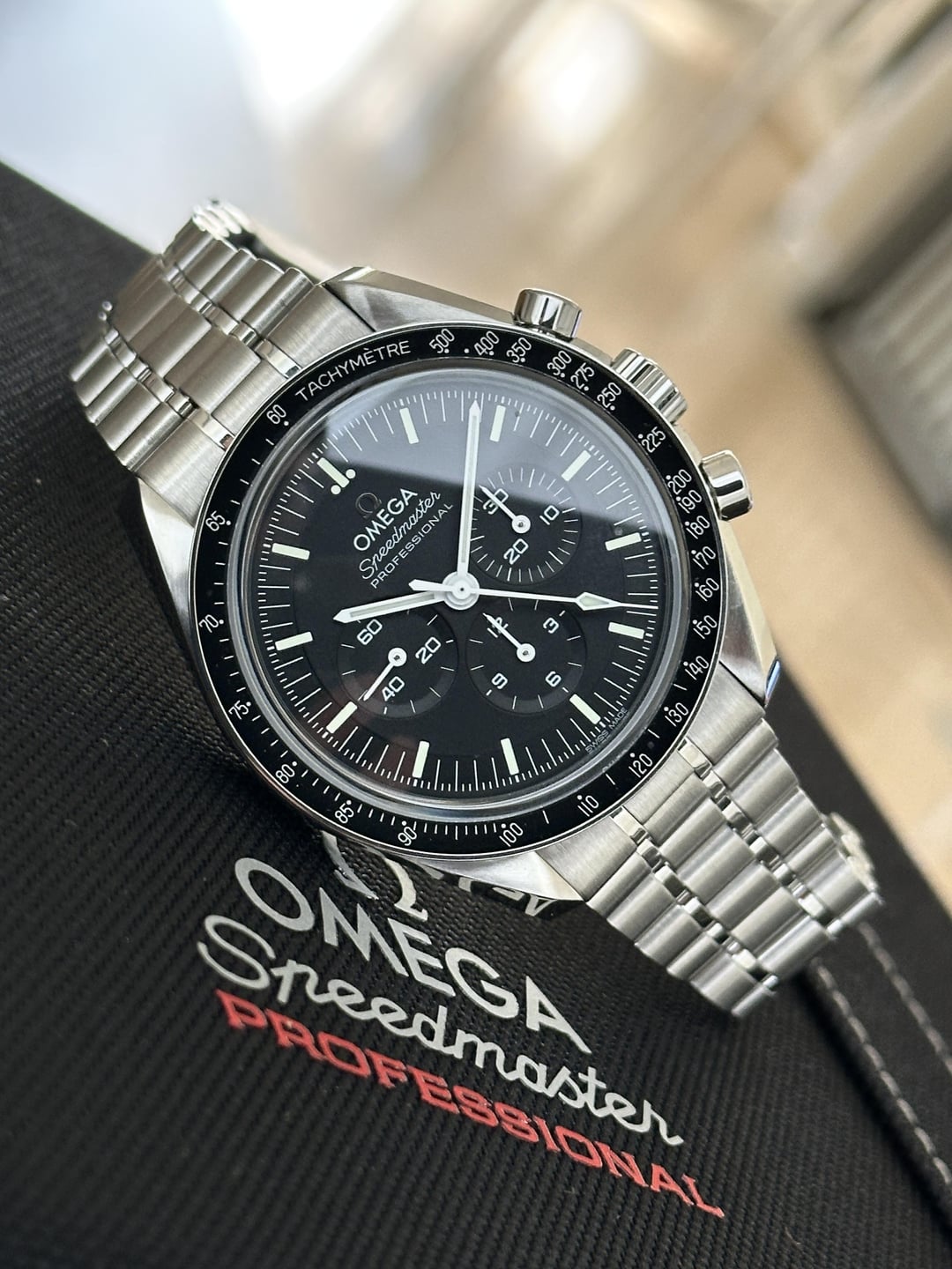 For sale is one of the all time greats; the Omega Speedmaster Moonwatch in the sapphire sandwich configuration. This particular piece looks is brand new & unworn, and still has the front and back caseback sticker. It also has the updated quick adjust clasp which now comes standard. The watch comes with the full kit of box and papers, with an AD warranty card dated Jan 2025 (note, I used a different Omega box for the photos as the black Speedmaster box doesn't photograph well). Price is $5950 with free shipping to any USA address. Wire only. May consider paypal F&F on a case by case basis. NO TRADES PLEASE [Timestamp](https://imgur.com/a/giqqyxl)