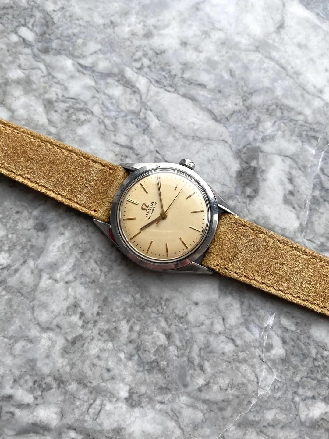 Looking to sell or trade a late 1950s, early 1960s Omega Automatic. I purchased it ~1 year ago from an established vintage watch dealer in NYC. The watch keeps great time and is fully functional. Matching gold hands and hour markers. The dial turned a cream color over time with even speckling throughout as seen in the photos. Stainless steel case and caseback. Measurements include a 34mm case size and 18mm lug width. As confirmed by the watch dealer I purchased it from, all parts are original including the signed Omega crown, dial, movement, and caseback. Asking price is $750 (domestic shipping included) but willing to negotiate. Happy to send more pics, videos or FaceTime if necessary given I am a first time seller on here.