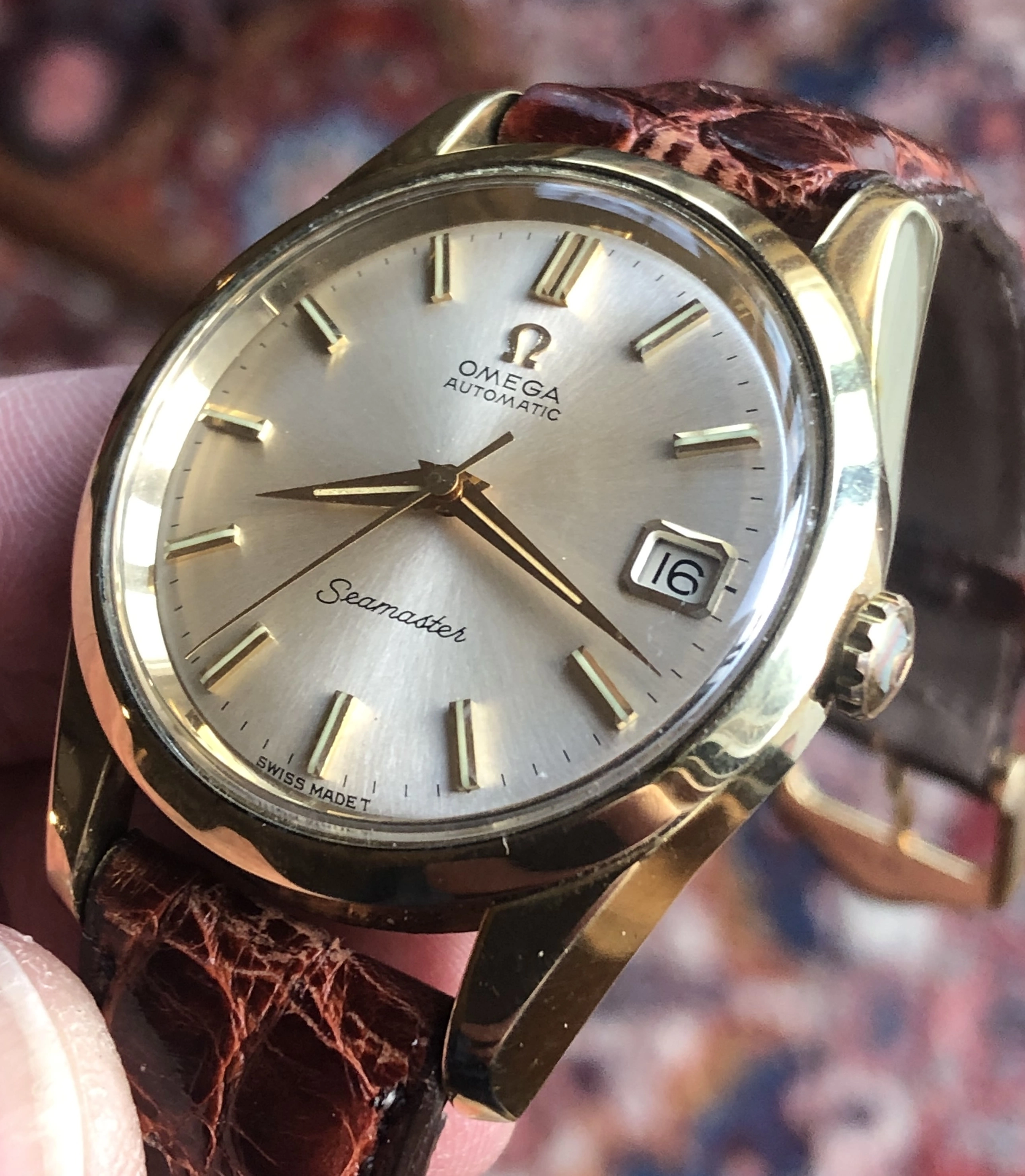 Here is a beautiful Omega Seamaster (ref 166.010) from the mid-1960s with a clean silver sunburst dial and a 35mm gold-capped over stainless case. The watch has not been serviced in my possession, but is winding, setting, and running properly. Comes with a lightly worn crocodile strap