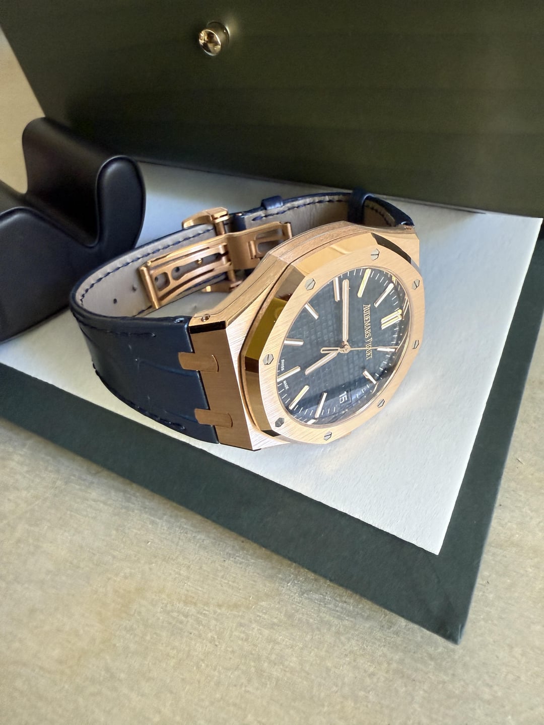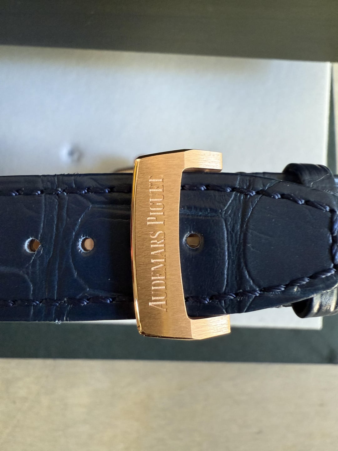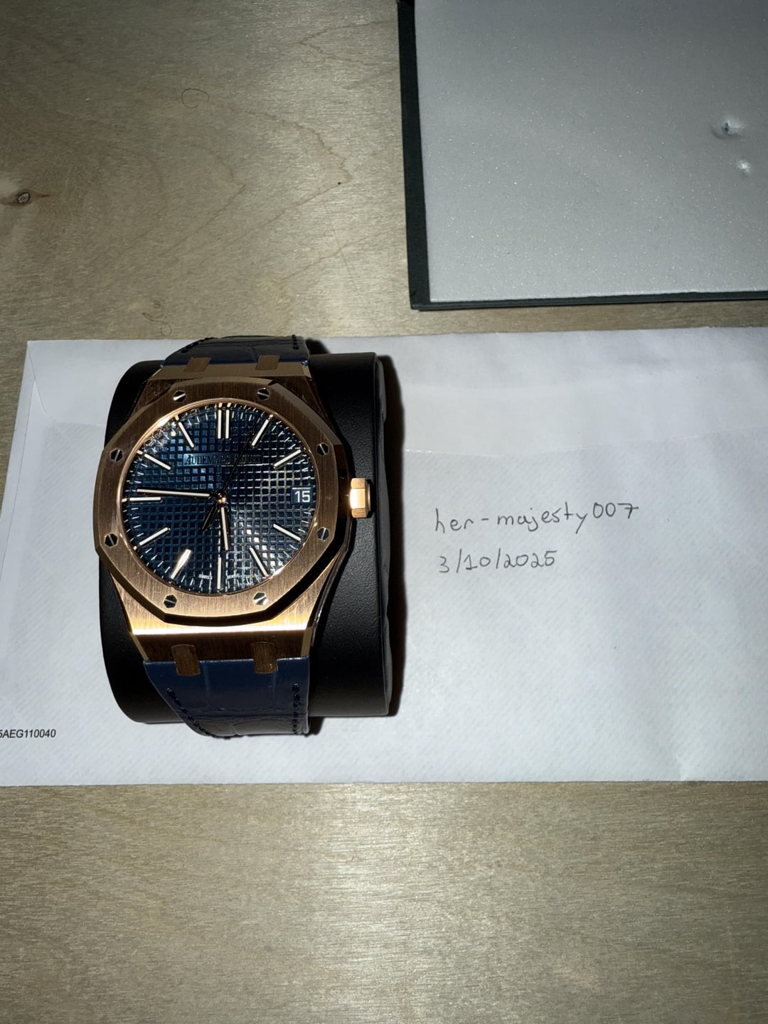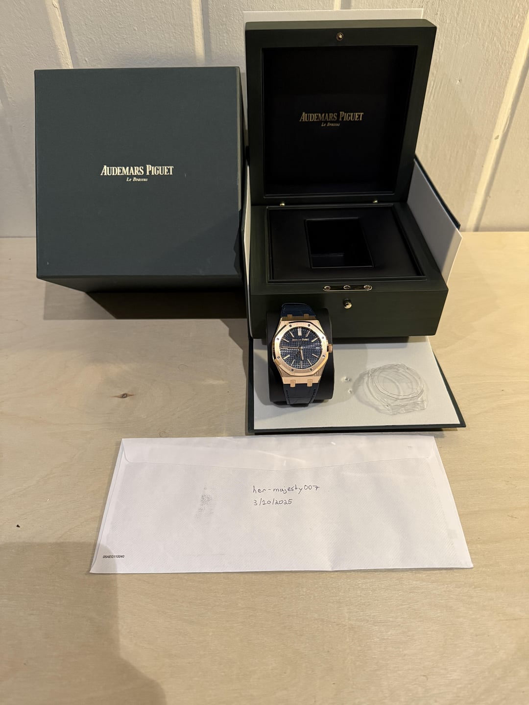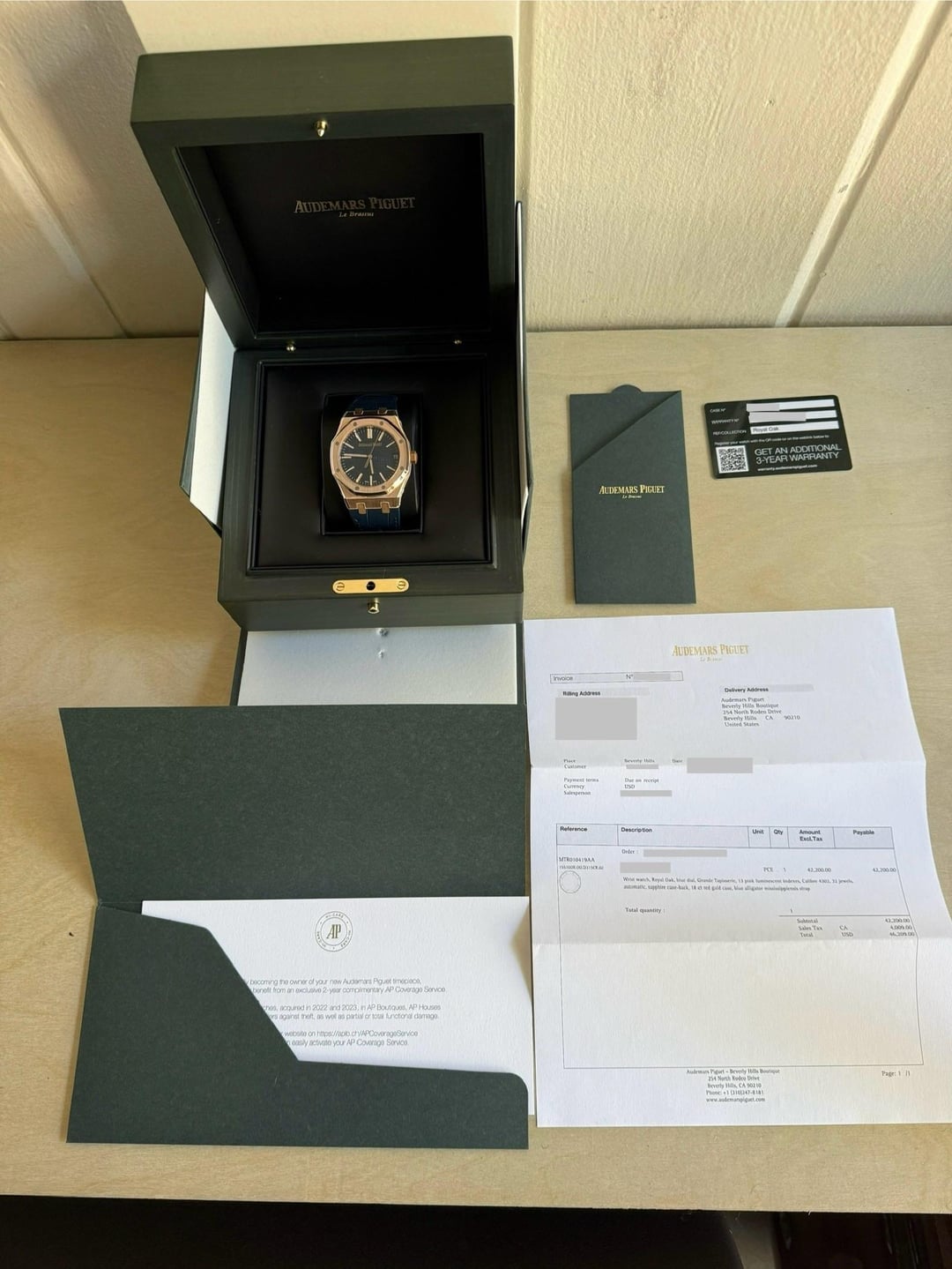 purchased october 2023, has audemars insurance until october 2025, receipt will come with my info redacted, you're welcome to register the watch with audemars, it has never been worn, i thought i would get use to the size but i didnt and have not worn outside of trying it on at the boutique, price $52,000