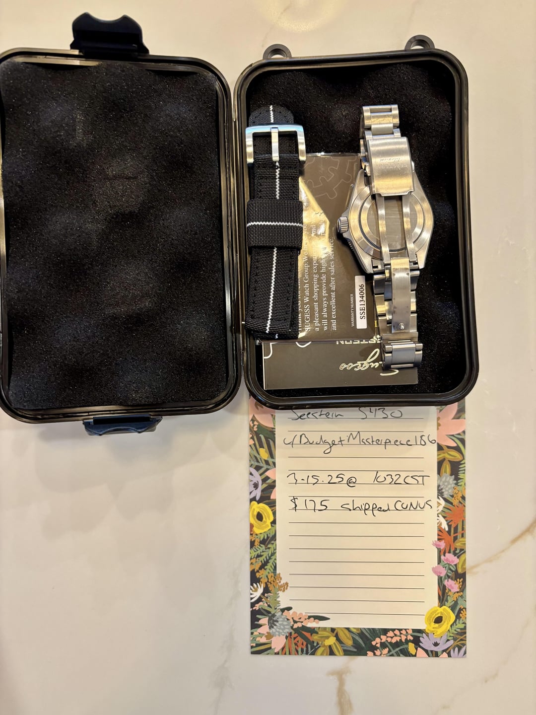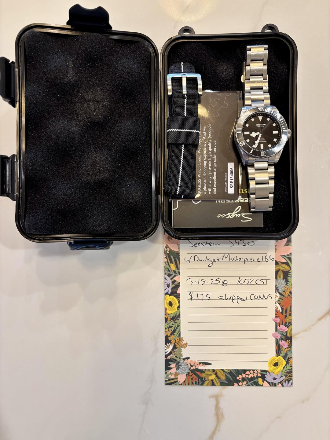 Looking to sell my Seestern S430. Love the watch, just making room for some others. I am looking for a San Martin SN0121T for trade if possible. $175 shipped CONUS Brand : Sugess Model : S430 Functionality : 12 Hours, Titanium Features : Titanium, Sapphire Crystal, Ceramic Bezel, Super Luminous, Movement : Seiko NH35 Automatic Movement Glass Material : Sapphire crystal Case Material : Titanium Band Material : Titanium Diameter : 39mm Thickness : 12.5mm