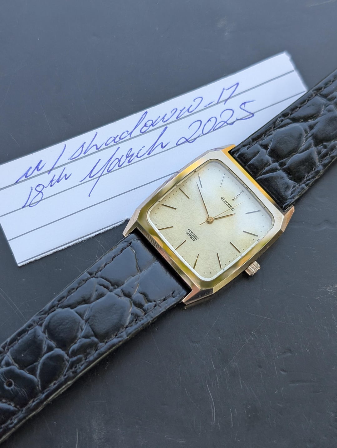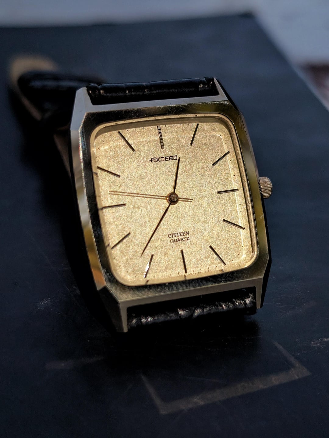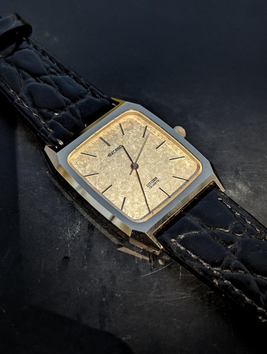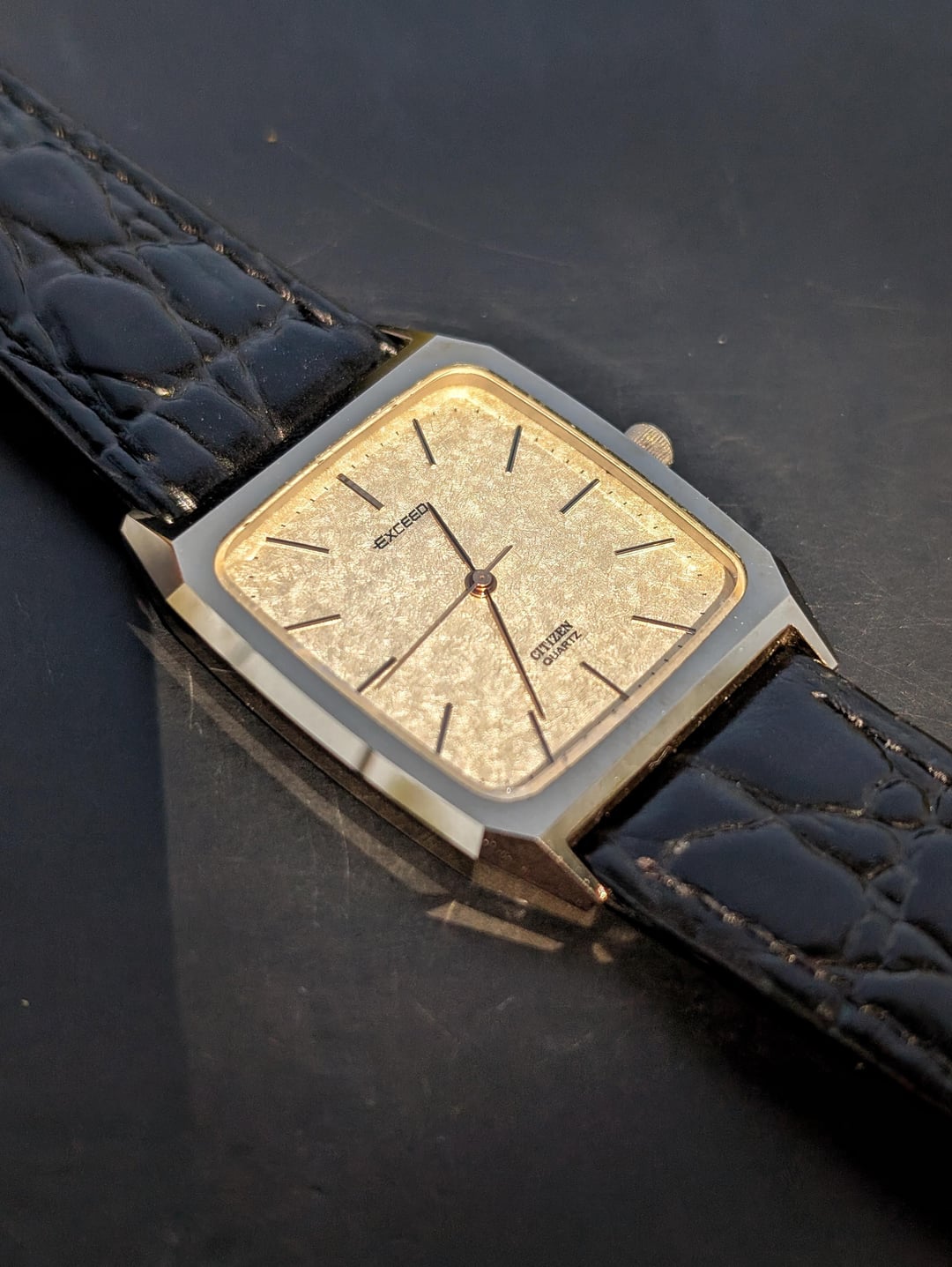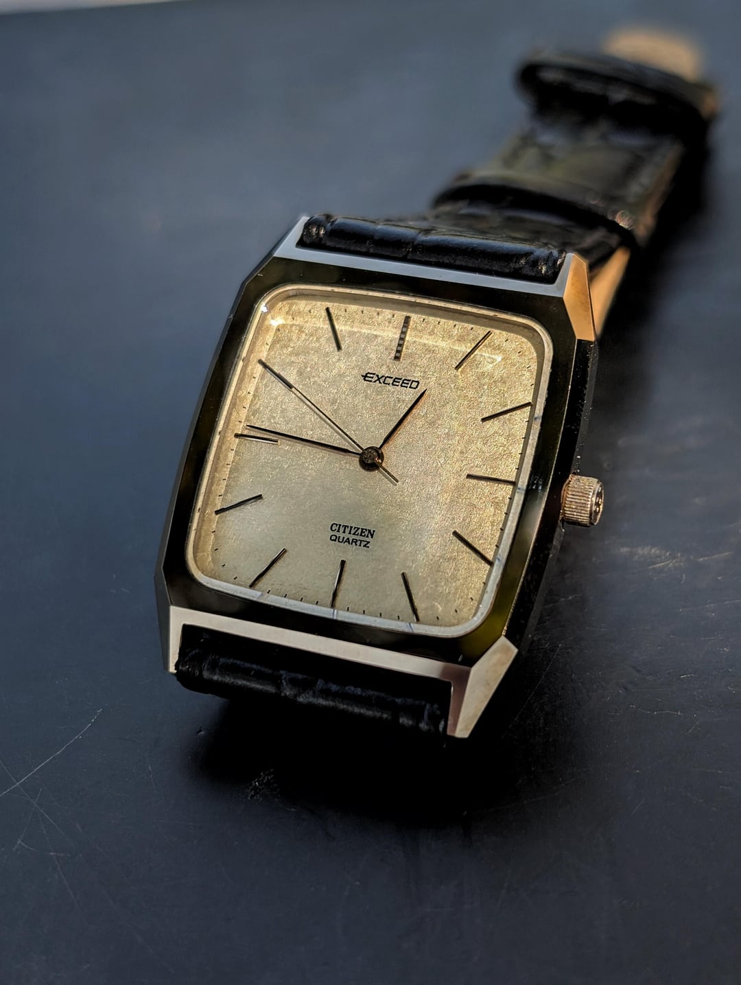 Greetings Watchexchange! Up for sale is a spectacular vintage Citizen Exceed with a titanium nitride ceramic case, sapphire crystal and a beautiful textured dial. These older Citizen Exceeds are very reminiscent of the Seiko Dolce watches of the era, and feature stunning faceted ceramic cases which are virtually scratch proof. The watch has a near mint case, scratch-less sapphire crystal and comes on an aftermarket 20mm leather strap. The watch has applied indices, with a perforated marker at 12 o'clock, and a signed crown with the "E" for Exceed. The dial has a beautiful almost woven texture, that plays well with light. The watch runs well, and has recently had a battery replacement. The watch is pictured on a 6.5" wrist for size reference. [Timestamp ](https://imgur.com/a/vPwIJ5w) The watch is priced to sell at $175 shipped via UPS and paid via Zelle or Wise. Please allow 3 to 5 business days of your payment for the watch to be shipped out. Be sure to reach out to me if you have any questions or require additional photographs or information, I entertain requests for custom timestamps. Thanks for looking!
