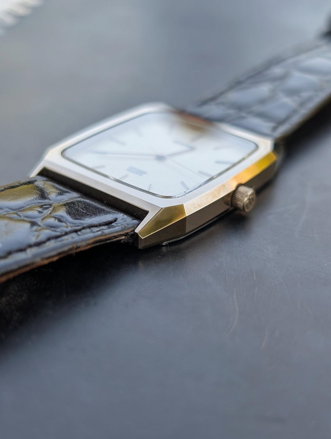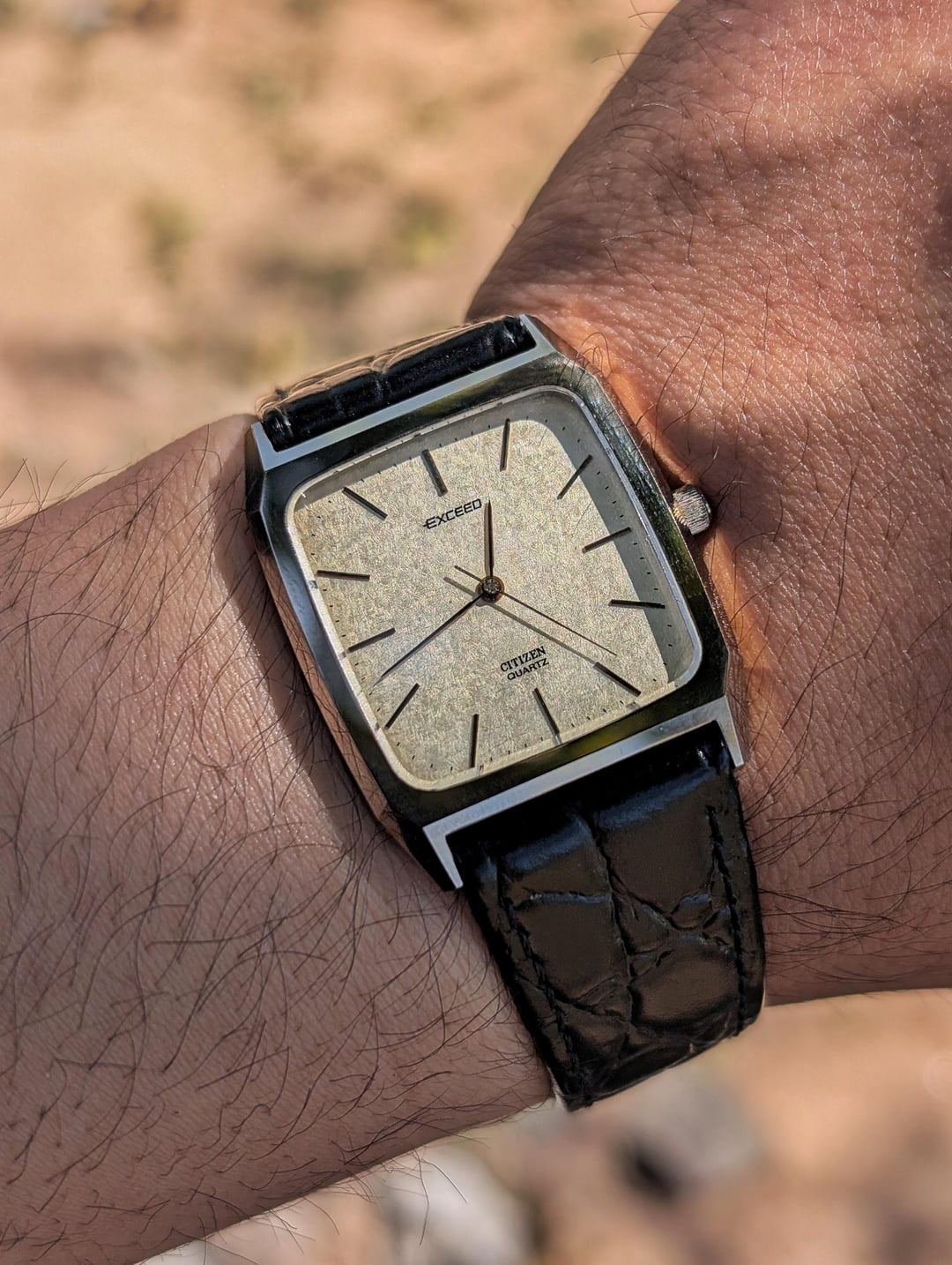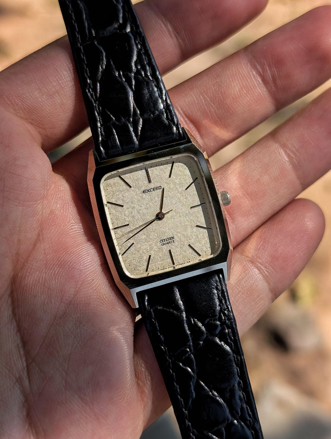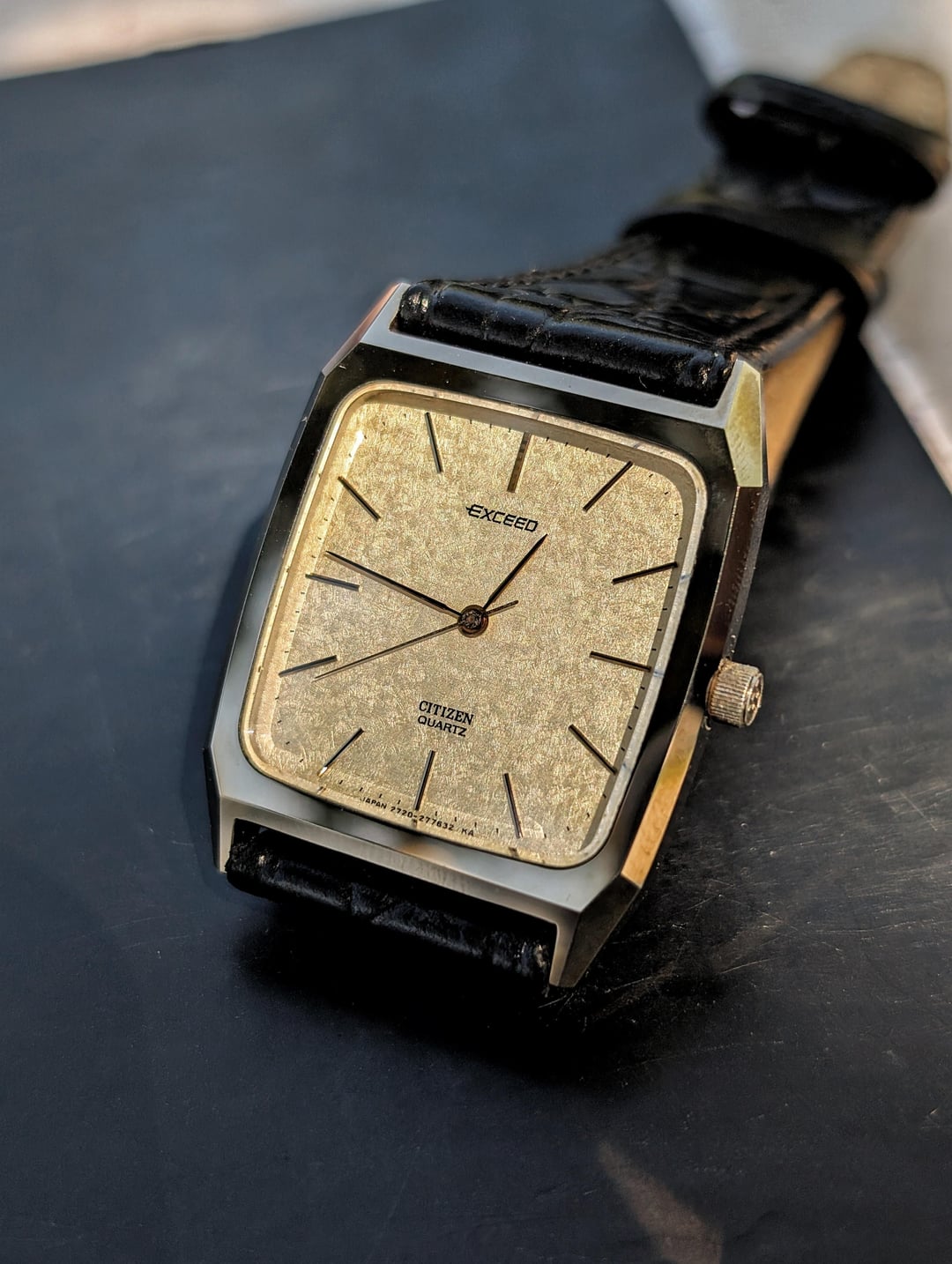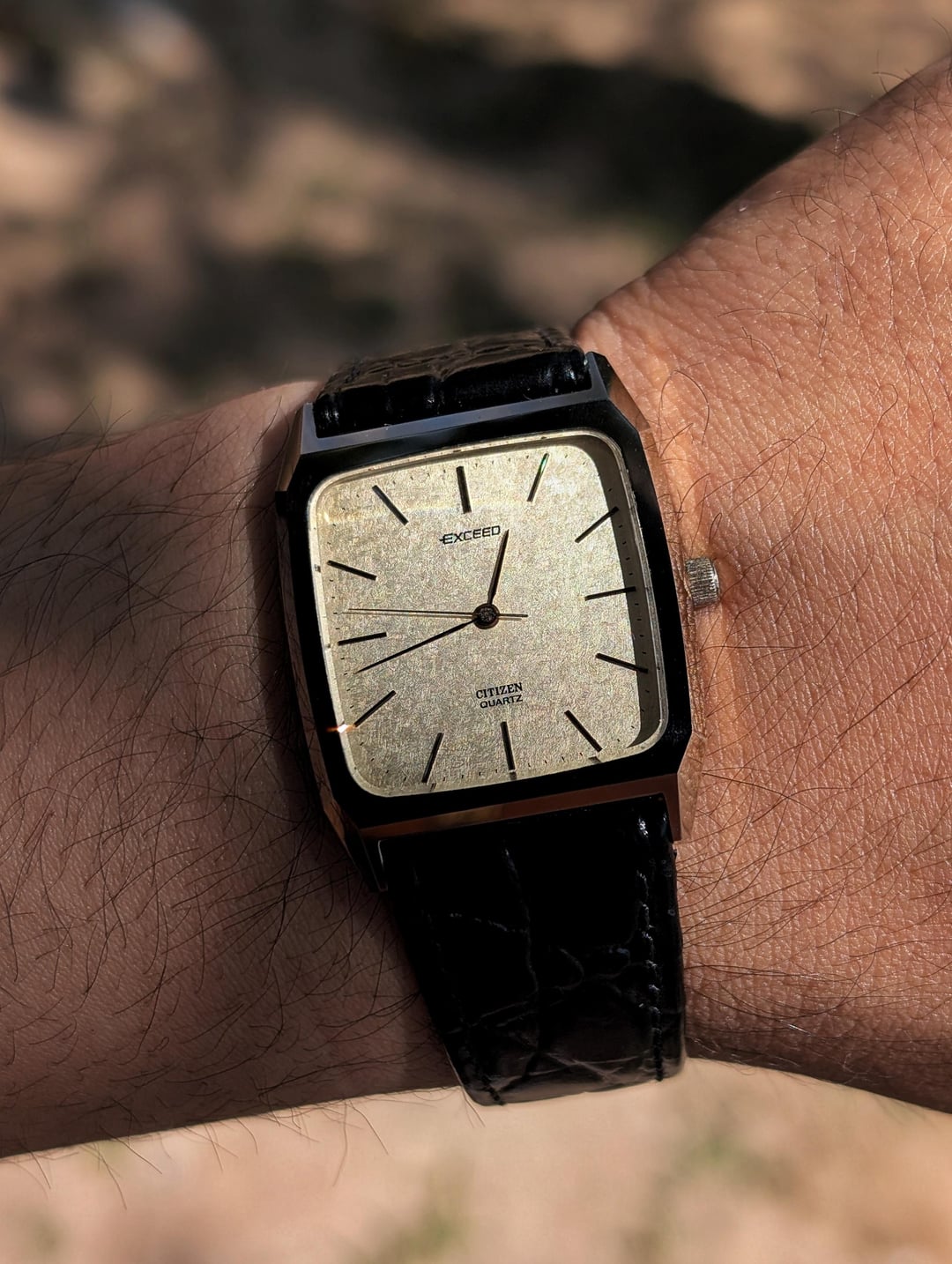Greetings Watchexchange! Up for sale is a spectacular vintage Citizen Exceed with a titanium nitride ceramic case, sapphire crystal and a beautiful textured dial. These older Citizen Exceeds are very reminiscent of the Seiko Dolce watches of the era, and feature stunning faceted ceramic cases which are virtually scratch proof. The watch has a near mint case, scratch-less sapphire crystal and comes on an aftermarket 20mm leather strap. The watch has applied indices, with a perforated marker at 12 o'clock, and a signed crown with the "E" for Exceed. The dial has a beautiful almost woven texture, that plays well with light. The watch runs well, and has recently had a battery replacement. The watch is pictured on a 6.5" wrist for size reference. [Timestamp ](https://imgur.com/a/vPwIJ5w) The watch is priced to sell at $175 shipped via UPS and paid via Zelle or Wise. Please allow 3 to 5 business days of your payment for the watch to be shipped out. Be sure to reach out to me if you have any questions or require additional photographs or information, I entertain requests for custom timestamps. Thanks for looking!