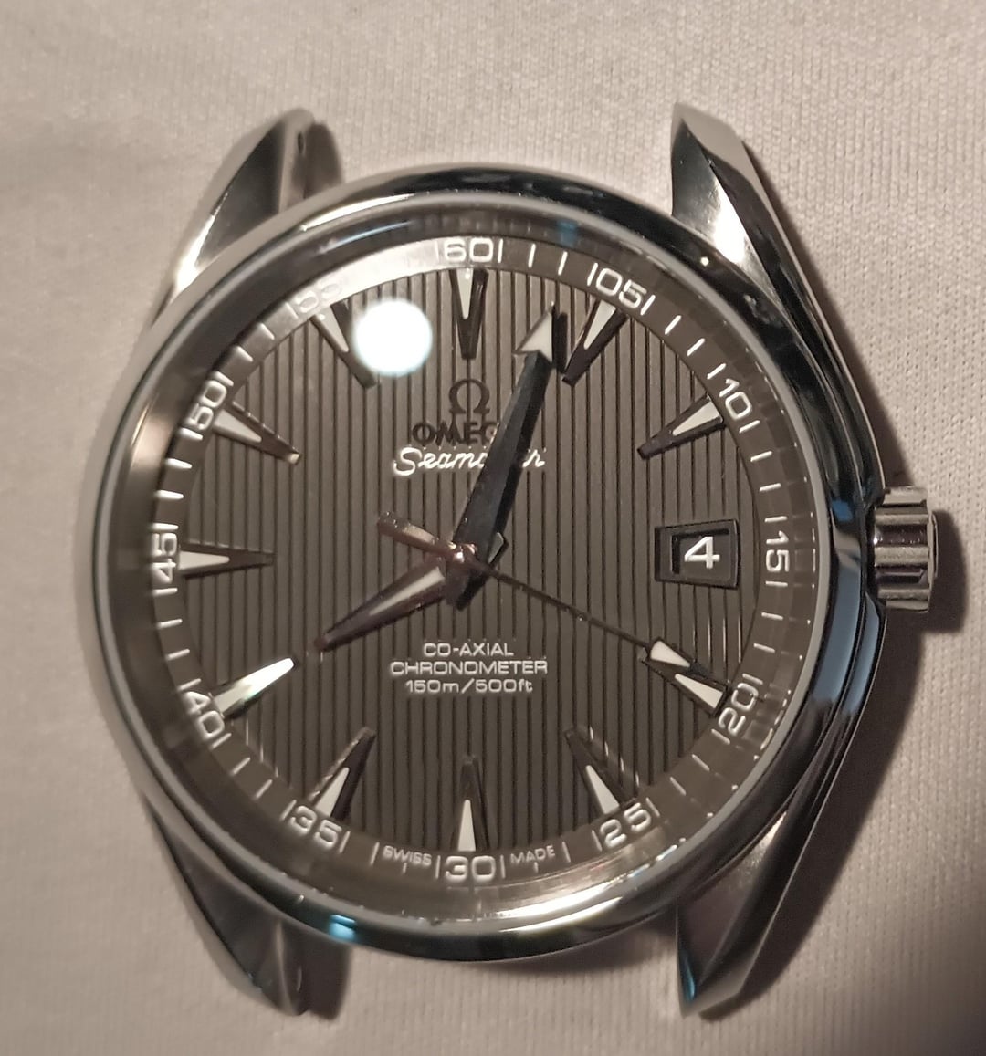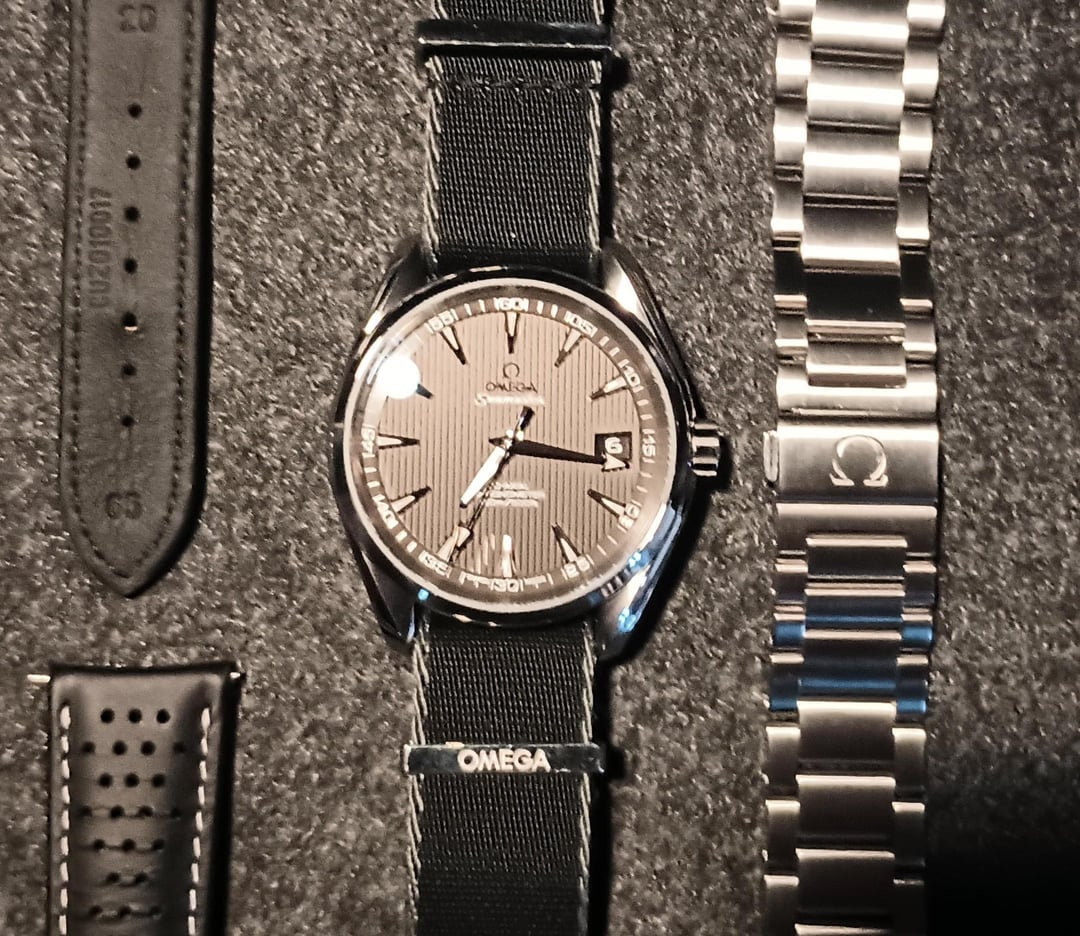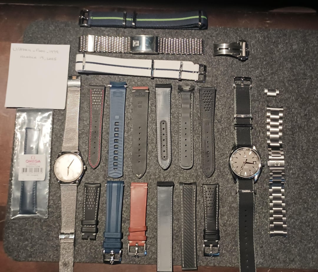 Hi Watch Exchange. On offer is the majority of what I still have in my collection. I don’t have the time/desire to sell individually anymore and I want out. This is being sold as one big lot; hopefully someone with more time can make themselves a tidy profit (or keep for their own collection). The pics are not great, sorry. All of it genuine Omega all of it gently worn Left Watch is a reference 2603 from the 50’s (caliber 265, 37.5mm Jumbo). On it is an OEM Omega fine mesh band from the 60’s. Dial has been professionally refinished, acrylic crystal replaced. Right Watch is a grey dial Aqua Terra (41.5 case, 8500 movement). It has just returned from Factory Omega Service and service paperwork is included. On it is a Black with grey edge NATO, included is the refinished bracelet sized form y 6.75 wrist and including 1 extra full size link. Top row: Blue Green NATO 19/20 Stainless Shark Mesh from the Ploprof + 1 extension 20mm 18mm Clasp White Blue NATO 19/20 Left to Right: Vegan Blue 19mm – takes a 16mm clasp – brand new, never worn Black Rally 19mm – takes a 16mm pin buckle Current SMP 300 version of the Blue Rubber 20mm with pin buckle Golden Brown and pun buckle from the CK859 20mm Black with grey Stich Leather/Fabric from the Aston Martin Aqua Terra 20mm - takes an 18 clasp Black with White Stitch Rubber from the current full size (fits the 8500 in this listing seamlessly) Aqua Terra 20mm – takes an 18mm clasp Black Rally 20mm with 16mm brushed pin buckle $4500 net to me via Paypal G&S includes insured USPS Priority shipping anywhere in CONUS. Or face to face in the Colorado Springs or Denver area. I will listen to offers, but please do not ask me what my “best price” is. Apologies for any delays in replies, I am not on Reddit daily