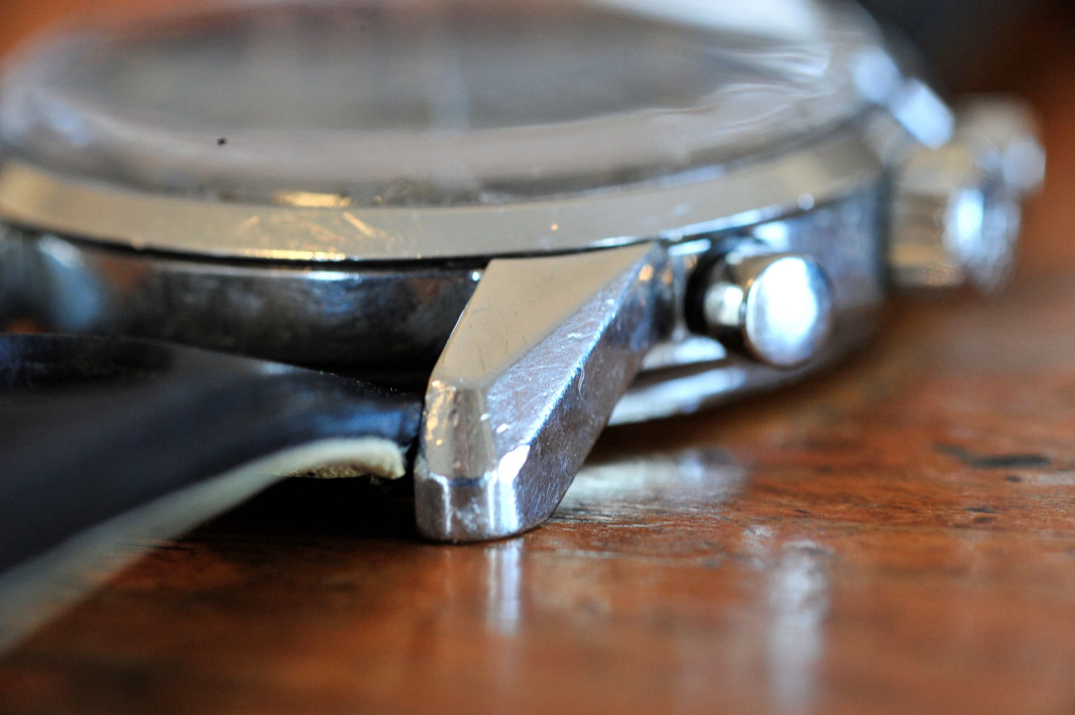 Solid with bevels pronounced as shown in photos. Seems unpolished except for caseback. Scratches as expected for nearly 60-year-old watch.
