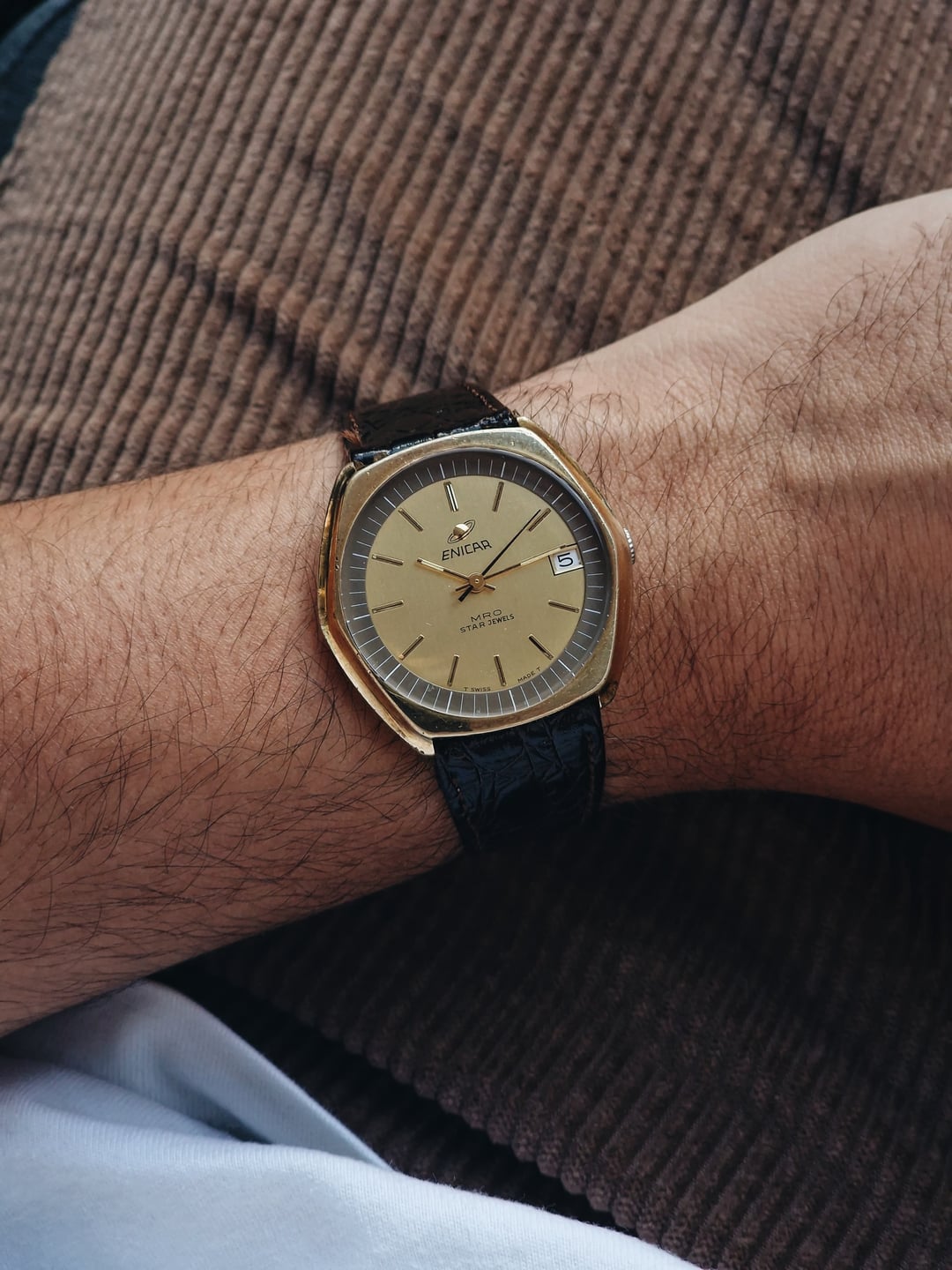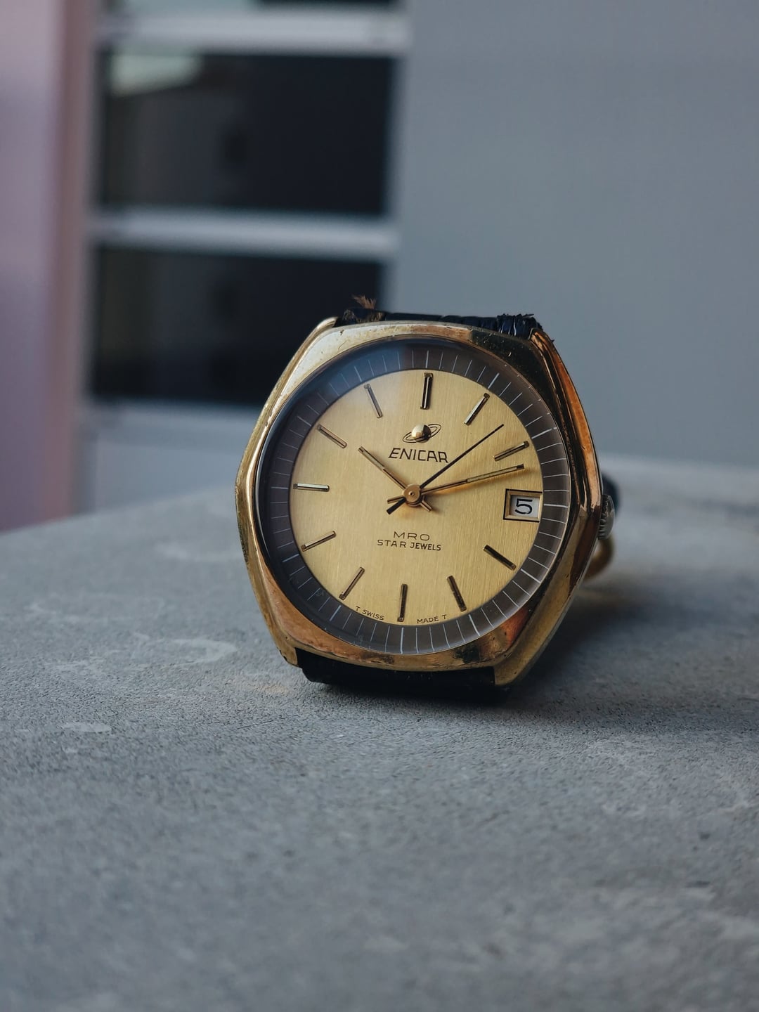 I love Enicar, especially these lesser-known models. This one is the MRO Star Jewels, powered by the in-house caliber 160. It has a funky gold-plated case with a reasonable size of 37 mm and a gorgeous sunburst dial. **Details & More** **Condition:** Good with some markings on the case. Please see the pictures for a better description. **Case Size:** 37 x 36 mm, with a thickness of 10.5 mm. **Reference:** 160/80/01 **Crystal:** Acrylic **Movement:** Enicar 160, manual wind, 17 jewels, 21,600 bph. Service history is unknown, but everything is working as it should. **Other Information:** * Watch only, no box or papers. **Price:** Asking $165. Please add $15 for worldwide shipping. Payment methods include Wise, ACH transfer, Revolut, Bitcoin (On-Chain or Lightning), or PayPal G&S for buyers with solid references. Add +6% for currency conversion fees on the latter. I’m located in Portugal, but worldwide shipping isn’t an issue. Established seller with over 220 transactions – buy with confidence! Make sure to follow me on Instagram (@daily.worn) to check out the newest additions. [Pictures](https://imgur.com/a/2fHVjtK) [Timestamp](https://imgur.com/a/dCIKkL5)