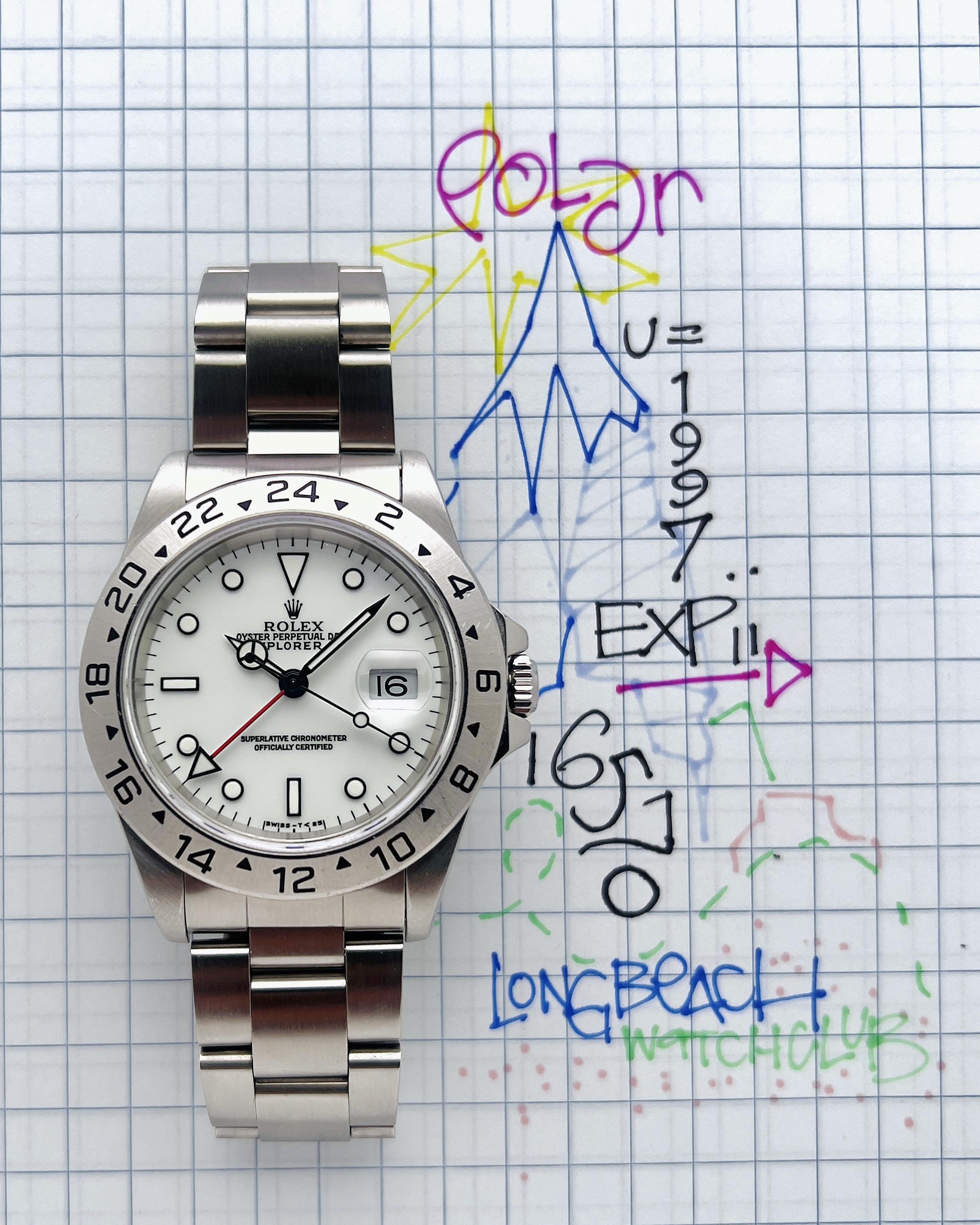 Rolex Polar Explorer II ref. 16570 U-serial 1997 This Polar variant is one of the last or the tritium dial production from 1997 before they switched to luminova. A neo-vintage classic with 3185 movement—arguably the best white dial steel sports watch of all time. Signs or wear but not damage notes and light signs of polish— video is best look Timestamp on Timegrapher and video: https://imgur.com/a/xtEmHZ3 * no box, papers, or trades please * No service history but running strong and automatic rotor is smooth, manual winding has some resistance * 40mm case X 20mm oyster bracelet is actually from a Submariner but S code on clasp from 1994 is era appropriate (we can accommodate wrist size with appropriate amount of links) * All sales final unless the watch is misrepresented or lost in transit (always fully insured) * Link to [feedback here](https://www.reddit.com/r/WatchExchangeFeedback/search?q=soycowboy&restrict_sr=1&sort=new) & [watchcharts here](https://watchcharts.com/repcheck/user/soycowboy?source=reddit&type=feedback) * Asking a *negotiable* **💲6999** via bank wire, Zelle, venmo, or possibly PayPal Friends & Family with super strong references or if I know you. Price includes fully insured Fedex shipping in the USA— hand delivery in most of the Los Angeles or Orange County areas with drinks or coffee on me ;). - 🪼Cheers, Stephen