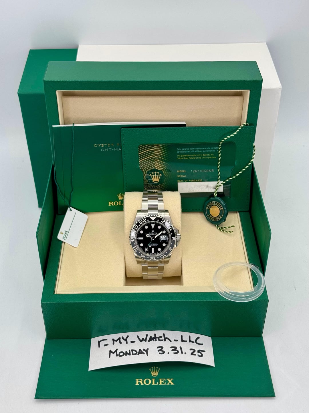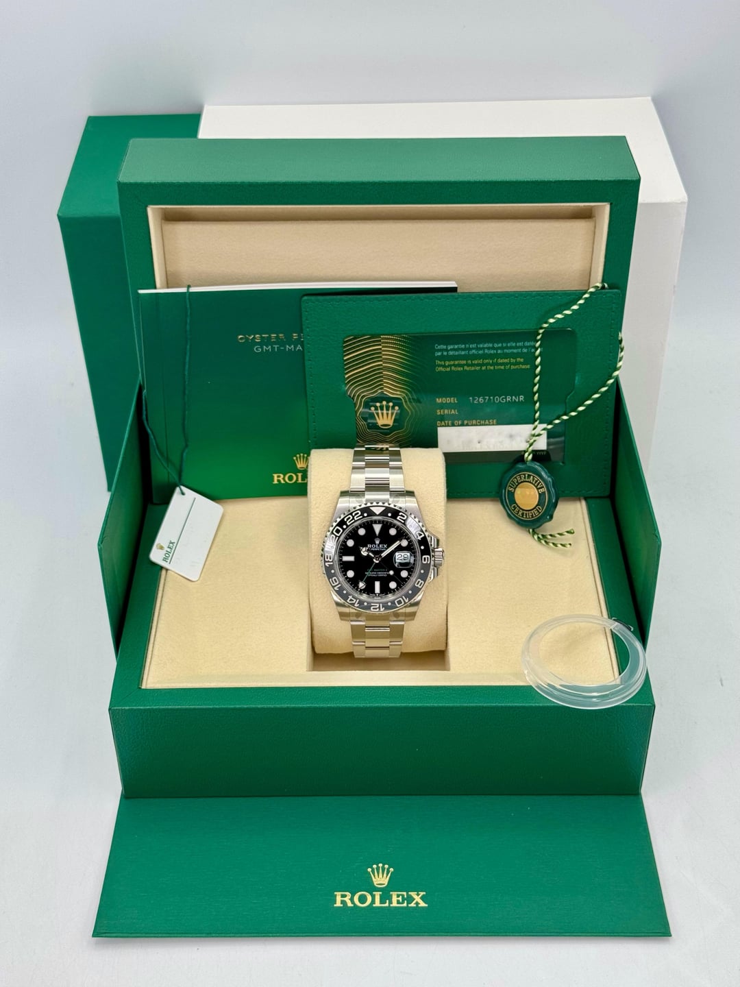 🔵NEW 2025 Rolex GMT-Master II "Bruce Wayne" 40mm 126710GRNR Oyster Bracelet New bi-color ceramic bezel in grey and black 🔵Note: Watch is fully stickered including clasp stackers and barcode sticker on side of the case 🔵TRADE or SELL us your luxury watch, all brands considered. Message me details. **Includes the following:** ✔️BRAND NEW 2025 UPDATED Rolex BOX (Double Box) ✔️Box and Papers - Yes ✔️Warranty card dated 2025 ✔️5 Year Manufacturer Warranty ✔️Manual and Warranty Booklets ✔️Green and White Hang Tags included ✔️Bezel Protector ✔️Size: 7.75inch wrist (Full Links) ✔️Watch is BRAND NEW/UNWORN ✔️Trades welcome ✔️Appraisal included Business Name: **My Watch LLC** LOCATION: Oak Park, Michigan ✔️Checkout my other listings over 200 watches available from RLX, PP, AP, OMEG@ ✔️We are by Appointment M-F 11-4 for in person viewing ✔️Facetime/Video chat/calls welcome to view the watch interested. ✔️Contact: 248-422-0909 via text or call for quickest response. 🟢TERMS: Prices listed are for Bank wire / Cash. (Zelle, Venmo also accepted) Credit card 3.5% fee (Visa/MC) Amex/Paypal + 4.5% fee. Crypto + 2% 🟢REFERENCES/REVIEWS: We are well reviewed on all platforms from google, trust pilot, rolexforums, additionally we have 300+ reference in multiple FaceBook watch groups, reference checks welcome. 🟢SHIPPING: If you are not local, we offer Fully Insured FedEx overnight shipping in the USA for a fee. International shipping available.