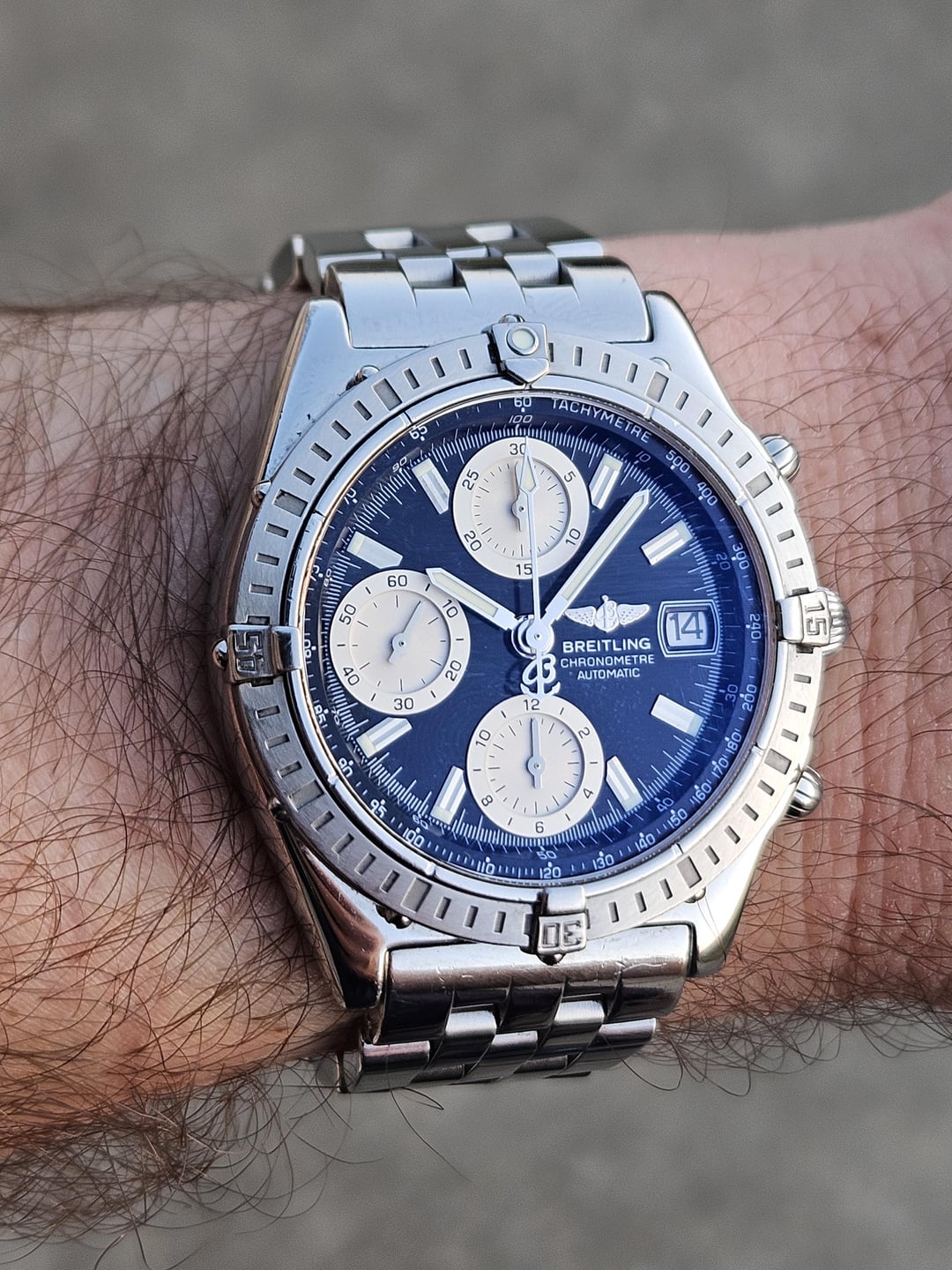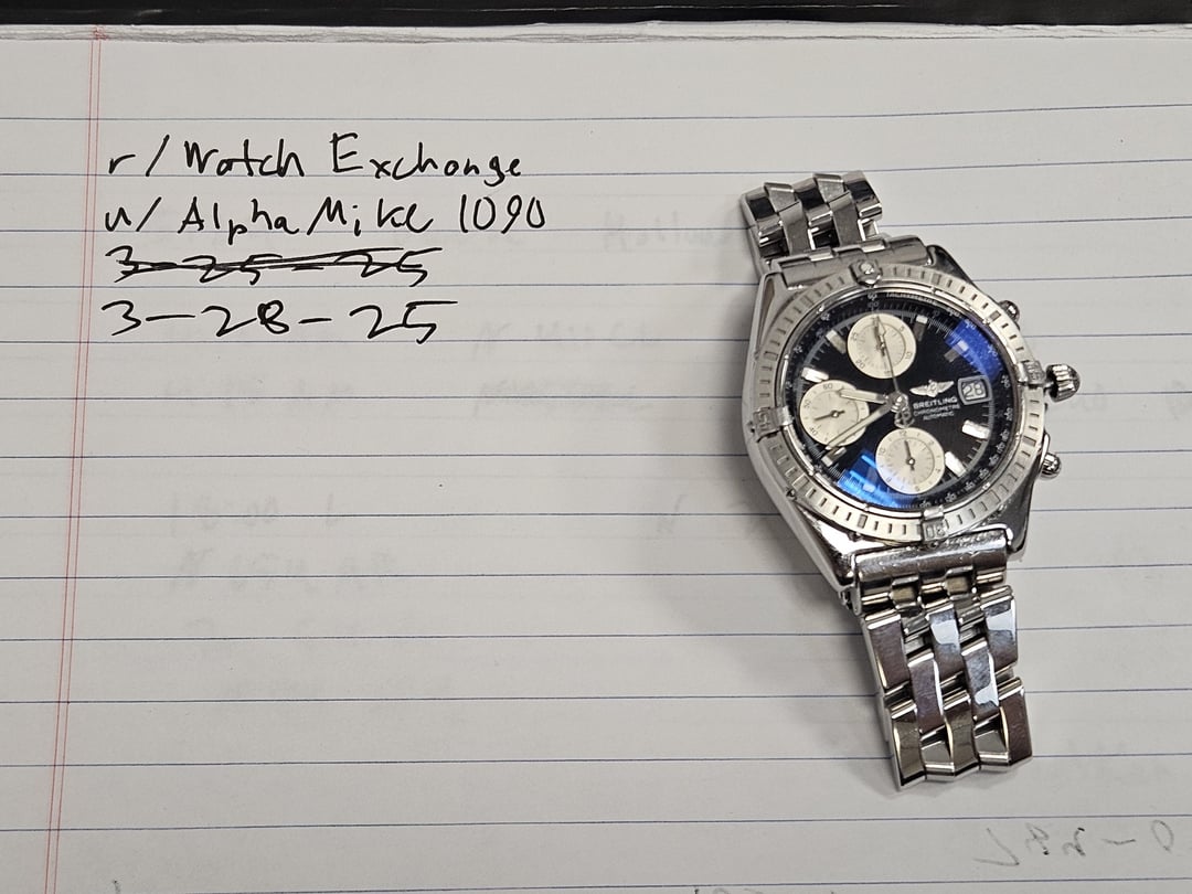 Hey there! For sale is a mid-00s Breitling Chronomat, reference A13352. This 39mm case, 14mm thick, Valjoux 7750 powered chronograph has made an excellent daily watch, but it’s time to move it along. I’m sure I’ll pick up another one of these down the road. The watch is in good external condition as the pictures show, but I’d be happy to provide more specific details. Internally the watch is running very well, with the previous owner claiming that it was recently serviced. I believe it, since the start, stop, and reset of the chronograph works very well, along with all other functions, including screw-down crown and quickset date. The bracelet has enough links and micro-adjust to size it 7.25", and I'll be glad to add that link back on if it's required. I will say that the watch wears very well, and smaller than the measurements indicate. It shares this trait with the Speedmaster, in that the bubble caseback sinks into the wrist, and the bezel and polished areas work to reduce the perceived thickness. Again, I’ll pick up another of these in the future. Album: [https://imgur.com/a/qkNUKr8](https://imgur.com/a/qkNUKr8) Timestamp: [https://imgur.com/a/1fOEPtC](https://imgur.com/a/1fOEPtC) Asking $1,680 including insured shipping to the CONUS. I accept PayPal or Zelle. Conus only. Thanks for looking!