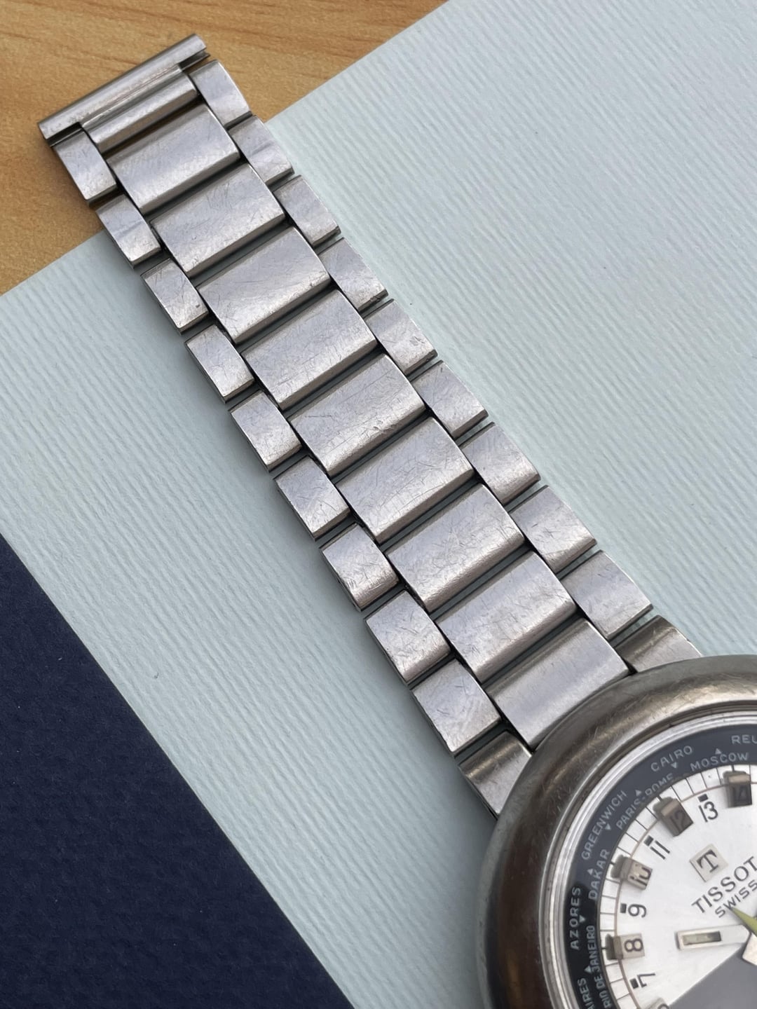 Up for sale is a rare collector’s piece from the 1970s, manufactured by the Swiss watch brand Tissot. This vintage timepiece runs on an automatic movement and features a puck-shaped stainless steel case, measuring approximately 44mm in diameter. The watch showcases a 24-hour dial with a date window at the 3 o’clock position and a world timer function, which can be adjusted using the crown at 2 o’clock. It comes attached to its original bracelet and remains unpolished, preserving its authentic vintage condition. The watch’s condition can be clearly seen in the pictures. Asking: $750 shipped via FedEx Payment: Zelle, or Wire Note: The watch is scheduled to ship within 2–3 days of payment.