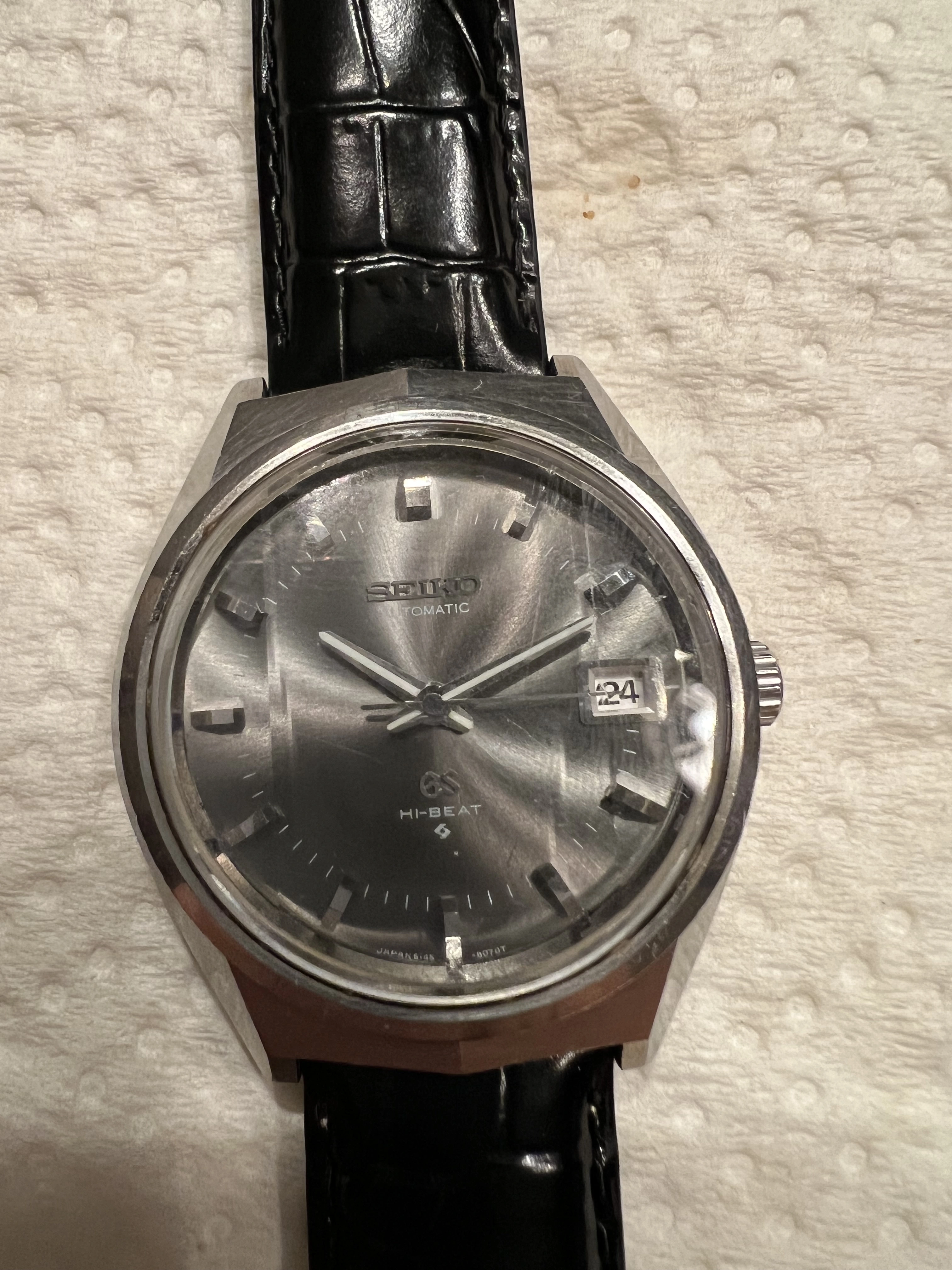 Movement Suwa 6145A 25J High Beat 36000 BPH automatic. Hand winds and hacks. Serviced before delivery to me in 2023, so I have not opened case for movement photo. Keeping excellent vintage time. Purchased from "The Grand Seiko Guy" Gerald Donovan, well known GS collector and dealer in 2023.