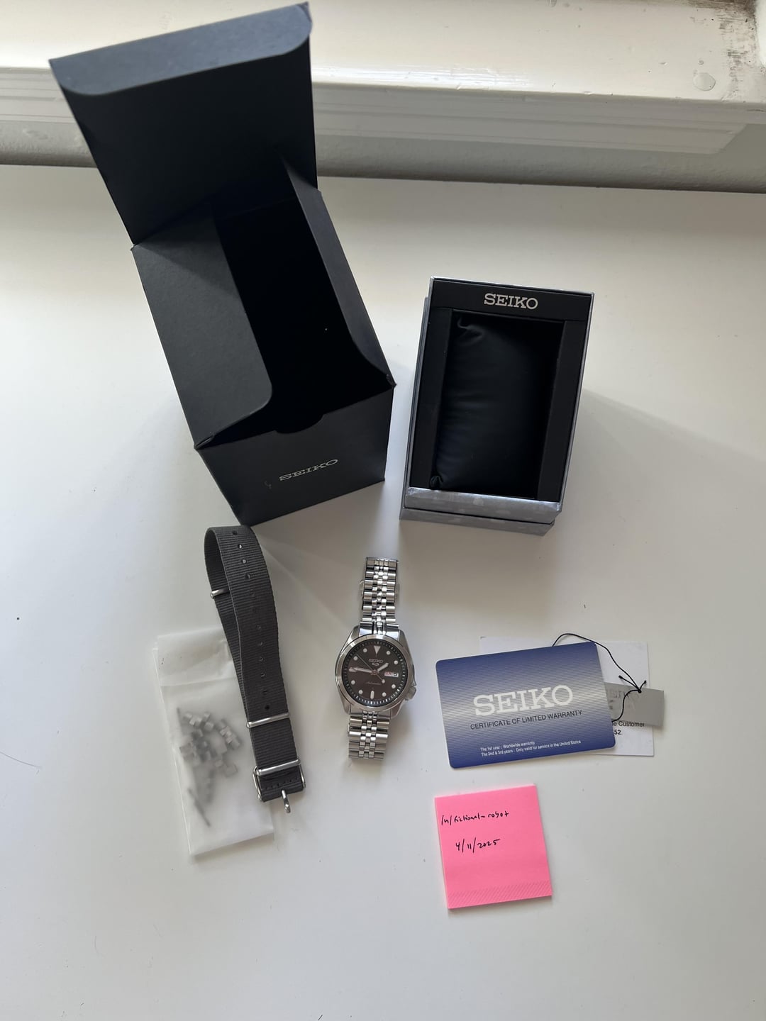 Selling a perfect entry-level GADA watch - the SRPE61. Comes with a gray Sunburst dial. This model has the brushed bezel as scratches are less prone to show. It comes with a Jubilee bracelet. Watch is in great condition - barely wore it since I bought it. Bracelet has no noticeable signs of wear. It was purchased from Long Island watch who is an authorized dealer. Therefore, it will come with remainder of Seiko factory warranty. Comes with full kit including outer cardboard box, inner cardboard box, all booklets, original NATO strap, which is unused and warranty. All spare links for the bracelet are included. Quick Specs: Case Material : Stainless Steel Diameter : 40mm Length : 44mm (Lug to Lug) Thickness : 11.5mm Glass : Flat Hardlex crystal Bezel: Brushed stainless steel Dial: Grey dial Movement : Seiko 4R35 with day and date Lug Width: 20mm Bracelet: 20mm solid end link J style bracelet for Ling Island Watch Water Resistance: 100m Link: [https://longislandwatch.com/seiko-srpe61-5-sports-watch-srpe61/](https://longislandwatch.com/seiko-srpe61-5-sports-watch-srpe61/) I’m asking $150 shipped to anywhere within CONUS. Zelle preferred, venmo, PP F&F also accepted No trades at this time Please feel free to reach out with any questions!