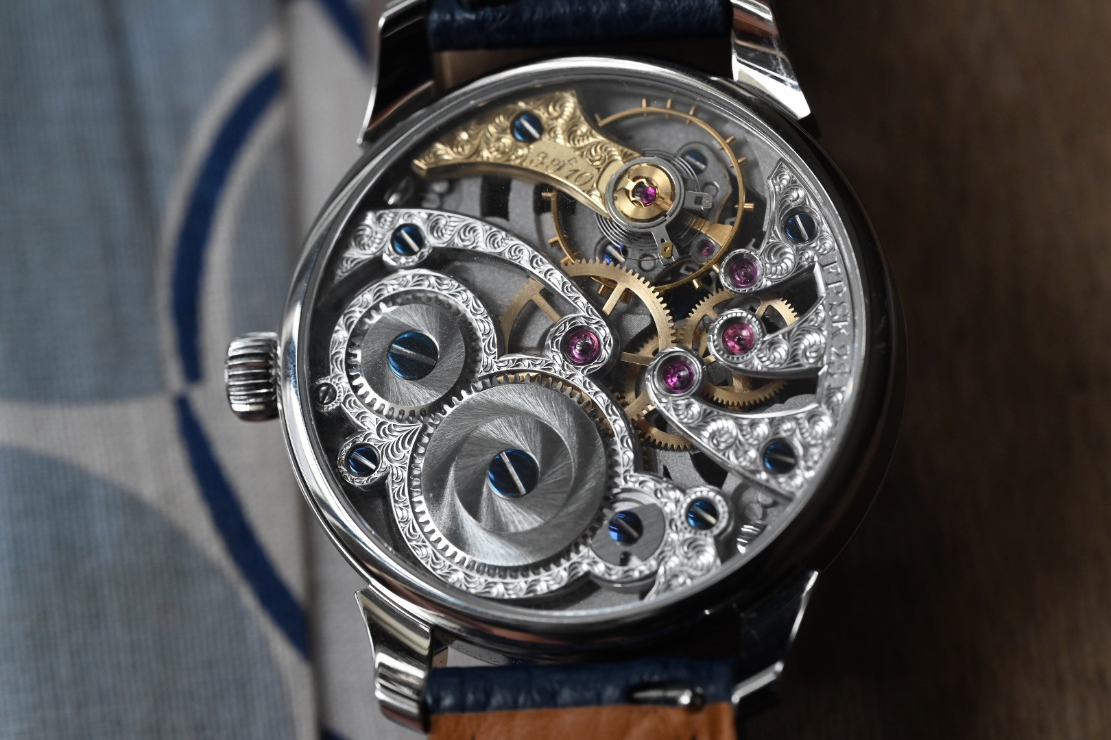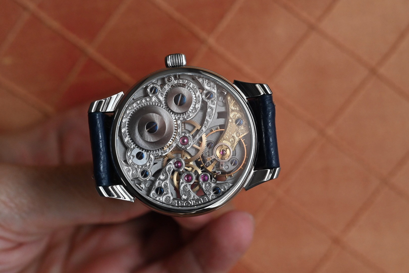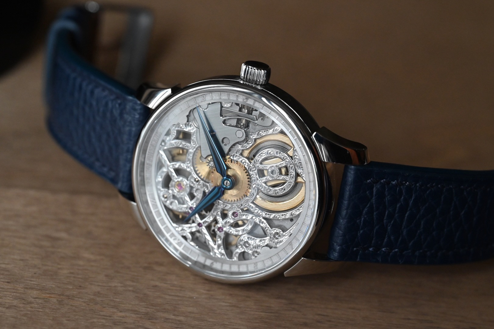 Movement: Manual-winding, hand engraved balance cock and skeletonized bridges, 18’000 vib/h (2Hz)
