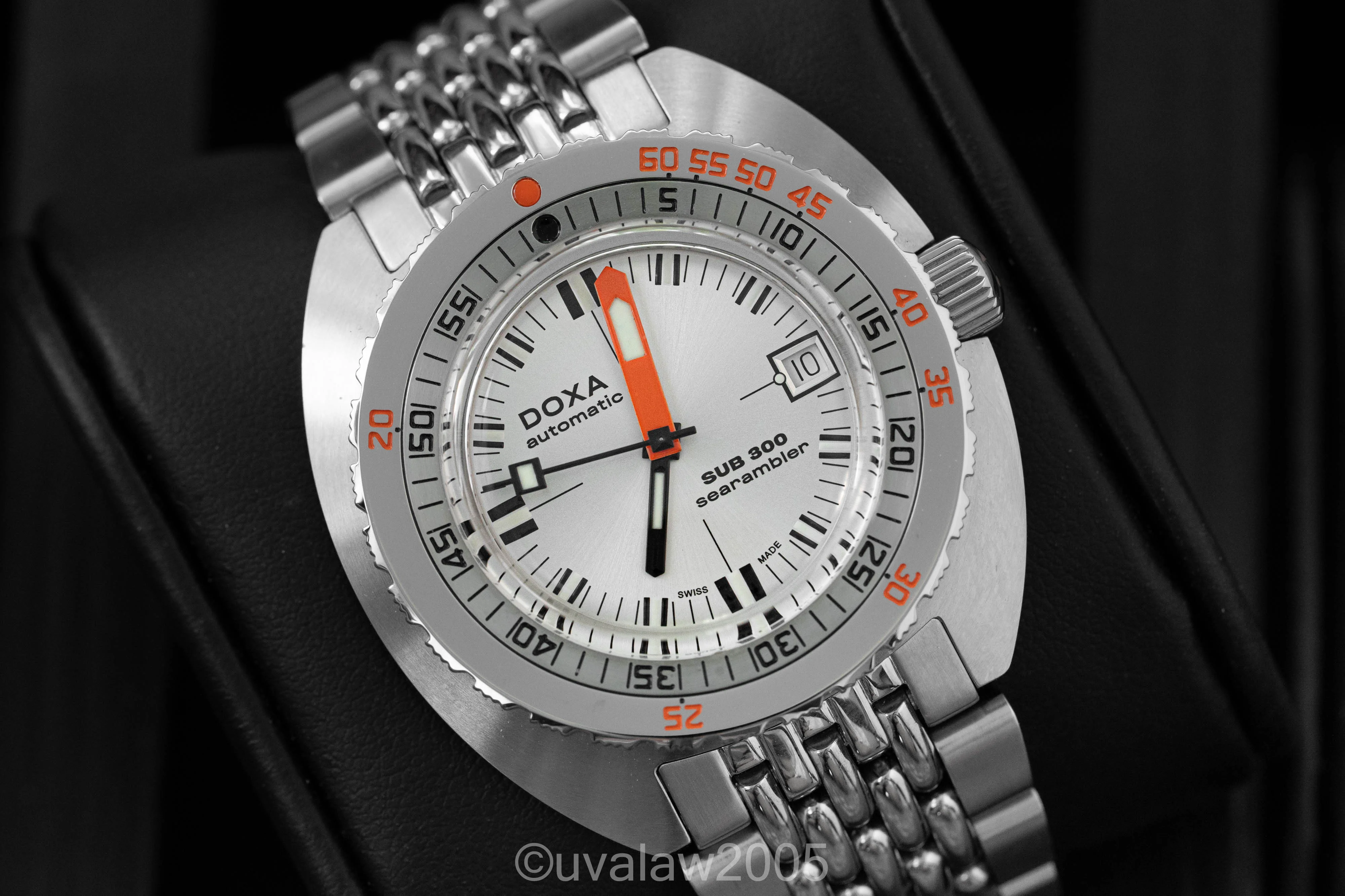 For sale is my silver dial DOXA SUB 300 Searambler in excellent condition with light surface wear. Comes with inner/outer box, manual, hang tag, stamped warranty card, original sales receipt, and all bracelet links. COSC movement running strong at +5s/day on my wrist.
