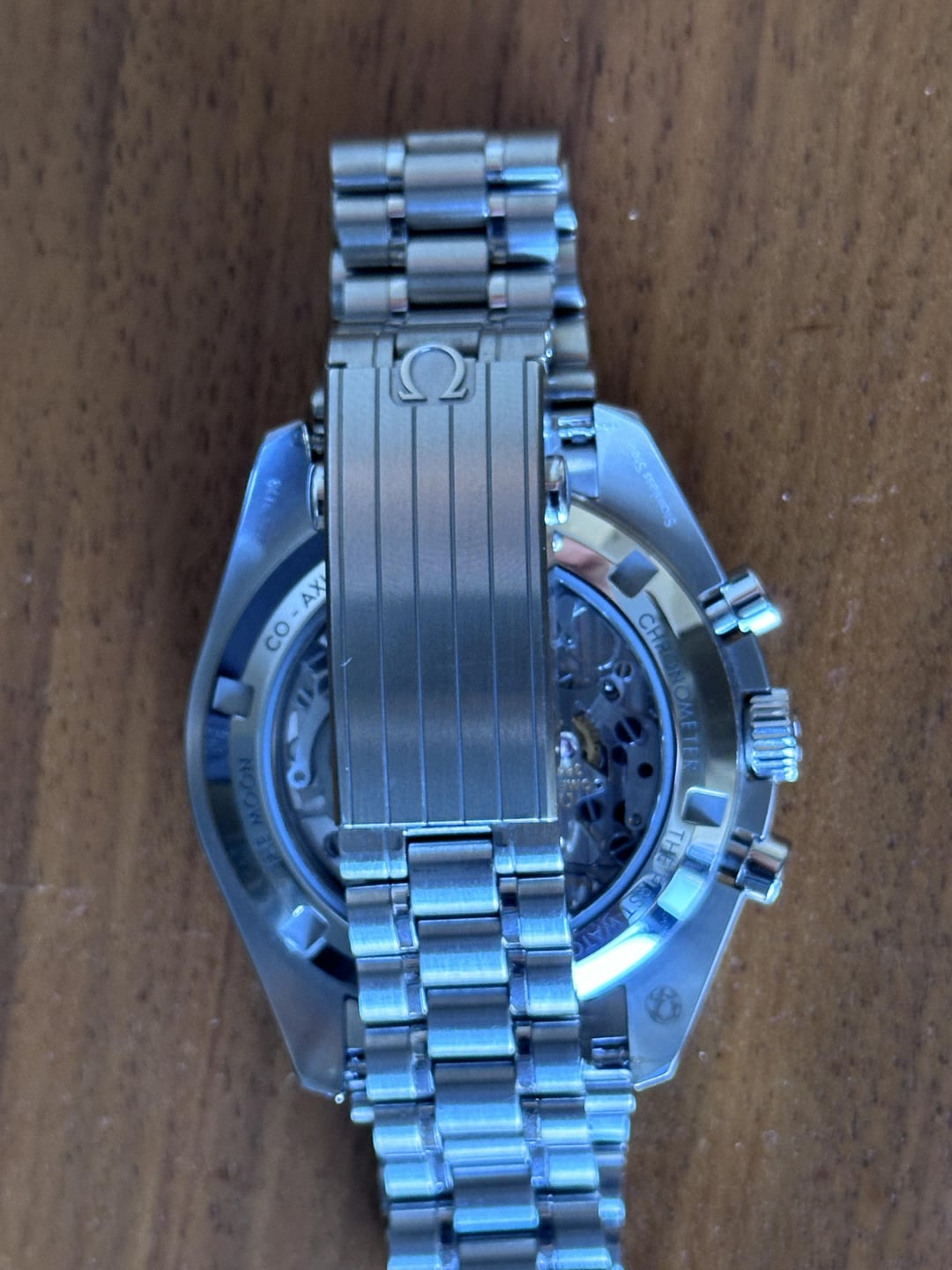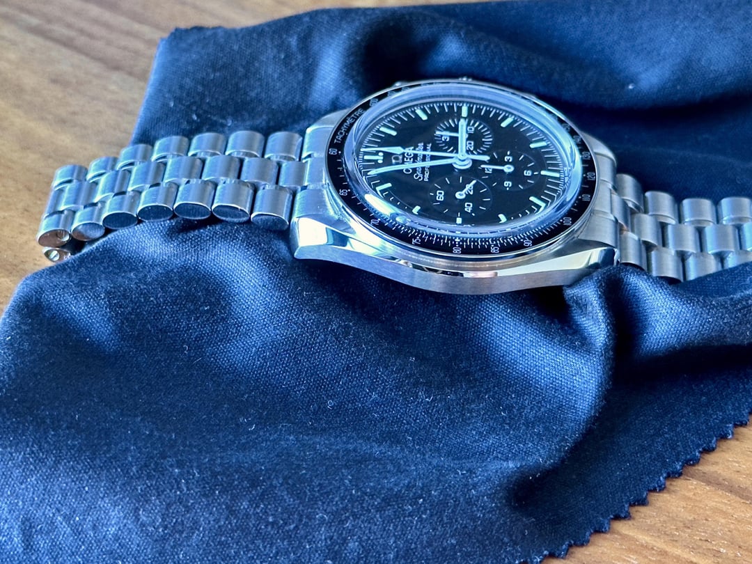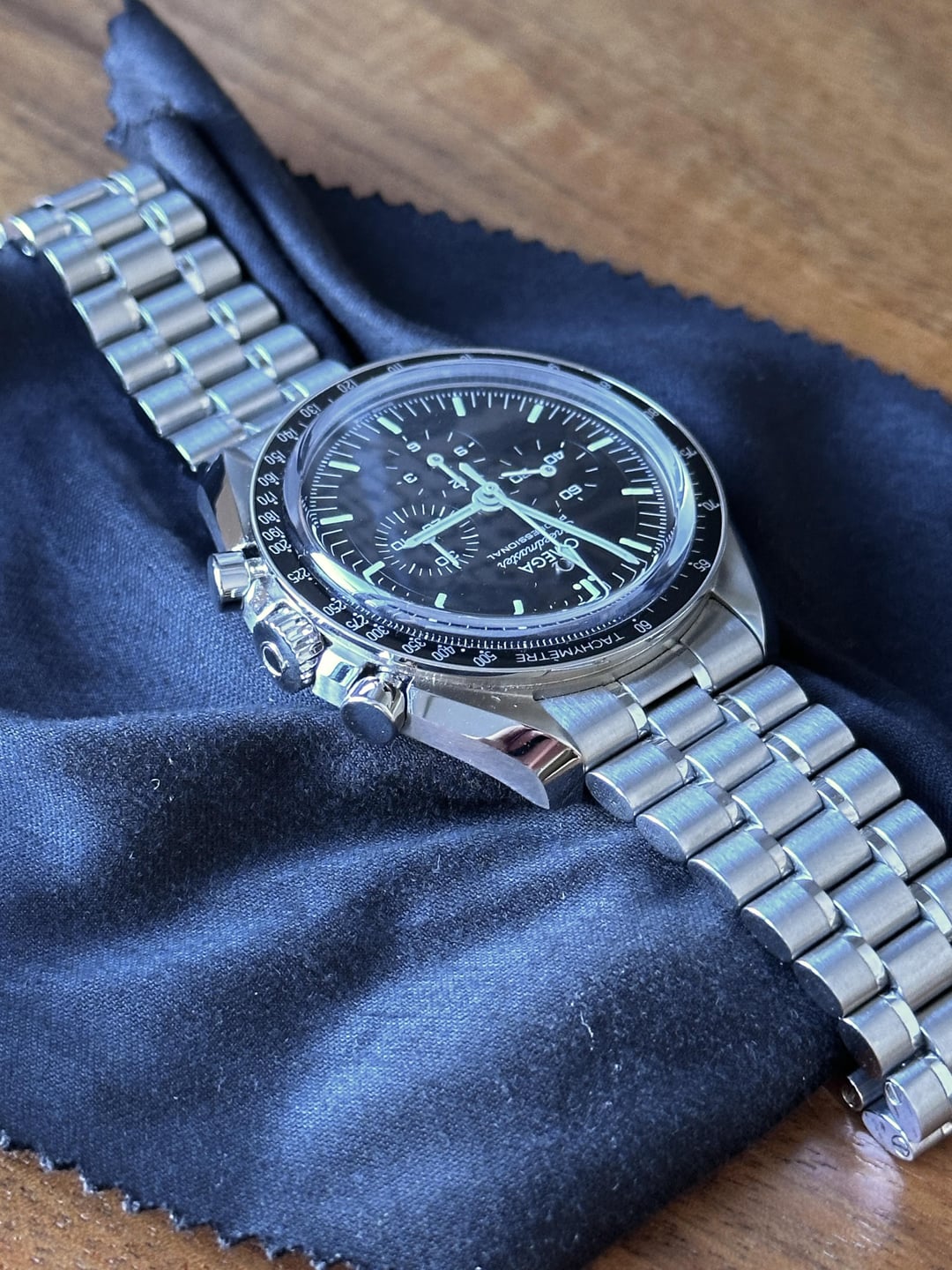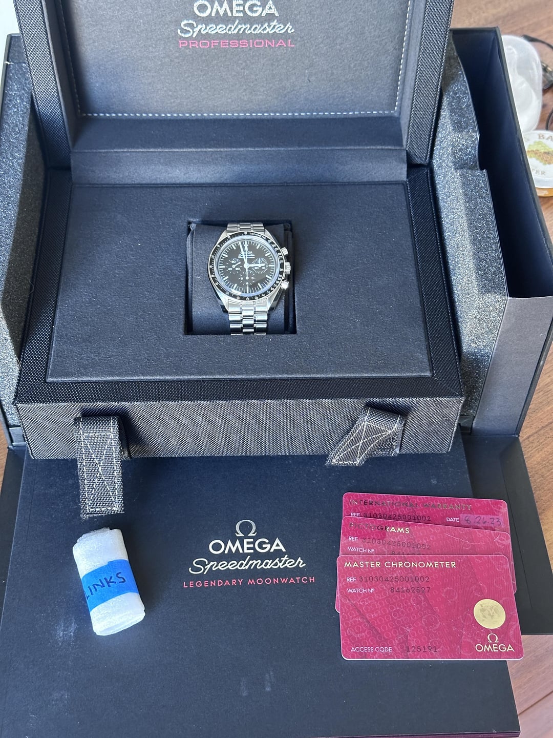 I picked this up from the original owner who purchased it in August of 2023 from an AD which means it has over 3 years left on the warranty. The watch really wasn't worn much. There are some scratches on the bracelet which can be seen in the photos. Otherwise it is in excellent condition. This is the sapphire sandwich version of the modern 3861 Speedmaster allowing you to take in the beauty of the co-axial movement. At 13.2 mm thick, it is ever so slightly thinner than the Hesilite version. This also has the updated clasp with the quick adjustment button. The watch comes with the box and all the accessories. [Album](https://imgur.com/a/speedmaster-3861-april-25-ZGua8JD) [Timestamp](https://imgur.com/sSXwrFK) It is yours for **$5400** Shipped CONUS. I can take bank wire, Venmo, Zelle, Paypal F&F or G&S+3%. No Trade offers, please. The new Speedy has slightly different proportions from the previous models. Here are the specs: * **Reference** 310.30.42.50.01.002 * **Between the lugs** 20 mm * **Lug-to-Lug** 47.5 mm * **Thickness** 13.2mm * **Case Diameter** 42 mm * **Cystal** Domed, scratch‑resistant sapphire crystal with anti‑reflective treatment inside * **Water** Resistance 50 meters * **Total** Weight 138 g * **Caliber** Omega 3861 Chronometer Manual Wind * **Power** Reserve 50 Hours Read more on the Omega Website [Here](https://www.omegawatches.com/en-us/watch-omega-speedmaster-moonwatch-professional-co-axial-master-chronometer-chronograph-42-mm-31030425001002)