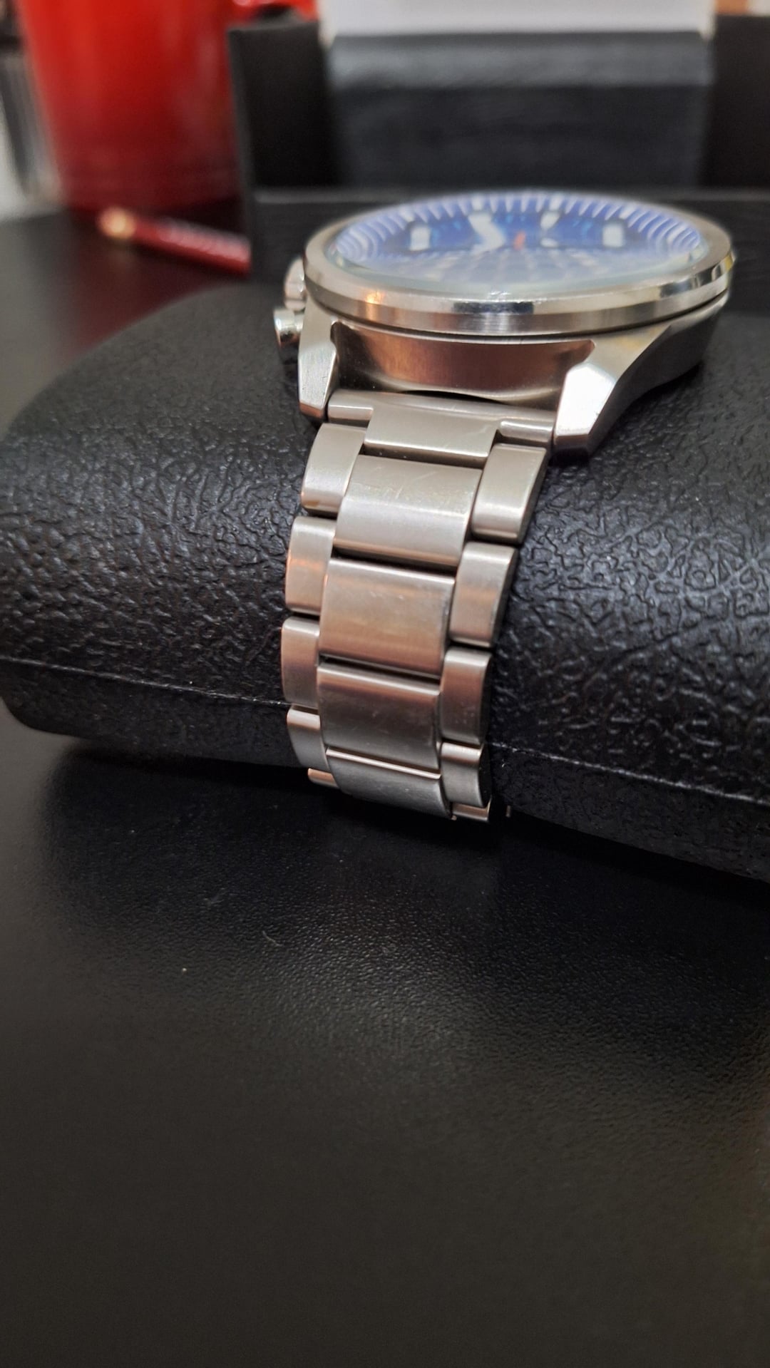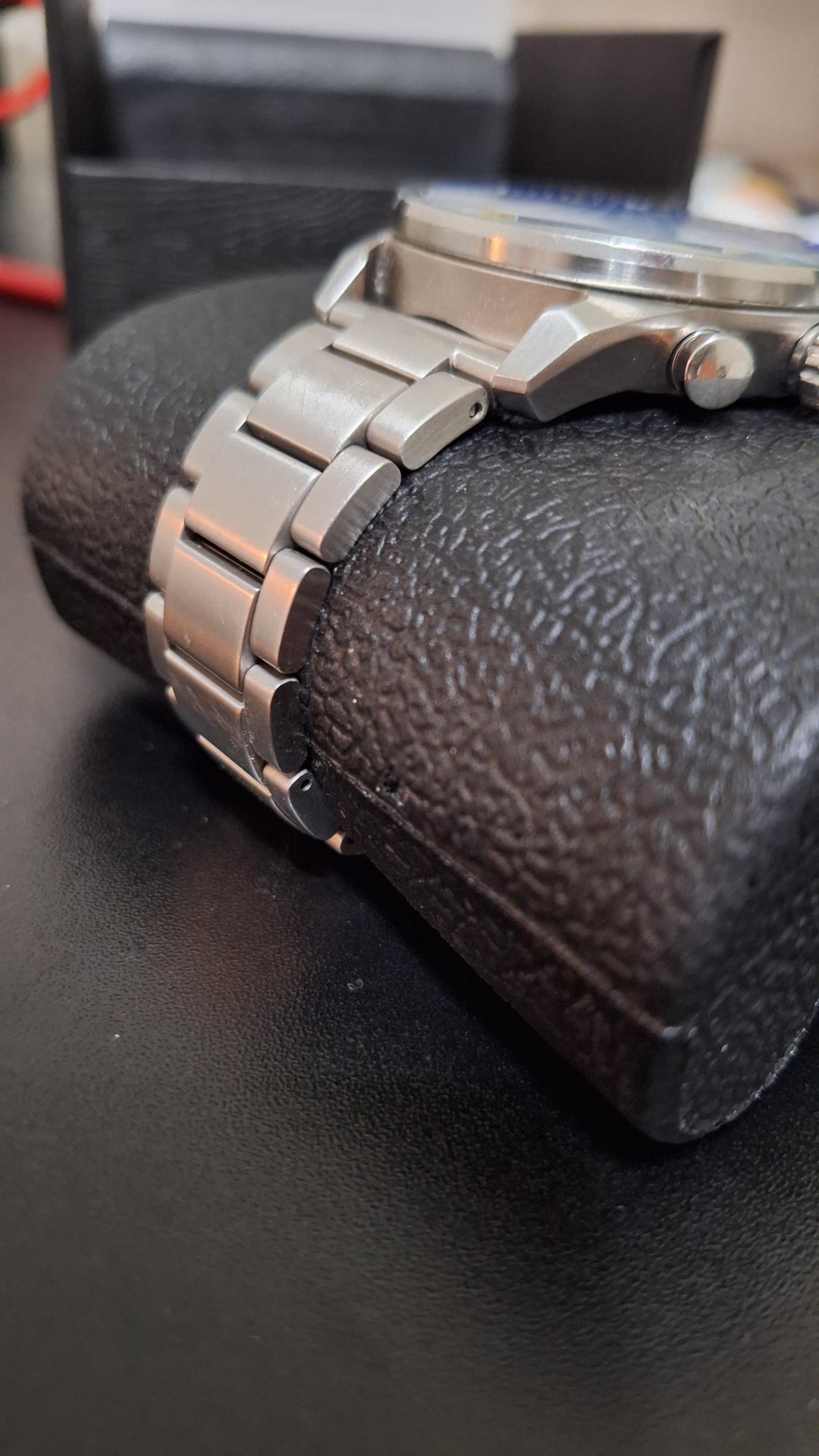 Comes with original box and tags. 45mm case diameter. Minor scuffs and scratches on bracelet. One link was removed for sizing. Link will be included with the watch.