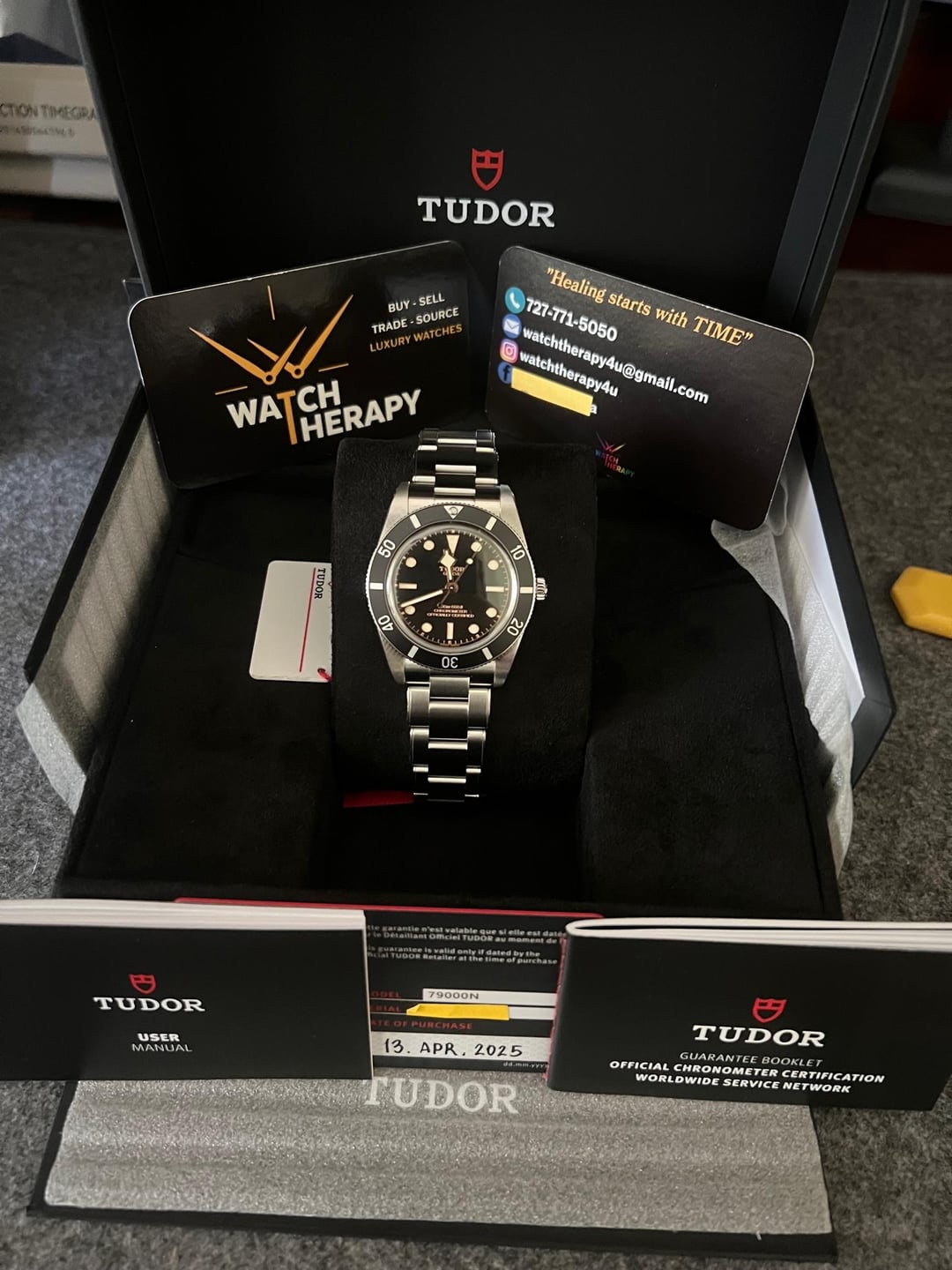 **F/S: New Tudor Black Bay 54 37mm 4/25 Ref. 79000N** **Shipping from Florida, No Surprise Tariffs!!** **Specs:** \* Beautiful black domed dial \* Self-winding \* Size 37 SS case w/SS bezel and aluminum bezel \* Three-link SS bracelet \* 200M Water Resistance \* 70-hour power reserve \* MT5400 (COSC) movement **Includes**: Warranty card 4/25, double boxed, booklets and tag. **Condition:** 10/10, unworn, unsized **Price: $3,350.00** [**+**]() **Insured shipping to your local FedEx for pick-up in Con US**. I am also open to a face-to-face public transaction in or around the Tampa Florida Region, within reason. I have many strong and viable references within Reddit and from Buy/Sell/Trade Watch Facebook groups. Always willing to jump on a call or meeting link to show you the watch. Thank you and please reach out if you have any questions or concerns. Florida residents may be subject to sales tax w/o a valid reseller cert. ***No Trades, TY*** **Location**: Tampa Florida **Payment:** Zelle or Wire Timestamp: [https://imgur.com/a/wotNYTa](https://imgur.com/a/wotNYTa) FB: Watch Therapy Timepieces IG: [@watchtherapy4u](https://www.reddit.com/u/watchtherapy4u/)