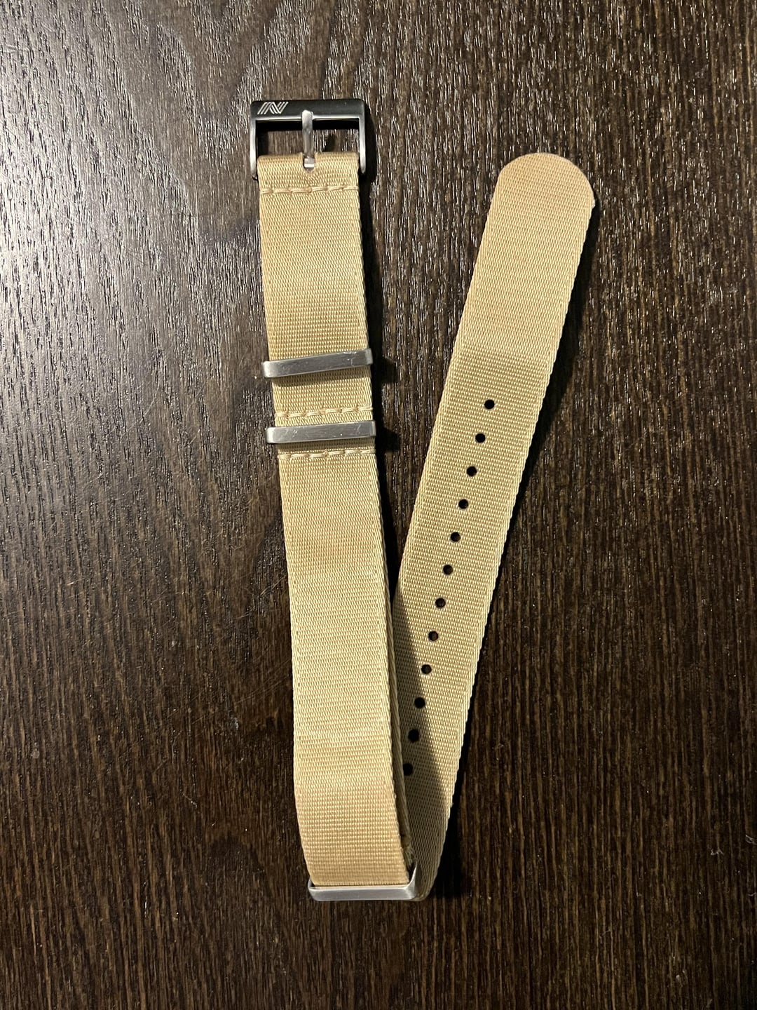 Hello, I’m selling this beige nato strap that resembles seatbelt like material with a sheen to it. It didn’t fit my 6.5 inch wrist well. I wore it for a few weeks and when it broke in it became too loose for me. It’s in good/clean condition, the buckles have a few small scratches. $35 shipped to you. PayPal G&S payment only. Thank you.