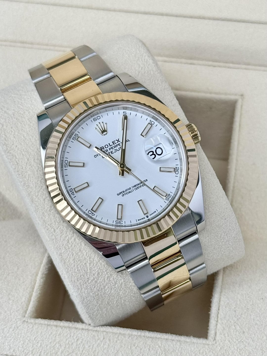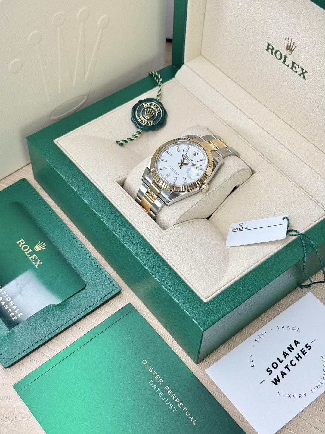 Selling this beautiful 41mm two-tone Rolex DateJust reference 126333 with the more desirable fluted bezel, oyster bracelet, and white dial. **This DateJust is in great condition**. **It** **comes as a full set**, including the Rolex green box, outer box, booklet, warranty booklet, leather wallet, warranty card dated 2022, the serialized hangtag, and the Rolex hangtag. **Photos:** * [Album](https://imgur.com/a/126333-apeil2025-Kr34P6K) * [Timestamp](https://i.imgur.com/D6dZNBW.jpeg) * [More on my Instagram @SolanaWatches](http://find%20me%20on%20Instagram%20@SolanaWatches) **Price is $13,000 delivered** in the CONUS. **I am a full-time watch dealer, and I have completed many transactions here.** I can provide additional references upon request. **Feel free to contact me** via PM here so we can exchange numbers and get on the phone or do a video call. You can also [find me on Instagram @SolanaWatches](https://www.instagram.com/solanawatches/). _Private showroom located in San Diego, CA. Reach out to schedule an appointment._ _All my watches are guaranteed 100% authentic, and I will stand by their authenticity._ _California buyers without a seller’s permit are subject to sales tax._
