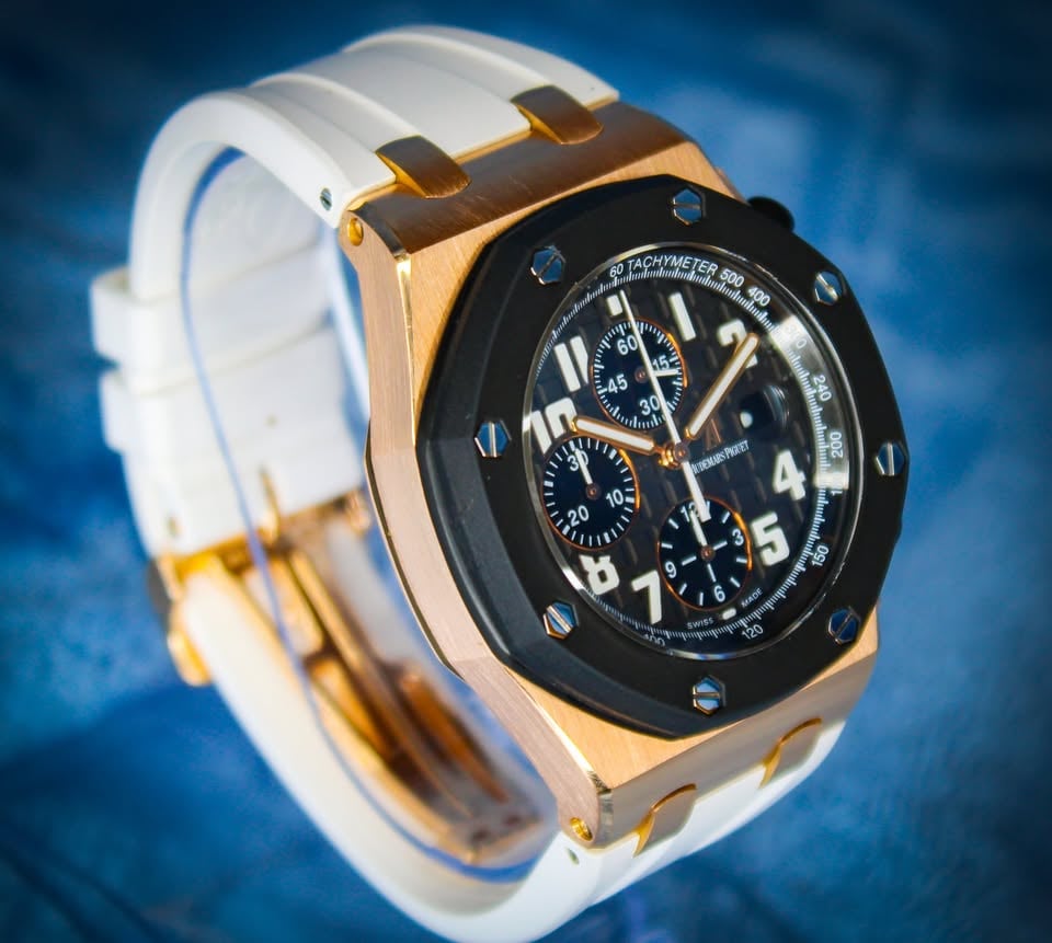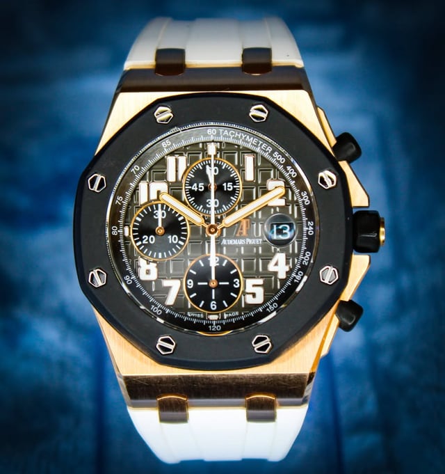 Audemars Piguet Royal Oak Offshore Chronograph 25940OK.OOD002CA.02 A stunning Rose Gold edition of the 42 ROO collection. Very rare to find this variation with the gold trim sub dials and the rubber clad bezel in such good condition. Slight marks on the case and clasp, please see pictures for details. I use a high-res macro lens for photographs that picks up marks and imperfections not visible to the eye. Sale includes original inner and outer boxes along with AP archive papers. Happy to answer questions. I’m very customer service focused and strive for 100% positive transactions each and every time. I ship fully insured overnight to the FedEx location nearest your address with hold for pickup. I am also open to meeting in person. Price: $26,500 @IslandTimeLuxury Cape Coral FL