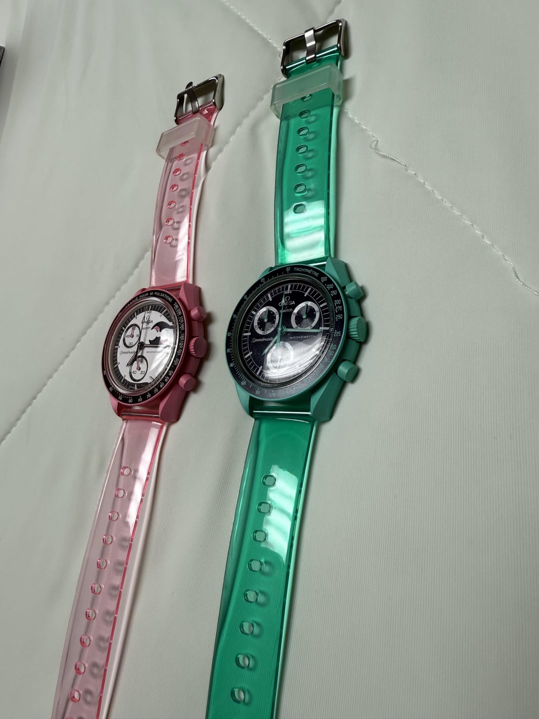 Up for sale are two Moonswatches. Mission to Pink Moonphase and Mission to Earth Polar Lights. Selling as a set only. Used/very good condition. Factory straps are new/unworn. Comes with Moonswatch factory white and black rubber straps and matching color Jelly clear straps. $600 shipped for everything pictured. CONUS sale only.
