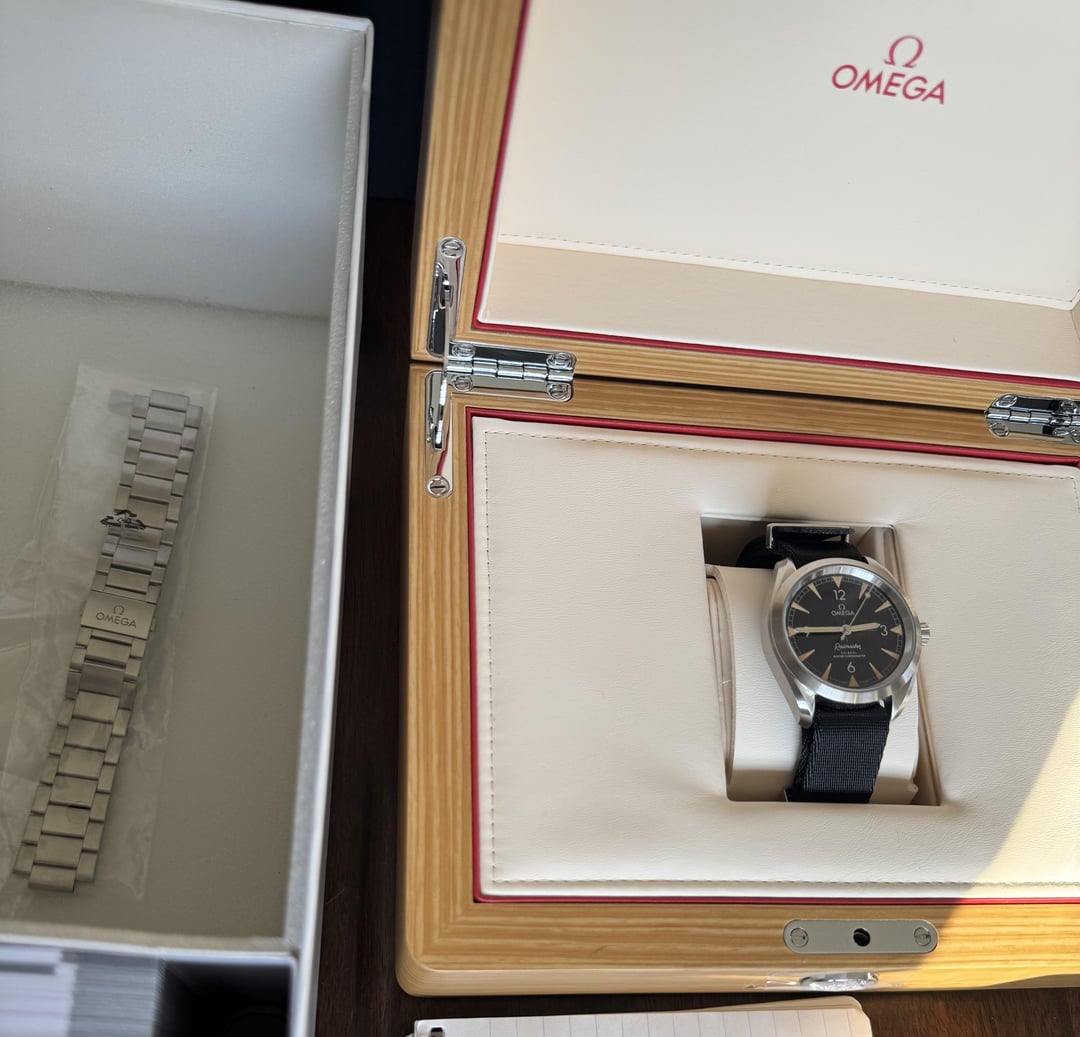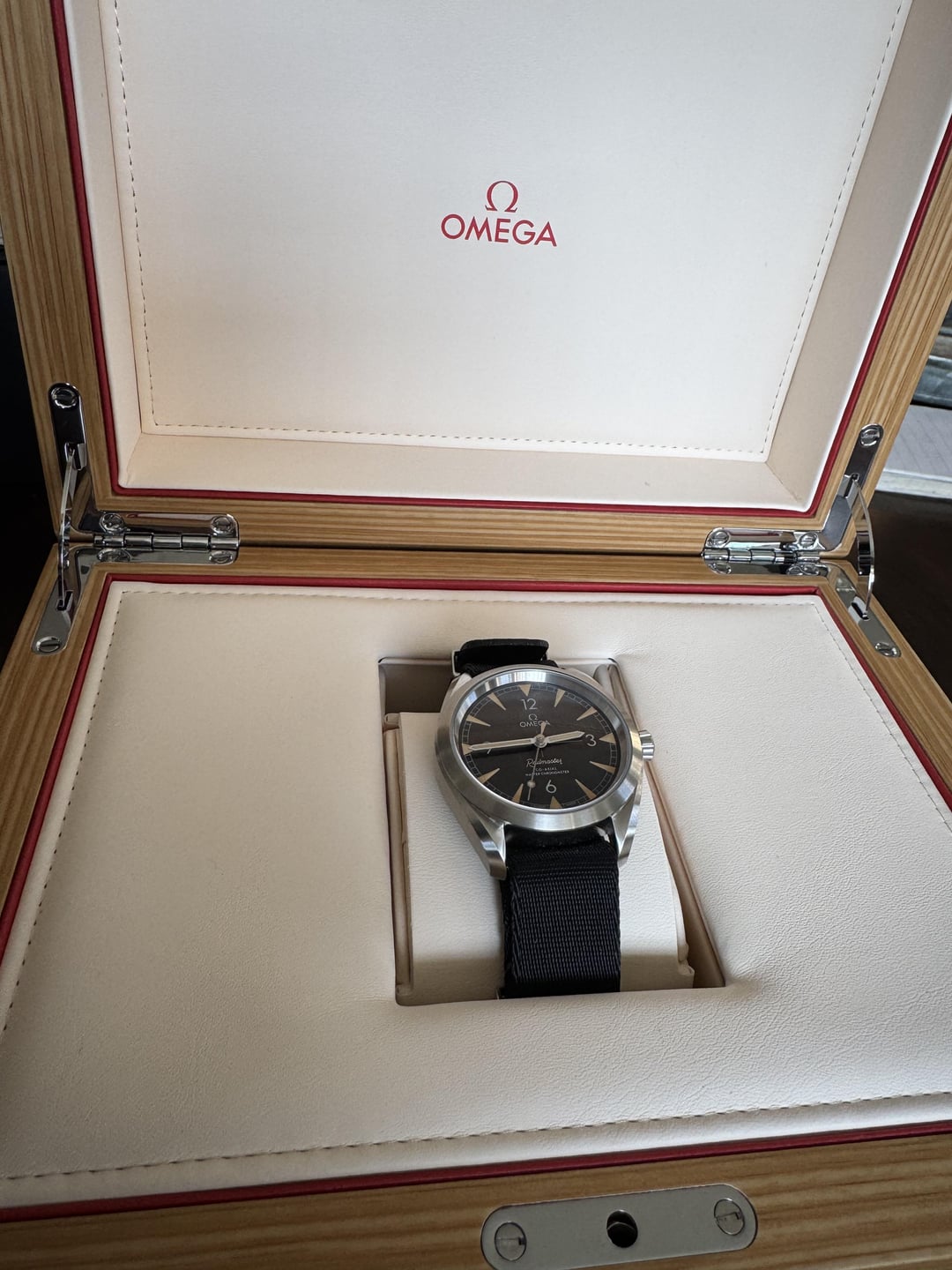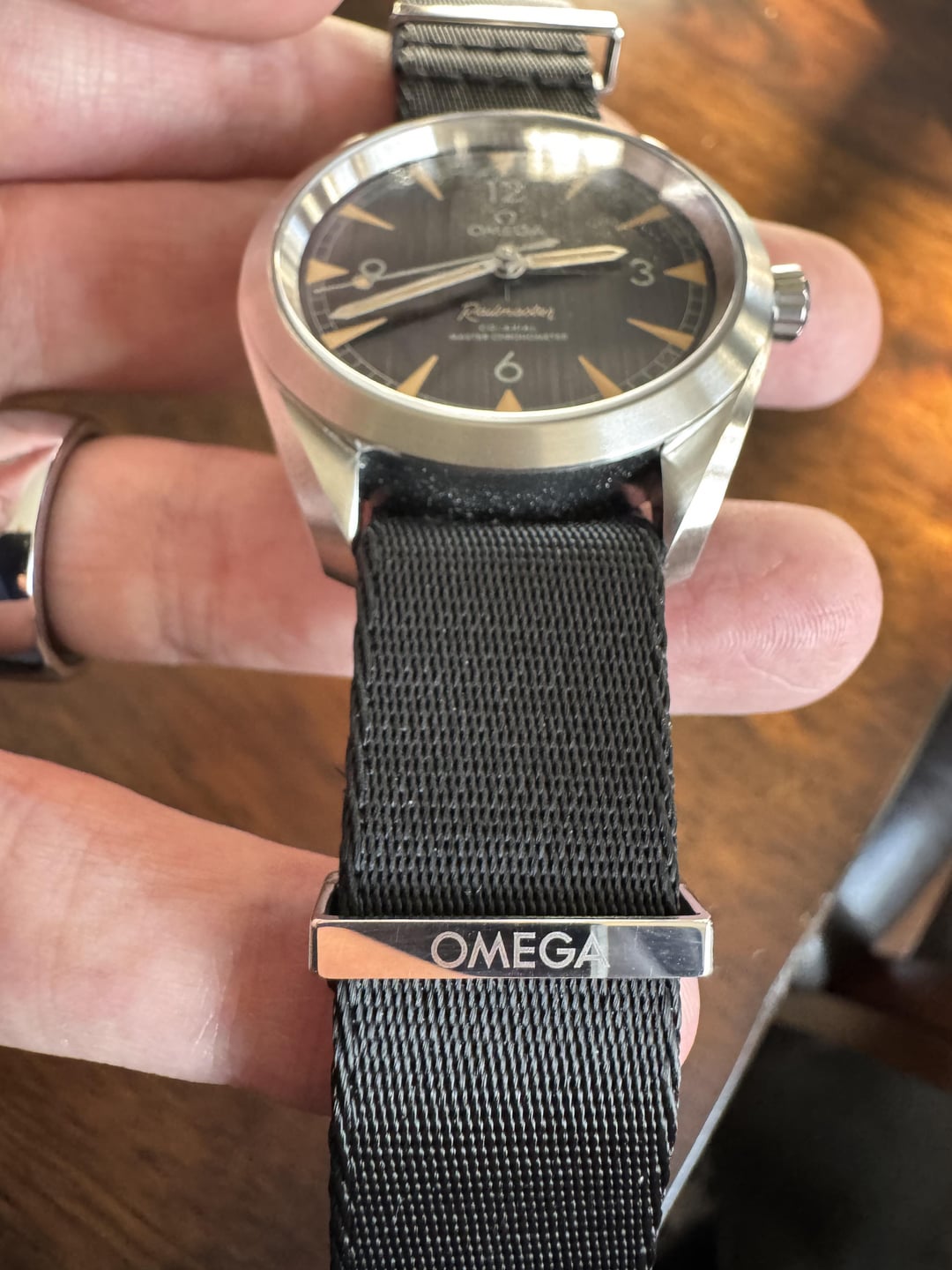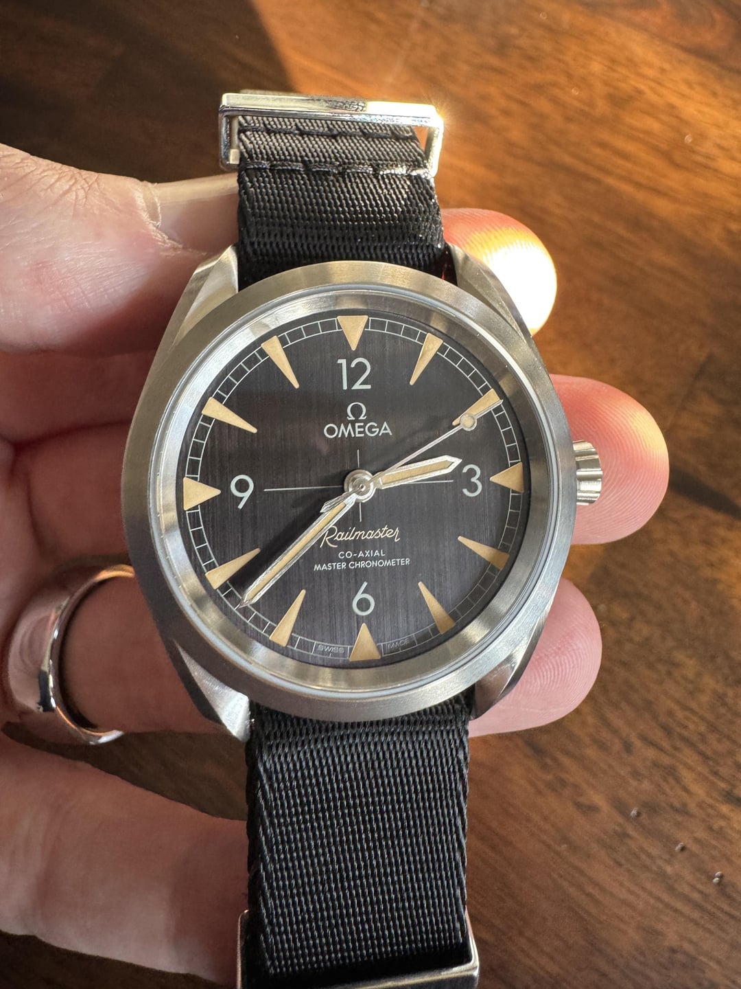 Up for grabs is an Omega Seamaster Railmaster with a black dial, in excellent condition, complete with a full Jomashop kit. • Condition: Excellent • Includes: Full Jomashop kit (box, papers), OEM bracelet, currently on Omega NATO strap • Price: $2,999 shipped CONUS • Payment: Zelle preferred Specifications: • Reference: 220.10.40.20.01.001 • Case: 40mm diameter, 12.7mm thick, 47mm lug-to-lug; stainless steel; screw-down crown • Movement: Omega Co-Axial Master Chronometer Calibre 8806, 55-hour power reserve • Water Resistance: 150m • Crystal: Domed sapphire with AR coating • Bracelet: Stainless steel with NAIAD LOCK caseback • Dial: Vertically brushed black, vintage Super-LumiNova, beige “Railmaster” text • Features: Anti-magnetic up to 15,000 gauss, METAS certified For more details, refer to the Omega website: omegawatches.com